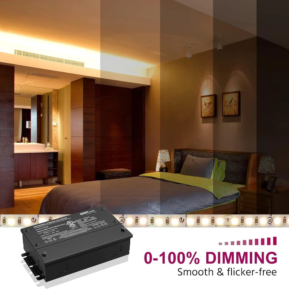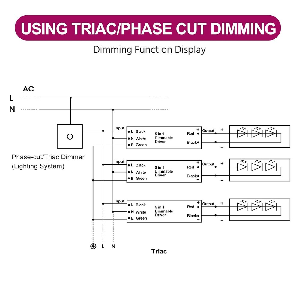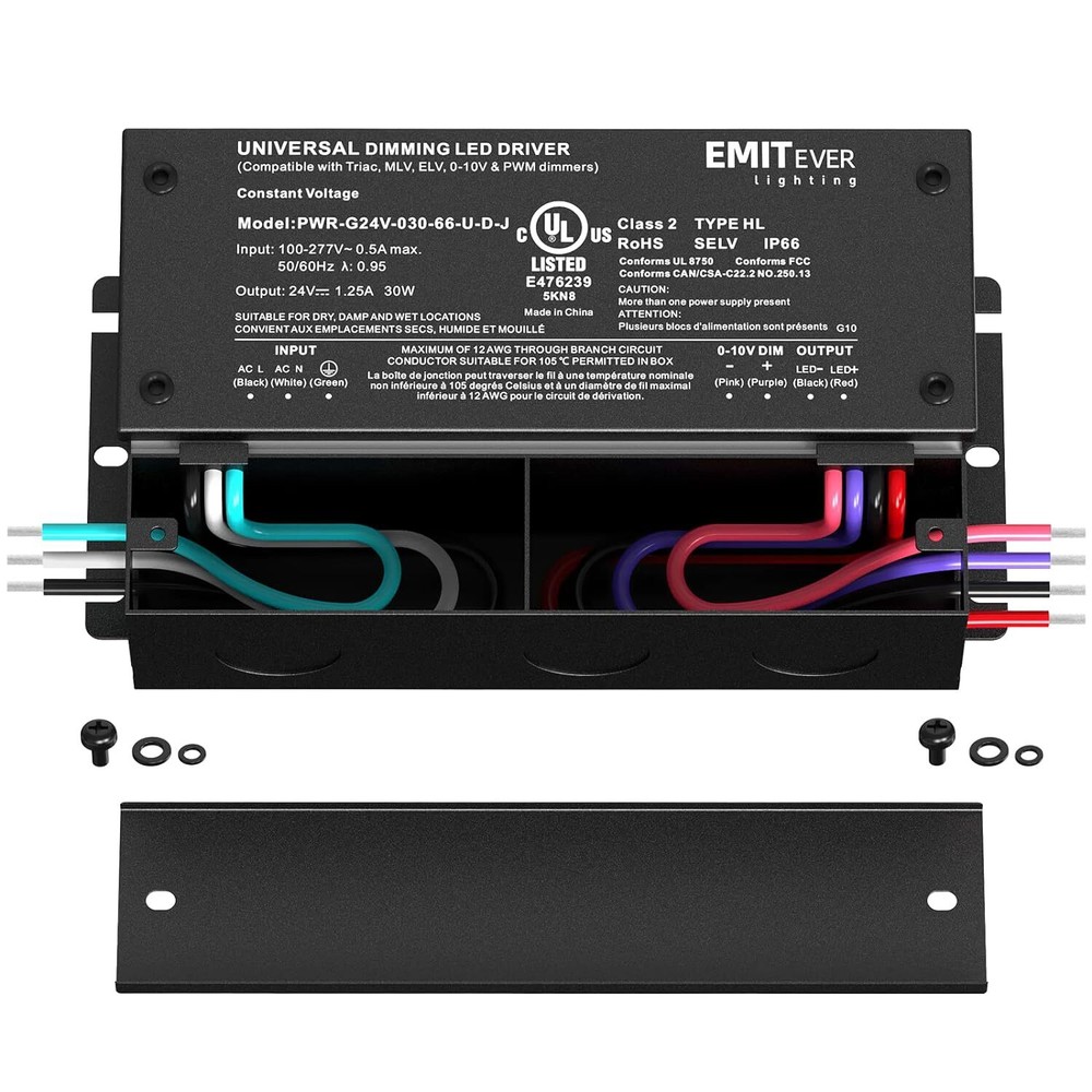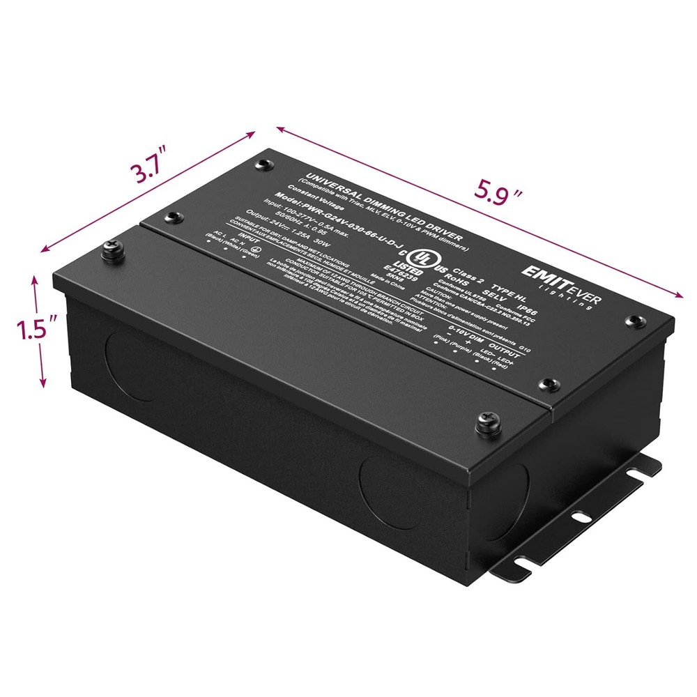 30W Dimmable LED Driver, 24V Triac Dimmable Power Supply, AC to DC Transformer for LED Light, Compatible with Lutron and Leviton Dimmer, Waterproof IP67 and UL Listed, Class 2 - 24V 30W Hardware Power Power Source Corded Electric Product Dimensions 3.7"D x 5.9"W x 1.5"H Mounting Type Surface Mount Current Rating 1.25 Amps 5-in-1 Forward and Reverse Phase Dimming: ELV / MLV / TRIAC / 0-10V / 1-10V / 10V PWM / Potentiometer.Versatile driver for most high-performance dimming applications: The Adaptive Pro 5-in-1 dimmable Class 2 drivers are designed to operate with any standard MLV / ELV / Incandescent TRIAC (forward phase) dimmer switch or can also be used with secondary side controls systems. Used commonly with Lutron and Leviton receivers and controls for secondary side dimming. Premium Commercial Construction: Encased in a low profile aluminum enclosure that includes knockouts for easy installation in any low voltage application. BUILT-IN PROTECTION: Standard built-in protections include short-circuit, over-load, and over-temperature protection SPECIFICATIONS: cUL us Listed, Class 2, Class P, Type HL, FCC compliant, damp location rated. Free air convection cooling within low profile compact aluminum housing (only 1.5-inch tall). Mounting foot at both ends allows for screw down upon flat surface for complete installation