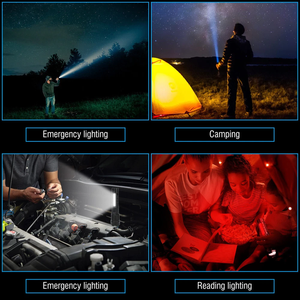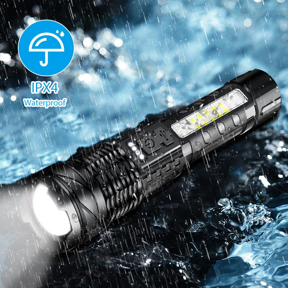 About this item 【Super Bright Flashlight】:The super bright handheld flashlight comes with 7 light modes, and COB light is designed on the side. Built-in 10 LEDs white light, 4 LEDs red light and 4 LEDs blue light, the front light can change 3 light modes and the COB side light can change 4 light modes. and very suitable for home, camping, hiking, outdoor or emergency situations. Etc 【Flashlight to Adjust Light Distance】: The head of the flashlight is zoomable and used to adjust the lighting distance. When the flashlight head is not extended, the lighting area is large and the lighting distance is approximately 3300 feet. When the flashlight head is extended, the lighting area becomes smaller, but the lighting distance is approximately 3900 feet. Can be used to view the status of areas further away. 【Power Display & 5-12 Hours Long Lasting Illumination】: The flashlight has a display on the side to show you how much power of the flashlight during using, the package includes a charging cable for you and the charging port is also designed with a waterproof rubber cover. The runtime of the flashlight is up to 12 hours in low work mode and 5-7 hours in a high work mode. 【Easy to Carry】: Led flashlight is equipped with lanyard and flashlight pouches, which can be hung on the side of the backpack or put into the backpack for easy carrying.flashlights also come with removable pocket clip ,Easily attach to your pocket , hat or belt. 【Waterproof for Heavy Rain Weather】: The Handheld flashlight is waterproof,this waterproof flashlight non-slip, shockproof, waterproof, rainproof, dustproof, can be used in camping, hiking and others Rain, snow or other outdoor emergency situations.
