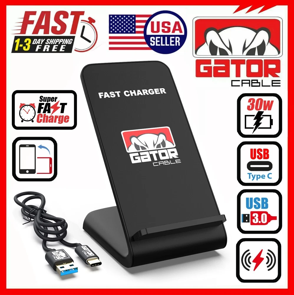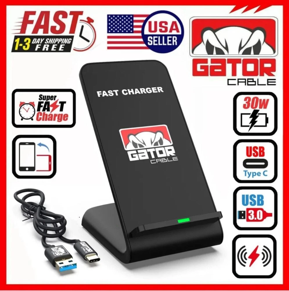 Gator Cable Qi Wireless 30W Super Fast Charger Stand/Dock USB-C 3.0 Charger Cable 3 FT Universal Compatibility with Qi Wireless Charger Phones With Two High Efficiency Transfer Charger Coils Charger Color: Black Specifications : Gator Cable Wireless 30W Super Fast Charger Stand Place a Qi-Enabled phone or device equipped with a Qi compatible cover on it. Features a power efficient idle mode to avoid overcharging and energy waste. Friendly LED indicator light to let you know when its charging. 2 high efficiency charger coils on charger. 30W Super Fast Wireless Charger Dock Input: 12V/3.0A Output: 30W Charger Dimensions: 4.6 in x 2.76 in x 3.6 in (H x W x D) Compatibility: Compatible with any Qi enabled phone or device. Compatible with: iPhone 8, 8 Plus, SE, X, XR, XS, XS Max 11, 11 Pro, 11 Pro Max, 12, 12 Pro, 12 Pro Max, 12 Mini 13, 13 Pro, 13 Pro Max, 13 Mini, 14, 14 Plus, 14 Pro, 14 Pro Max, 15, 15 Plus, 15 Pro, 15 Pro Max Samsung Galaxy S6, S7, S8, S9, S10, S20, S21, S22, S23, S24 Samsung Note 5, Note 8, Note 9, Note 10, Note 11 LG G2 G3 G4 G5 G6 G7 G8 G9 Moto Droid Turbo, Moto Droid Maxx/Droid Mini Nexus 4 5 6 7 8 Nokia Lumia 1020, 920, 928 HTC Droid DNA, HTC RZound Blackberry Z3 Pentax WG-III Camera Any and All Qi Compatible Devices or Equipment Included in Package: 1 x Gator Cable Qi Wireless Charging Stand 1 x USB-C 3.0 Cable 3FT We Offer The Lowest Prices On eBay for OPTIMUM Quality Cables + Free Shipping On All USA Orders! BUY 4 OR MORE GATOR CABLES, GET FREE U.S. PRIORITY MAIL SHIPPING! ALL ORDERS ARE SHIPPED OUT WITHIN 1 TO 8 HOURS! Strong-Rugged-Durable Heavy Duty Wireless Charger Stands/Pads and Cables Premium Quality Wireless Pads & Cables Ultimate Performance Great Value CLICK ON OUR eBay STORE