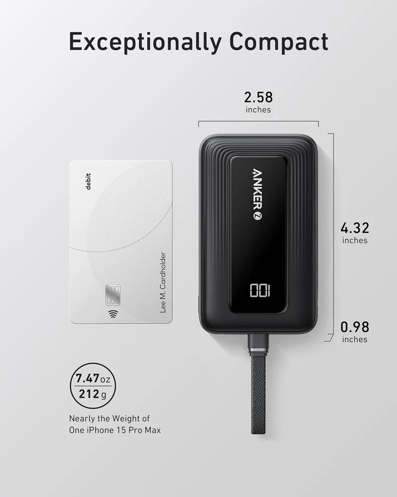 Speedy 30W Charging: Experience the cutting-edge speed of 30W fast charging technology that propels your iPhone 15 from 0 to 57% battery in just 30 minutes. Ready for Endless Use: Crafted for durability, the 5.4-inch built-in USB-C cable is tested to endure over 10,000 bends, ensuring it stands up to the rigors of everyday use. Mighty Compact Power: This compact and powerful 10,000mAh power bank provides up to 2 full charges for an iPhone 15 and 1.94 charges for a Samsung S24, making it ideal for travel. 30W Bi-Directional Charging: With two-way fast USB-C charging, enjoy up to 30W output and 20W input, ensuring your gadgets are quickly powered. (Note: Compatible with iPhone 16/15 Series, MacBook, Galaxy, iPad, Switch, Steam Deck, and more.) What You Get: Anker Zolo Power Bank (10K, 30W) with a 5.4-inch (13.7 cm) built-in USB-C cable. Product Description 1 About Anker Zolo 2 Stylishly Designed 3 Multi-charging 4 Two-Way Charging 5 Built-In Cable 1 Real-Time Protection 2 Digital Display 3 Durable Cable 4 Universally Compatible 1 Power for Gifting 2 Power for Adventure 3 Power for Work 4 Power for Everyday Anker 10000mAh Power Bank Comparison 2.0 Charges iPhone 15 4.03 Charges 2.0 Charges iPhone 14 Pro 4.21 Charges 1.94 Charges Samsung S24 3.79 Charges 0.76 Charges iPad Pro 1.68 Charges 4.32*2.58*0.98 in Size 4.72*2.90*1.24 in 0.47lb Weight 0.78lb iPhone 16/15,MacBook Compatible Devices iPhone 16/15,MacBook 2.0 Charges iPhone 15 2.0 Charges 2.0 Charges iPhone 14 Pro 2.0 Charges 1.94 Charges Samsung S24 1.94 Charges 0.76 Charges iPad Pro 0.76 Charges 4.32*2.58*0.98 in Size 4.32*2.58*0.98 in 0.47lb Weight 0.48lb iPhone 16/15,MacBook Compatible Devices iPhone 16/15,MacBook 2.0 Charges iPhone 15 4.03 Charges 2.0 Charges iPhone 14 Pro 4.21 Charges 1.94 Charges Samsung S24 3.79 Charges 0.76 Charges iPad Pro 1.68 Charges 4.32*2.58*0.98 in Size 4.72*2.90*1.24 in 0.47lb Weight 0.78lb iPhone 16/15,MacBook Compatible Devices iPhone 16/15,MacBook 2.0 Charges iPhone 15 1.9 Charges 2.0 Charges iPhone 14 Pro 1.9 Charges 1.94 Charges Samsung S24 1.8 Charges 0.76 Charges iPad Pro 1.2 Charges 4.32*2.58*0.98 in Size 6.01x 2.82 x 0.61in 0.47lb Weight 0.53lb iPhone 16/15,MacBook Compatible Devices iPhone/iPad, Samsung Anker 20000mAh Power Bank Anker 10000mAh Power Bank Anker 20000mAh Power Bank PowerCore Slim 10000 Model Number A1688 Output USB-C Cable / USB-C Port Output: 5V⎓3A / 9V⎓3A / 10V⎓2.25A / 12V⎓2.5A / 15V⎓2A / 20V⎓1.5A (30W Max) Note A single port can deliver up to 30W of power, while using multiple ports simultaneously provides a total output of 15W. FAQ-2 Q:Can it charge low-current devices like earphones? A:Yes, this power bank features a low-current charging mode.Simply double tap the power button to enter this mode to charge small electronic devices and double tap again to exit! FAQ-4 Q:How can I estimate the number of charges for my device? A:To estimate charges, use this formula: (Power Bank Capacity × 0.65) ÷ Device Battery Capacity. For example, an iPhone 15 with a 3,877mAh battery can receive about 1.67 charges from a 10,000mAh power bank (10,000mAh × 0.65 ÷ 3,877mAh). Total Capacity 10,000mAh Input USB-C Cable / USB-C Port Input: 5V⎓3A / 9V⎓2.22A / 12V⎓1.66A (20W Max) FAQ-1 Q:How long does it take to fully charge the power bank? A:The charging speed depends on whether the charger and cable can meet the power bank's requirements. Using a 20W fast charger, the power bank can be fully charged in approximately 2.5 hours. FAQ-3 Q:Does it support charging while discharging? A:Yes, the power bank supports pass-through charging with a max input and output of 5V/3A. Note that it does not support simultaneous charging and discharging for laptops. For longevity, avoid charging your phone while charging the power bank. FAQ-5 Q:Why is my power bank providing fewer charges than expected? A:Energy loss during charging, due to inefficiencies in the battery cells and circuitry, results in a 30% to 45% capacity reduction. Therefore, a fully charged Anker Zolo 10,000mAh Power Bank typically provides about 5,500mAh to 7,000mAh.