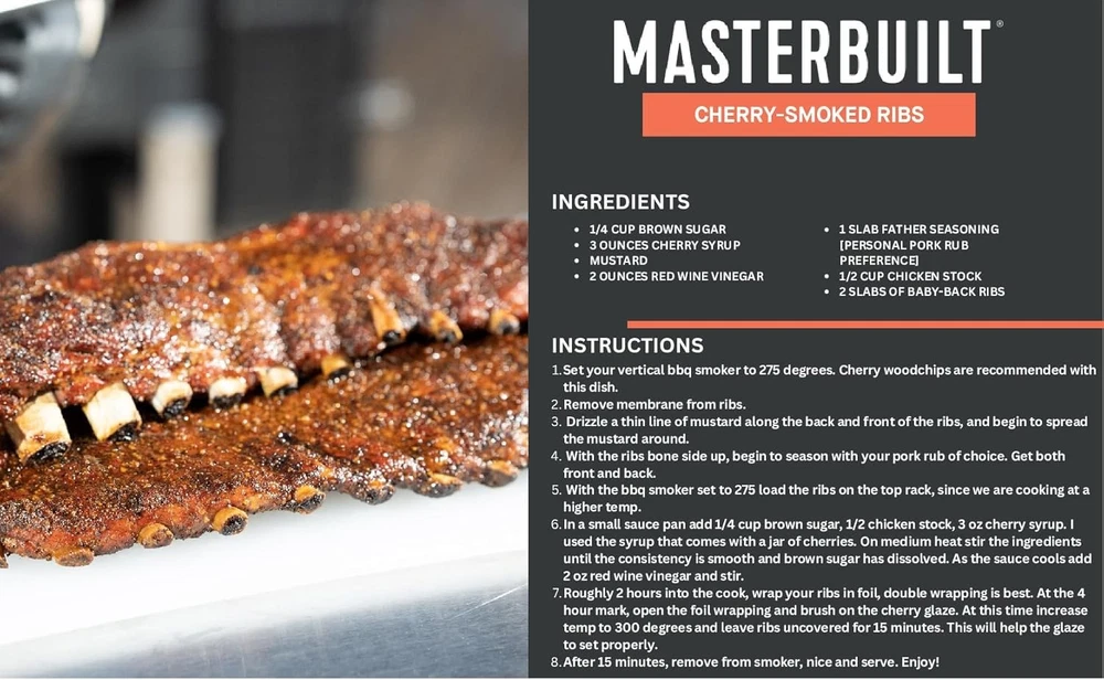 From the manufacturer SMOKE Low-and-slow smoking methods provide smoked meats with juicy, tender results. FLAVOR Infuse foods with rich, smoky flavor with the addition of wood chips. VERSATILITY From your favorite cuts of meats to flavorful veggies, discover endless options when it comes to smoking foods. PRODUCT FEATURES DIGITAL CONTROL BOARD Easily set your desired smoking temperature and time with the push of a button. PATENTED SIDE WOOD CHIP LOADER Add woodchips during your cook without losing smoke or heat. FOUR CHROME-COATED SMOKING RACKS Four chrome-coated smoking racks with 710 sq. inches of cooking space. ADJUSTABLE SMOKE DAMPER Control your smoke levels with the adjustable smoke damper. PRODUCT ACCESSORIES SMOKER COVER Protect your smoker from rain, sleet and snow all year long. (Model #MB20080924) SLOW SMOKER Perfect for BBQ smoking when longer smoke times and temperatures are ideal. (Model #MB20100112) RIB RACK Increase the capacity of your vertical smoker with the Masterbuilt Rib Rack. (Model #MB20090211) Product Description Achieve the perfect combination of juicy smoked meats and top-tier flavor with the Masterbuilt 30-inch Digital Electric Smoker. With innovative and easy-to-use features such as the digital control board, simply set your desired smoking temperature and time, and let the vertical smoker do the rest. The vertical design our smokers is not just about saving space; it's about maximizing flavor infusion. The heat and smoke rise naturally through the meat smoker’s cooking chamber ensuring optimal smoke flow for a superior end result. The patented side wood chip loader in this BBQ smoker allows for continually adding more tantalizing wood flavors without sacrificing the smoke inside during the cooking process. Forget the hassle of crafting delicious barbecue favorites for the whole family and let Masterbuilt help you master the art of outdoor smoking.