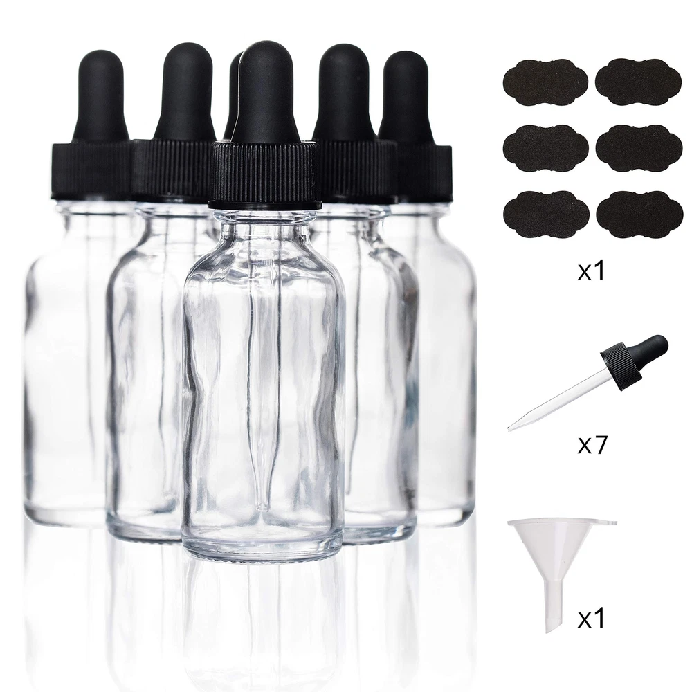 High Portability: Set of 12 clear glass dropper bottles, 1.25"Diam. x 4.58"H (with dropper inserted). Versatile Use: Ideal for travel, gym, car, or home use. Precision Glass Dropper: Facilitates precise dispensing of liquids, ideal for essential oils, serums, and laboratory chemicals. Premium Quality: Tight glass eye dropper prevents any leakage. Clear dropper bottle allows you to Identify liquids and looks great with any label. Thoughtful Customer Service: Please contact us if your are not happy with our product and service, or the bottles was broken during the transport, We could help you solve your problems. 6 - 30ml Clear Glass Bottle with Glass Eye Dropper Perfect for essential oils, perfume oils or other liquids Safe, secure and convenient packaging Perfect for travel, and conveniently fits in your purse