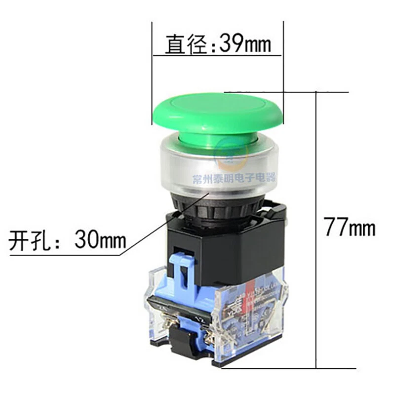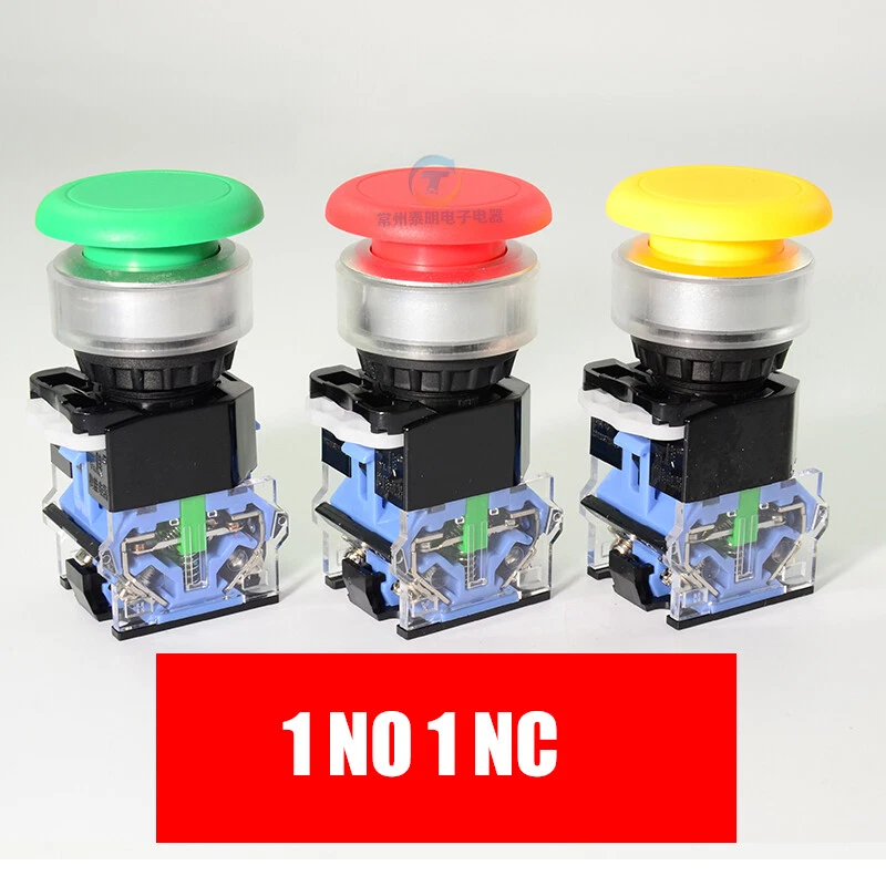 30mm Push Button Switch Momentary 1NO 1NC Mushroom Head Switches Red/Green/Yellow Product Information: 30mm Push Button Switch Momentary 1NO 1NC Mushroom Head Switches Suitable for Panel Mounting Hole Size: 30mm Color: Red/Green/Yellow Rated insulation voltage(Ui): 660V Operating structure: self-reset Contact: Silver Alloy Contact: 1 NO 1 NC Features: - Thermosetting material, good heat resistance, will only gradually carbonize even if it encounters an open flame, and will not burn, making it safer to use. - Adapting to more extreme use environments. Button function description: Momentary : press the switch, power on the load, release the finger, reset the button, power off the load Latching : press the switch, load power on, and then press the switch, load power off Description of contact switch: Normally open (NO): default state,Normally Open; The contacts close when pressed(Green means NO) Normally close(NC): default state, Normally Closed; Contacts open when pressed(Red means NC) P a ckage Including: According to your choice.