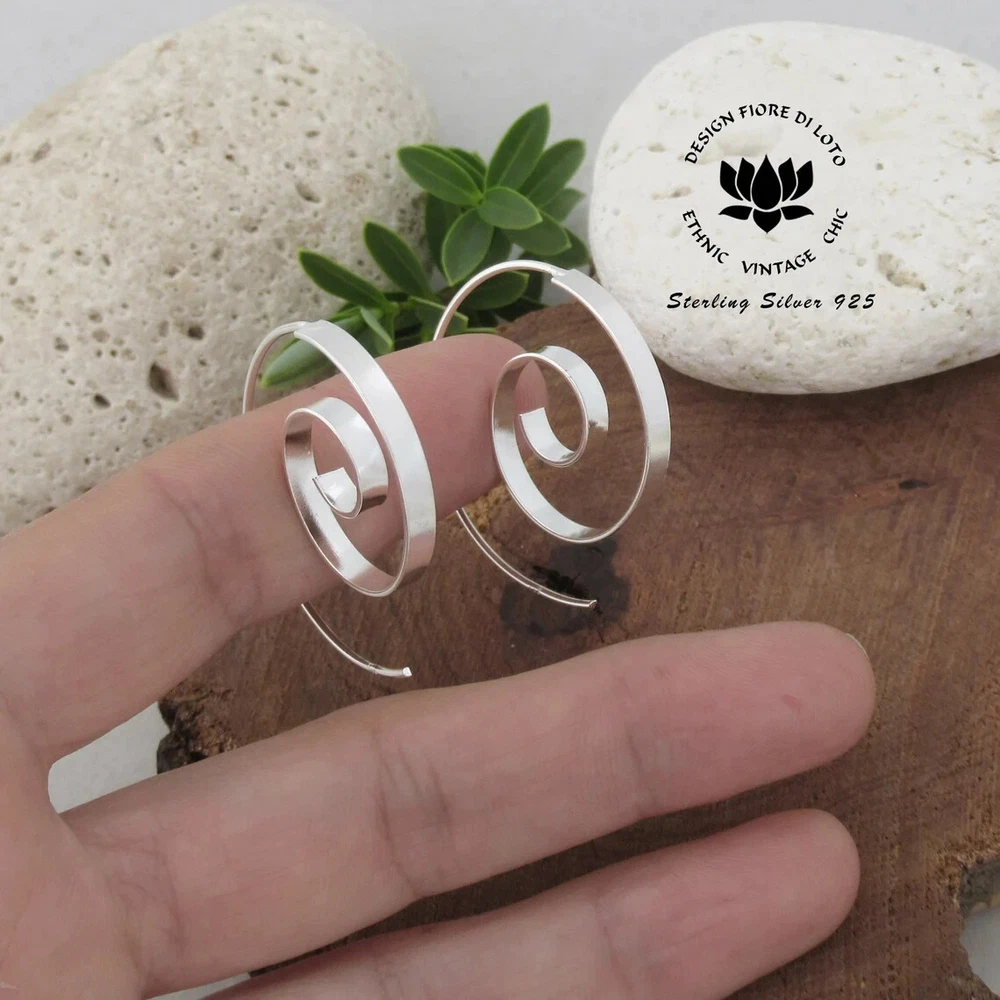 Open wire flat spiral threader earrings in sterling silver. Nickel FREE These large flat silver spiral earrings are on of our best selling earrings. Their tribal boho style makes them incredibly versatile for any occasion. They're also a great jewelry gift for your girlfriend, mom, friend, or anyone you want to show appreciation for. These Handmade 30mm hoop earrings are carefully made in 925 Sterling silver. Perfect simple spiral threader to wear every day with every outfit Buy them now! Dimensions: Diameter: 3cm Total weight approx: 3.9 grams. Delivery Information All items dispatched from the UK. Item will be carefully packaged in eco-packaging to safeguard it during delivery and our branded satin pouch ready as a gift. Standard Tracked 48 Shipping with Royal Mail or Yodel included FREE . Tracking number details will be sent after dispatch (which is usually within 1 working day of purchase. Weekends/festivities excluded). Faster shipping options also available for the UK. Worldwide shipping available with Royal Mail Tracked & Signed. Returns accepted within 14 days of receipt. At customers’ expense.