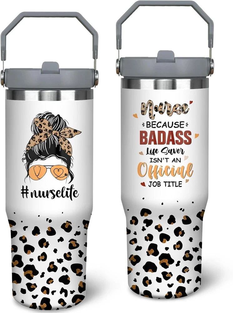 Premium Material Nurse Tumbler:Our nurse tumbler is made from 18/8 stainless steel which insure this nurse cup is not easy to rust, breakage. Besides, our 30oz nurse tumbler design with vacuum double wall. With its excellent thermal insulation properties our nurse cup can keep hot for 8 hours and cold for 16 hours, which allowing you to drink your favorite cold or hot drinks at any time. Convenience to Use and Carry:The unique flip-up straw design allows you to enjoy your favorite drinks anytime. And there is no need to worry about the straw being exposed to the air and getting contaminated. Combined with the screw-on lid it is 100% leak proof. Comfortable handle allows you to take it anywhere. Besides our nurse tumbler fits most car holder and very suitable for travel. Unique Nursing Element Design:Designed with a stylish nursing element printing, our nurse travel coffee mugs have a unique appearance and are available in a variety of styles. Sincerely sayings to express your thankfulness and appreciation for your best friend, bestie, girlfriend, wife, mom, sister. Let the noble nurses around you know how proud you are of them. Widely Usage Scenarios:Our nurse coffee mug is perfect for any indoor or outdoor place. The large capacity can meet your daily drinking needs, and the considerate handle is very easy to carry. Perfect for enjoying drinks at home, at the beach, at the lake, at the pool, in the office, at parties, RV trips, cabin trips, camping, hiking, picnics and BBQs Best Nurse Gifts for Women:Choose this unique nurse gift tumbler to express your gratitude and love for the important nurses in your life. our nurse water bottle is great as RN gifts for women, nursing gifts for new nurses, rn gifts for nurses, nursing student gifts, new nurse gifts , LPN gifts nurses. This unique nurse coffee mug makes a great gift chioce for a nurse friend, family member or lover