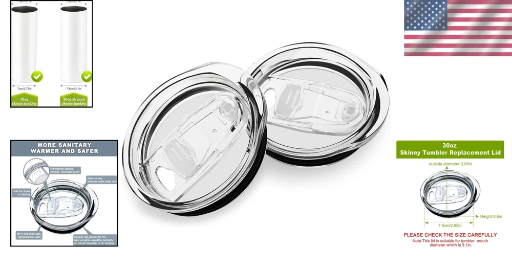 30oz Skinny Tumbler Replacement Lids - Non-Toxic and Dishwasher Safe 2 Pack ‹ › ‹ › ‹ › ‹ › ‹ › ‹ › ‹ › ‹ › 30oz Skinny Tumbler Replacement s - Non-Toxic and Dishwasher Safe Enhance your hydration experience with our premium Replacement s for 30oz Skinny Stainless Steel Tumblers . Each pack contains two expertly crafted s designed for perfection, ensuring your drinks are secure and spill-free. Features: Compatibility: Specifically designed to fit 30oz Skinny Stainless Steel Tumblers only. For other brand tumblers, please verify size as shown in the product image. Size: Dimensions – 3.05*2.85*0.6 inches, perfectly tailored for 30oz Skinny Tumblers. Quality Material: Crafted from BPA-free AS crystal clear plastic. Reusable, sturdy, and durable, ensuring safety in every sip. Splash Proof Technology: Double-sealing design prevents spills, perfect for those on-the-go moments while keeping your hot beverages secure. Designed for Convenience: The ser function allows for easy opening and closing, with a convenient hole for direct sipping or using a straw. Why Choose Our Replacement s? Whether at home, in the office, or on the road, our replacement s are your best companion for keeping your favorite beverages hot or cold longer. The leak-proof design and sturdy construction assure peace of mind, alleviating any worries of spills or mishaps. Available in packs of 2, 4, and 6, you can choose according to your hydration needs. Don't compromise on quality and convenience; upgrade your tumblers today with our 30oz Skinny Tumbler Replacement s and experience the difference! Shipping Free & Fast Shipping - We offer free shipping to most of the USA with a normal delivery time of 3-7 days. However, due to the current situation, additional delivery time (up to 3 weeks) may be required for some items. Alternative Carriers - We may use alternative carriers (e.g. USPS, FedEx, UPS, etc.) to ensure your package arrives safely and on time. Due to the use of multiple carriers, we are unable to provide a tracking number automatically. Handling Time - Orders are processed and shipped within 1-2 business days of receiving cleared payment. Shipping Restrictions - Shipping to Alaska, Hawaii, Puerto Rico, Guam, and other US territories may incur shipping charges or delivery restrictions. Please contact us before ordering, or your order can be refunded/cancelled. State Restrictions - There may be restrictions based on your state of purchase. For example, certain items may not be shipped to California due to state regulations. Contact for Tracking Updates - If you require tracking updates or have any concerns about the delivery of your order, please feel free to contact us, and we will be happy to assist you. Return 30-Day Hassle-Free Returns - We want you to be completely satisfied with your purchase. If you are not, you can return the item within 30 days of receiving it for a full refund or exchange. Easy Return Process - To start a return, simply contact us and we will provide you with a prepaid return shipping label and detailed instructions. Restocking Fee - There are no restocking fees for returns. However, the buyer is responsible for return shipping costs if the return is not due to a seller's error. Refund Processing Time - Refunds will be processed within 5 business days of receiving the returned item in its original condition. Payment We accept all major credit cards, PayPal, and Apple Pay for your convenience. Your payment information is secure and encrypted to ensure a safe and seamless transaction. Please complete your payment within 3 days of purchase to avoid any delays in shipping. Feedback Your feedback is extremely important to us. We strive to provide the best products and customer service possible. If you are satisfied with your purchase, please take a moment to leave us a positive review. If you have any concerns or issues with your order, please contact us before leaving negative feedback. We are committed to resolving any problems and ensuring your satisfaction. Contact Us If you have any questions or concerns, please feel free to reach out to our customer support team. You can contact us through the eBay messaging system. We are available Monday to Friday, 9:00 am to 5:00 pm EST, and we will do our best to respond to your inquiry within 24 hours. Buy it now and enjoy a pleasant shopping experience! UPC: Not Set Unit Quantity: 30 oz Material: BPA-Free Plastic,AS Crystal Clear Plastic,BPA Free Theme: Tumbler Lids Features: Spill Proof,Splash Resistant,Slider Opening,Leak-Proof,Double-Sealing Technology,Reusable,Durable,Non-Toxic,Dishwasher Safe Character: Not Set Department: Adults Type: Lid Brand: Unbranded Color: Clear Character Family: Not Set Pattern: Not Set Beverage Type: Hot or Cold Capacity: 30 oz Country/Region of Manufacture: Not Set MPN: Not Set Lid Type: Sliding Item Width: Not Set Item Height: Not Set Keeps Hot For: Not Set Keeps Cold For: Not Set Number of Items in Set: Two-Piece Item Weight: 0.08 lb Manufacturer Warranty: Not Set Model: Not Set Unit Type: lb Care Instructions: Dishwasher Safe Personalize: Not Set