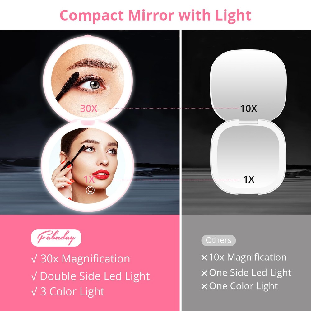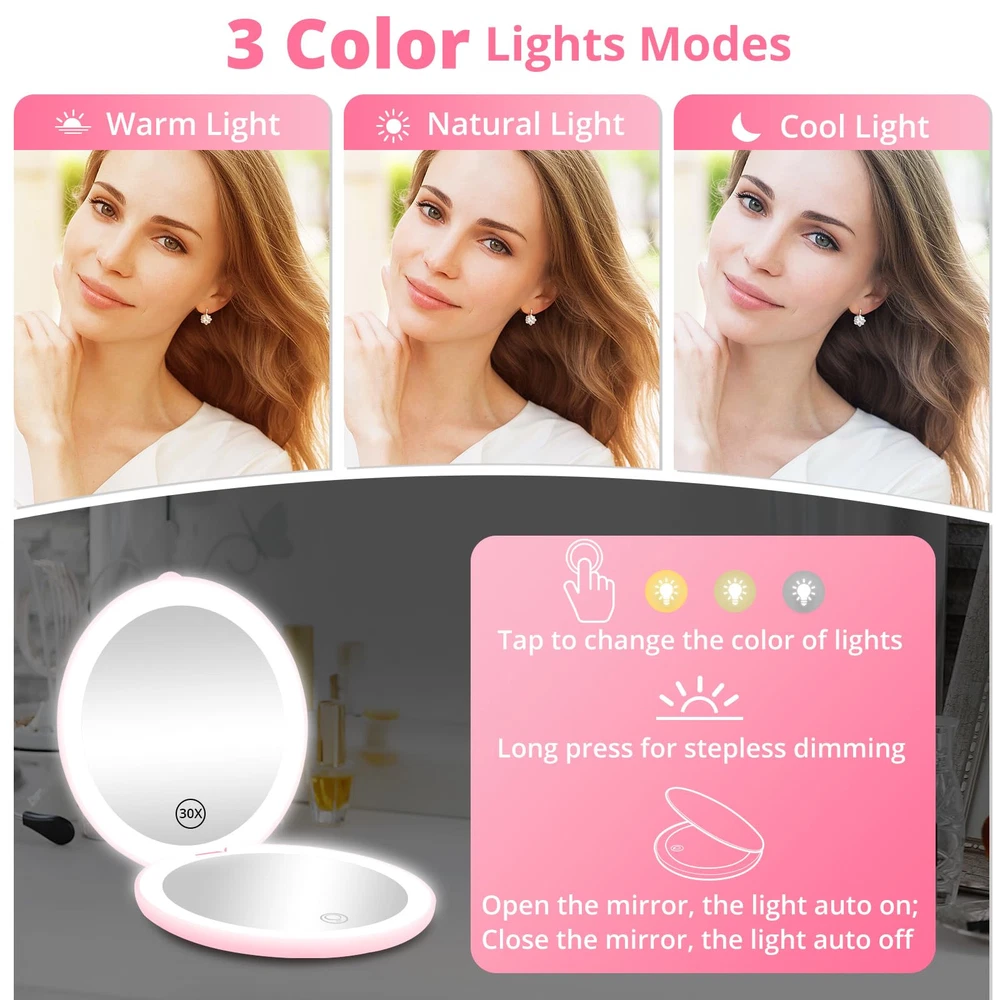 Travel Essentials for Women - travel mirror has a cute mini size to fits pocket, backpack, purse, bag, luggage. You could carry it on the go for traveling, business trip, road trip, camping etc. A must have travel gift for women. They will love it and won't let it go Stay Gorgeous and Confident - Check your makeup anytime and anywhere to make sure your makeup stays in perfect condition. Show your confidence at any time and have a beautiful traveling time Double Sided 1x/30x Mirror - Upgraded lighted mirror provides strong 30x magnification, the image is clearer and specific than 20x & 10x. Make you more efficient in doing face beauty, checking skin and hair style, and eyelash makeup. Also a must makeup mirror for older eyes 3 Color Light & Brightness Adjustable - Electric illuminated mirror provides warm/natural/cool light to meet the makeup needs of date/outside/office. Tap the sensor to turn ON/OFF the lighting, long press 3s to adjust the brightness. The light will automatically turn on or off as the mirror opens and closes Rechargeable Foldable Mirror - Light up face mirror built-in 800 mAh lithium battery, suitable for home and trip, meets your cordless use need. It can be continue to light up 3 hours in the highest brightness state,only takes 1.5-2 hours to fully charge The mirror. It comes with type-c cable