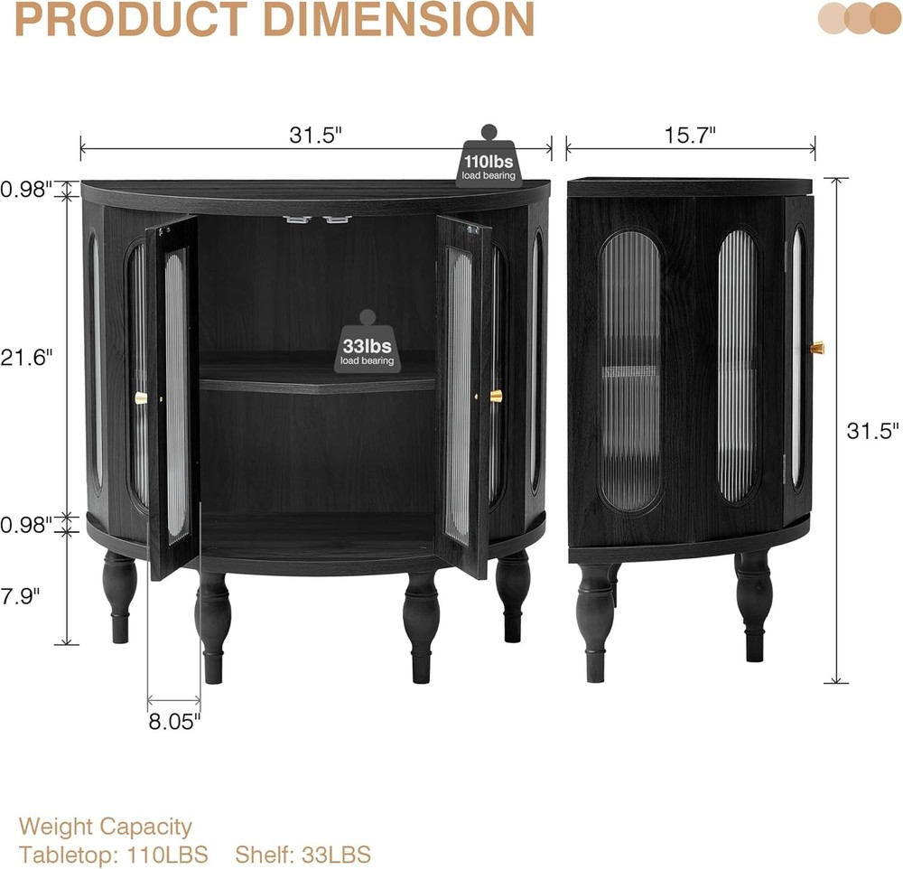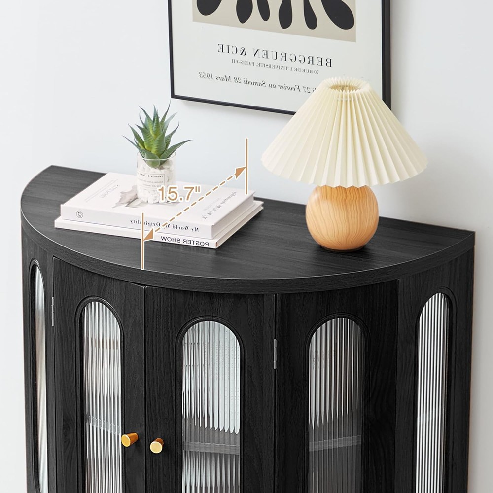 The item was shipped through US Stock, so it arrived faster than expected All items are brand new and unopened, 100% authentic, 24 hours message reply 31'' Sideboard Buffer Cabinet with Storage, Semi-Circle Modern Accent Storage Cabinet with Wooden Finish & Acrylic Doors, Console Table for Living Room Entryway Hallway (Black) Brand :XUZENEST Color :31'' Black Product Dimensions :15.75"D x 31.5"W x 31.5"H Special Feature: Adjustable Shelf Mounting Type: Floor Mount About this item 【Vintage Accent Storage Cabinet】This is a French modern accent cabinet made of acrylic materials and high-quality MDF wood. Combining the elegance of traditional French furniture with the simplicity of modern design, place this cabinet in your entryway, hallway, office, or living room, it adds both practical and charming decorative elements 【Double Storage Area & Semi-Circle Shape】The accent cabinet features double storage area, effectively dividing the interior into two separate areas. It has a half-moon spacious tabletop, where you can place recorders, aromatherapy, calendars and other displaying decorative items, great for small, narrow spaces so that you can move around comfortably 【Acrylic Material】 It has the characteristics of high transparency, lightweight, impact resistance, and good weather resistance. The light transmittance is very high, giving people a glass like transparency, with good impact resistance, not easy to break, lightweight and easy to handle and carry.The fluted Acrylic door to create a frosted feeling, with its own hazy effect, enriching the rhythm of the entire space 【Classic Roman Foot Design】Classical Roman foot shaped cabinet feet, unique shape, elegant and beautiful.The 4 solid wood cabinet legs, strong load-bearing capacity, easy to support the entire cabinet body, elevated design, sweeping robot can enter and exit freely, even after long-term use, it can maintain the stability of its structure and maintain the aesthetics and stability of furniture 【Easy Assembly】This 31'' sideboard buffer cabinet comes with all accessories are labeled and and each step of the installation has detailed instructions. With an easy-to-follow instructions manual. If you have any problems with the installation of half-moon storage cabinet, please contact us in time, all problems will be solved within 24 hours