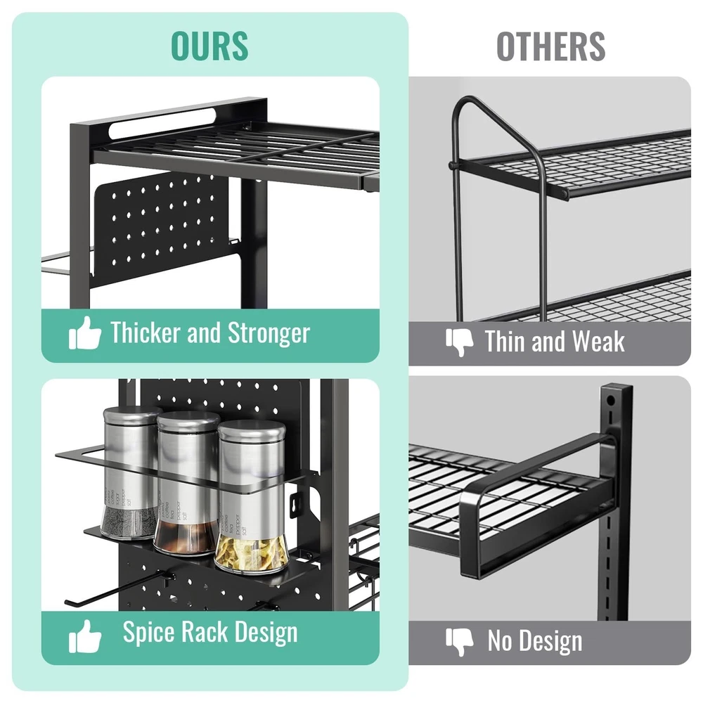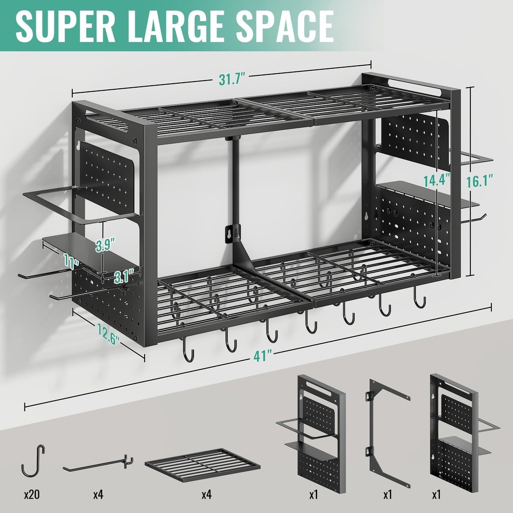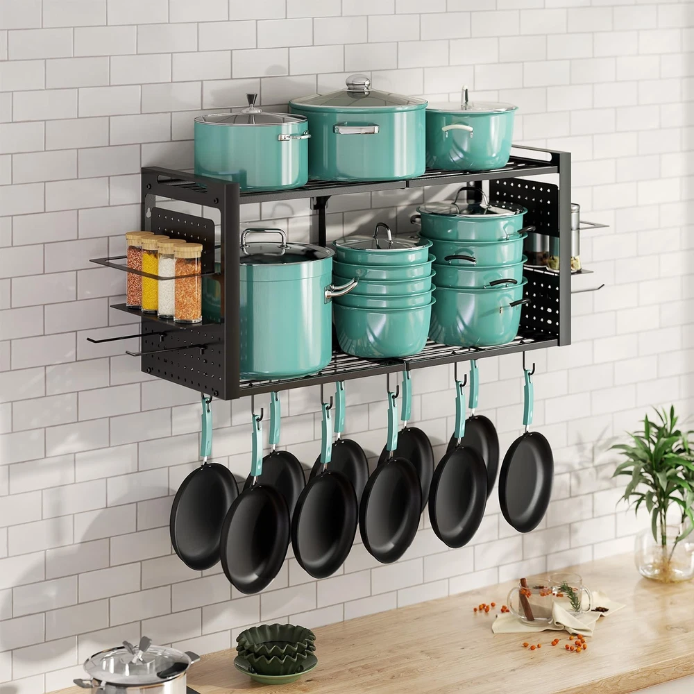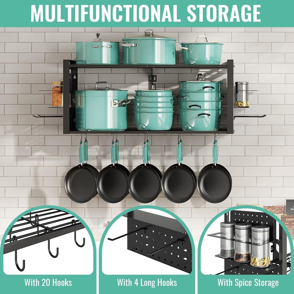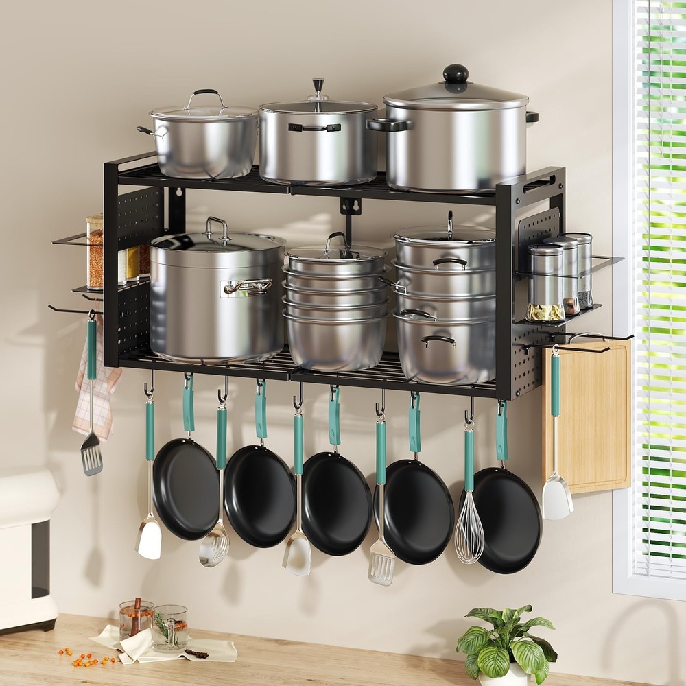 31 Inch Pot Rack Wall Mounted, 2-Tier Pots and Pans Organizer with 20 Hooks & Pan Organizer and Spice Rack, Heavy Duty Hanging Pot Hanger for Kitchen Cookware, Utensils, Black Product Details Style: without Pot Lid Holder Brand: Freexployer MPN: PR01-2T-B UPC: Does not apply EAN: Does not apply Material: Metal Color: Black Special Feature: Heavy Duty, Space Saving Product Dimensions: 12.6"D x 41"W x 16.1"H Shelf Type: Hanging Shelf Material: ‎Metal Color: ‎Black Special Feature: ‎Heavy Duty, Space Saving Product Dimensions: ‎12.6"D x 41"W x 16.1"H Shelf Type: ‎Hanging Shelf Number of Shelves: ‎2 Room Type: ‎Kitchen Assembly Required: ‎Yes Mounting Type: ‎Wall Mount Recommended Uses For Product: ‎Hang Pots / Pans, Organize Spices Included Components: ‎Assembly Instruction, Hardware, Installation Tool Brand: ‎Freexployer Style: ‎without Pot Lid Holder Shelf Weight Capacity: ‎100 Pounds Is Customizable: ‎No Indoor/Outdoor Usage: ‎Indoor Manufacturer: ‎Freexployer Part Number: ‎PR01-2T-B Item Weight: ‎11.97 pounds Item model number: ‎PR01-2T-B Special Features: ‎Heavy Duty, Space Saving Batteries Included?: ‎No Batteries Required?: ‎No Date First Available: August 28, 2025 Multifunctional Pot Rack: Unlike traditional single-function pot racks, the Freexployer pot and pan organizer stands out with innovative design. This hanging rack has a side spice rack for seasonings, and as ideal kitchen pot hanger, it enables one-stop storage of cookware, utensils and seasonings to keep the kitchen tidier. Large Capacity Space: This pot rack comes with 20 movable S-hooks for hanging pots and other kitchen tools. As a practical wall mounted pot organizer, its divided side spice rack neatly store kitchen items, eliminating clutter and keeping everything visible. Overall dimensions 41" W 12.6" D 16.1" H. Space-Efficient: This 2-tier pot and pan organizer maximizes space use. Mount it on the wall to utilize wall space fully, so cabinets and countertops stay clutter-free. As a practical hanging pot rack, it organizes cookware easily to keep the cooking area neat and efficient. Sturdy and Durable: This pot organizer is made of high-quality materials, with a solid structure and strong load-bearing. It supports daily pots and kitchenware easilyno deformation or loosening.The Freexployer pot and pan organizer stays reliable for long-term heavy hanging or frequent use, delivering lasting durability for kitchen storage. Easy to Assemble:The package comes with full hardware accessories and a clear instruction manual. You can start assembling this wall mounted pot rack right after receiving it. Following the steps in the manual, you can easily finish the installation within half an hour, with no complicated operations required.