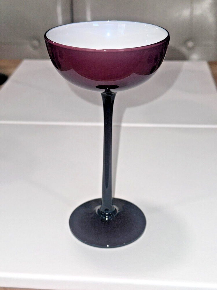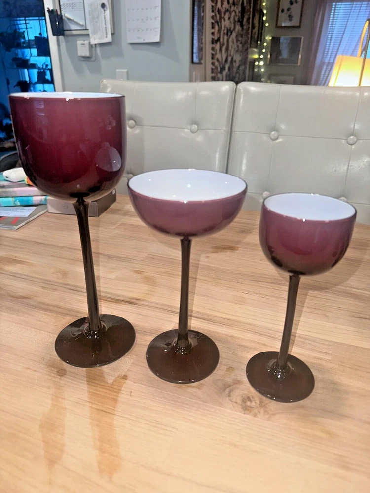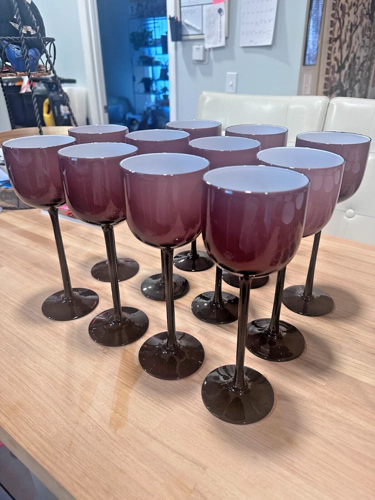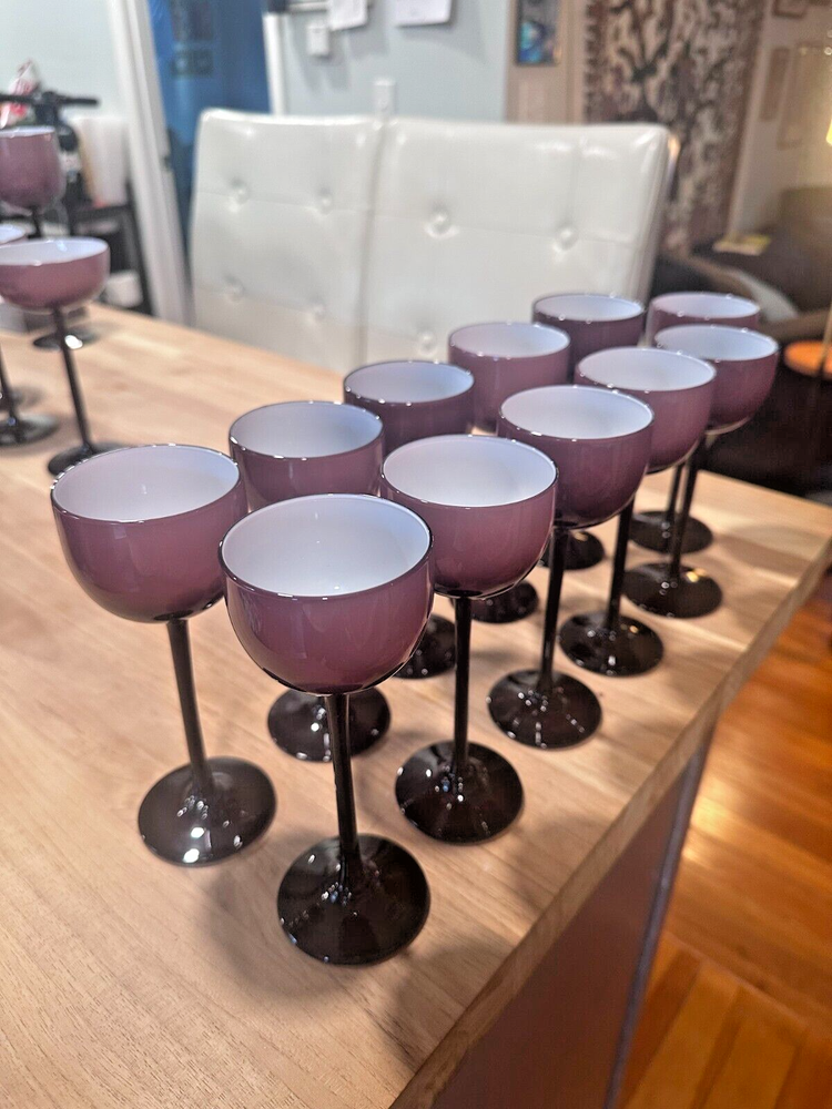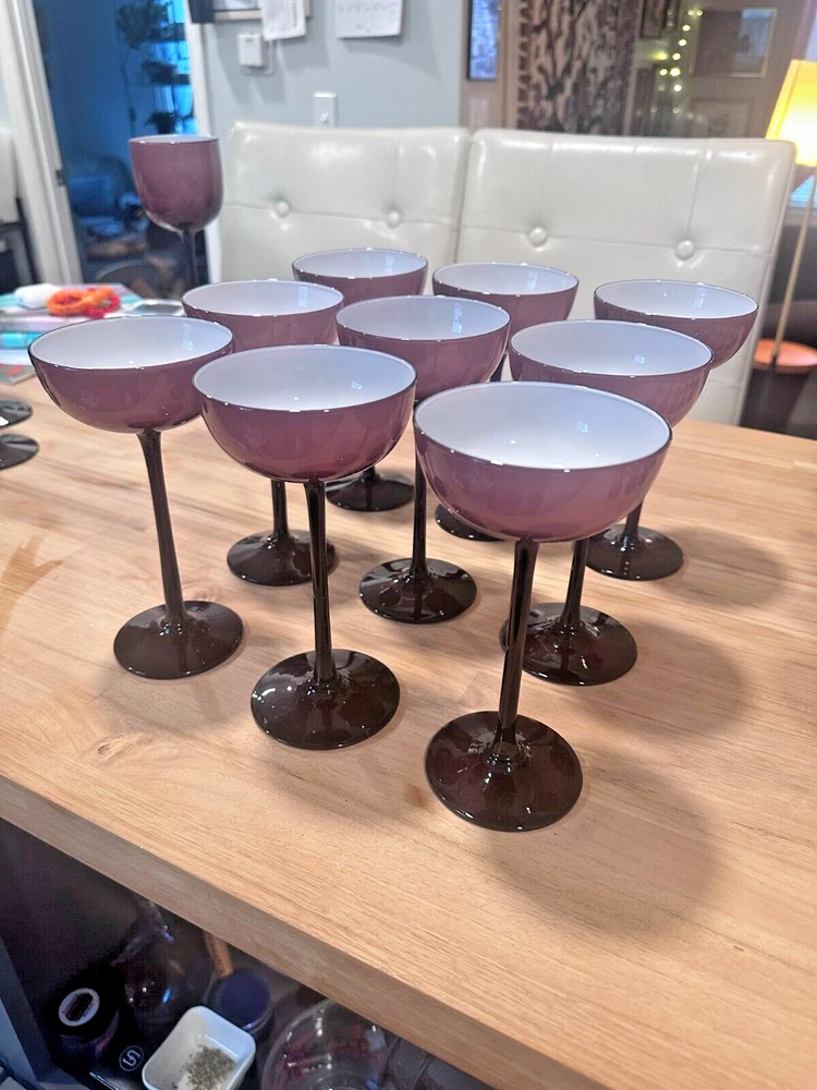 This vintage set by 1960's Carlo Moretti includes 31 wine glasses in a rare amethyst color. Each glass is hand-blown in Italy, featuring a glossy finish and a mid-century modern style. The collection includes 11 Long Stem Wine Glasses, nine Champagne Stem Glasses, and Eleven Port Wine Glasses. These glasses are very rare, and having 31 of them is even more rare. These would make an excellent Wedding Gift, a beginning or addition of your own collection of antique vintage glassware, or a great investment to hold on to and sell at a later date. Take advantage of the fact I am not in a position to do the same.