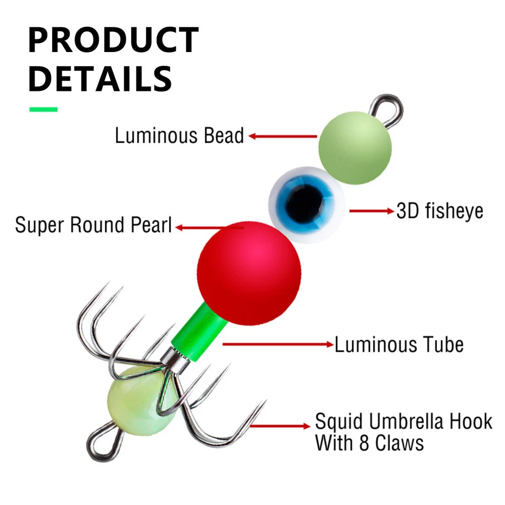 Features: Luminous Squid Jig Hooks: These hooks are designed with a luminous feature, making them highly visible underwater for increased fishing success. Octopus Squid Hook Fishing Lure: The unique design of these hooks mimics the movement of a real octopus or squid, attracting a wide range of fish species. Convenient to Use Cuttlefish Fishing Bait Lure Hook: The cuttlefish-inspired design of these fishing bait lure hooks ensures easy and hassle-free baiting, saving you time and effort. Suitable for Various Environments: These hooks are suitable for use in various fishing environments, ensuring versatility and adaptability to different fishing conditions. Suitable for Halibut Marlin Bass: Whether you're targeting halibut, marlin, or bass, these hooks are designed to meet the specific needs of these fish species, increasing your chances of a successful catch. Specifications: Material: Metal Size: 6.3*3cm Notes: Please allow slightly errors due to manual measurement and different monitors. Package includes: Chocie 1-2: 1* 3pcs*Hook Set OR Chocie 3: 1* 10pcs*Hook Set