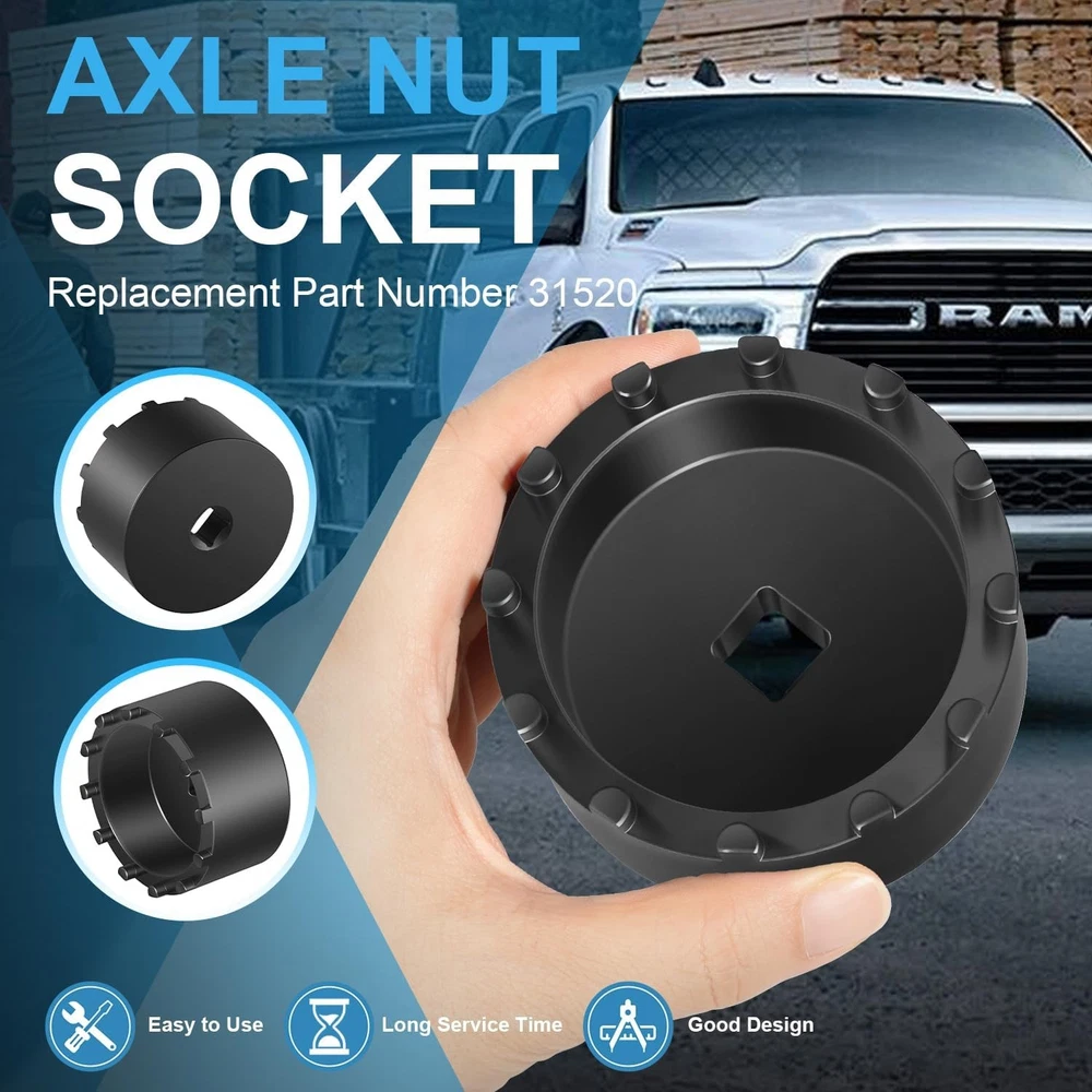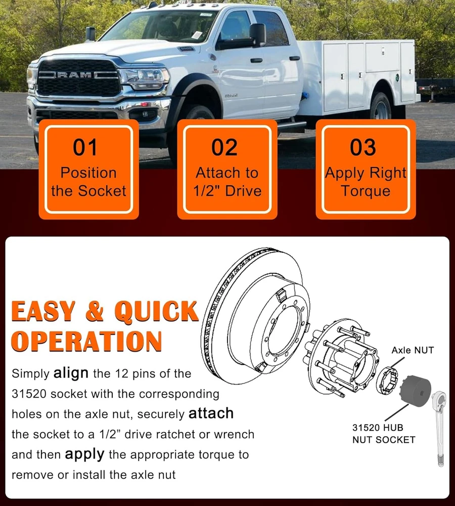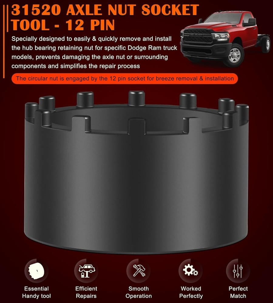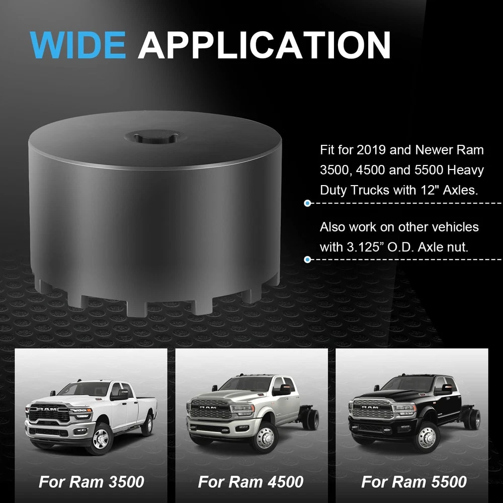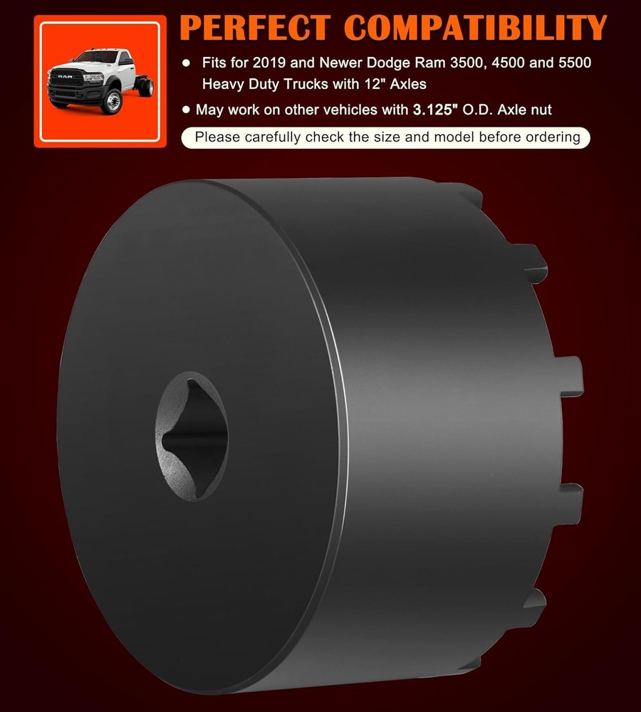 Fitment: The 31520 shaft nut sleeve tool perfectly fits for 2019 and Newer Dodge Ram 3500, 4500 and 5500 Heavy Duty Trucks with 12" Axles. And may work on other vehicles with 3.125" outer diameter axle nut. (NOTE: To make sure this item is the correct part for your needs, please refer to the image to review the product dimension carefully before placing the order.) Features: 1) The 31520 12-Pin Axle Nut Socket is specially designed to easily & properly remove and install the hub bearing retaining nut for the specific Dodge Ram truck models, the circular nut is engaged by this 12 pin socket for ensuring a secure and precise grip without damage, reduces the risk of damaging the axle nut or surrounding components, effectively simplifies the repair process to save time and effort 2) The customized 12-pin design precisely engages with the axle nut, provides a secure grip without slipping, protecting the hub nut from damaging, effectively improves the safety and efficiency during the maintenance process 3) Simply align the 12 pins of the 31520 socket with the corresponding holes on the axle nut, securely attach the socket to a 1/2” drive ratchet or wrench and then apply the appropriate torque to remove or install the axle nut. (1/2” drive ratchet or wrench is NOT included.) 4) This 1/2" drive axle nut socket is hardened from top quality steel with a black oxide finish, rust and corrosion resistance, wear and impact resistant, can withstand high torque operations, sturdy and durable. High precision and hardness ensure long-term reliable service 5) Easy to Operate. No special tools needed. 1) Align the 12 pins of the socket with the corresponding holes on the axle nut. 2) Securely attach the socket to a 1/2” drive ratchet or wrench. 3) Apply appropriate torque to remove or install the axle nut Package included: 31520 Axle Nut Socket