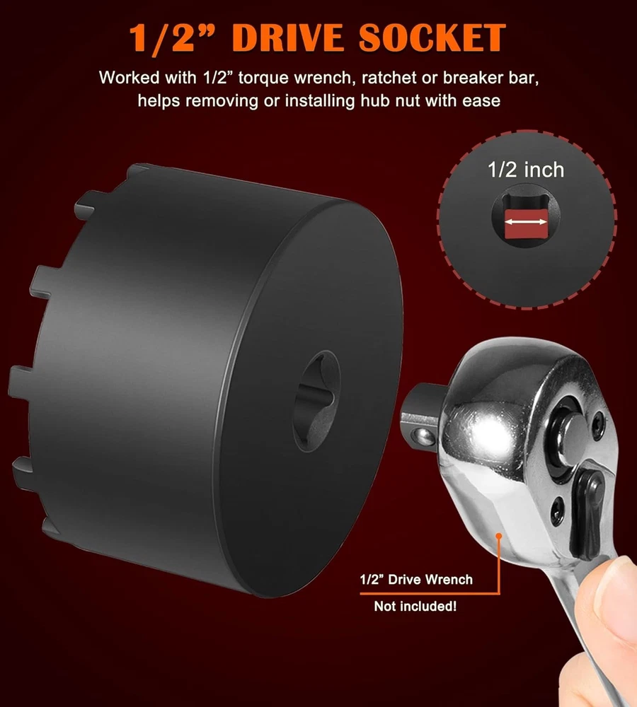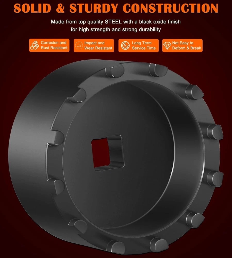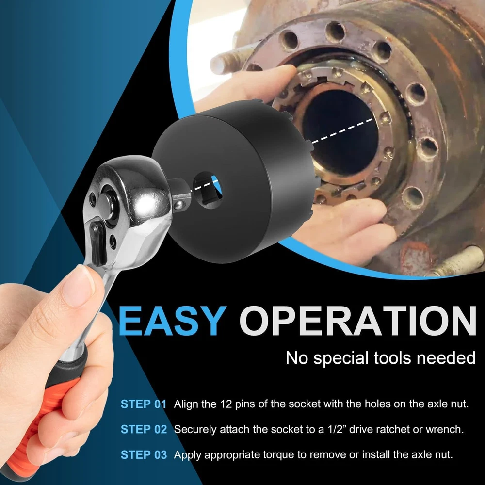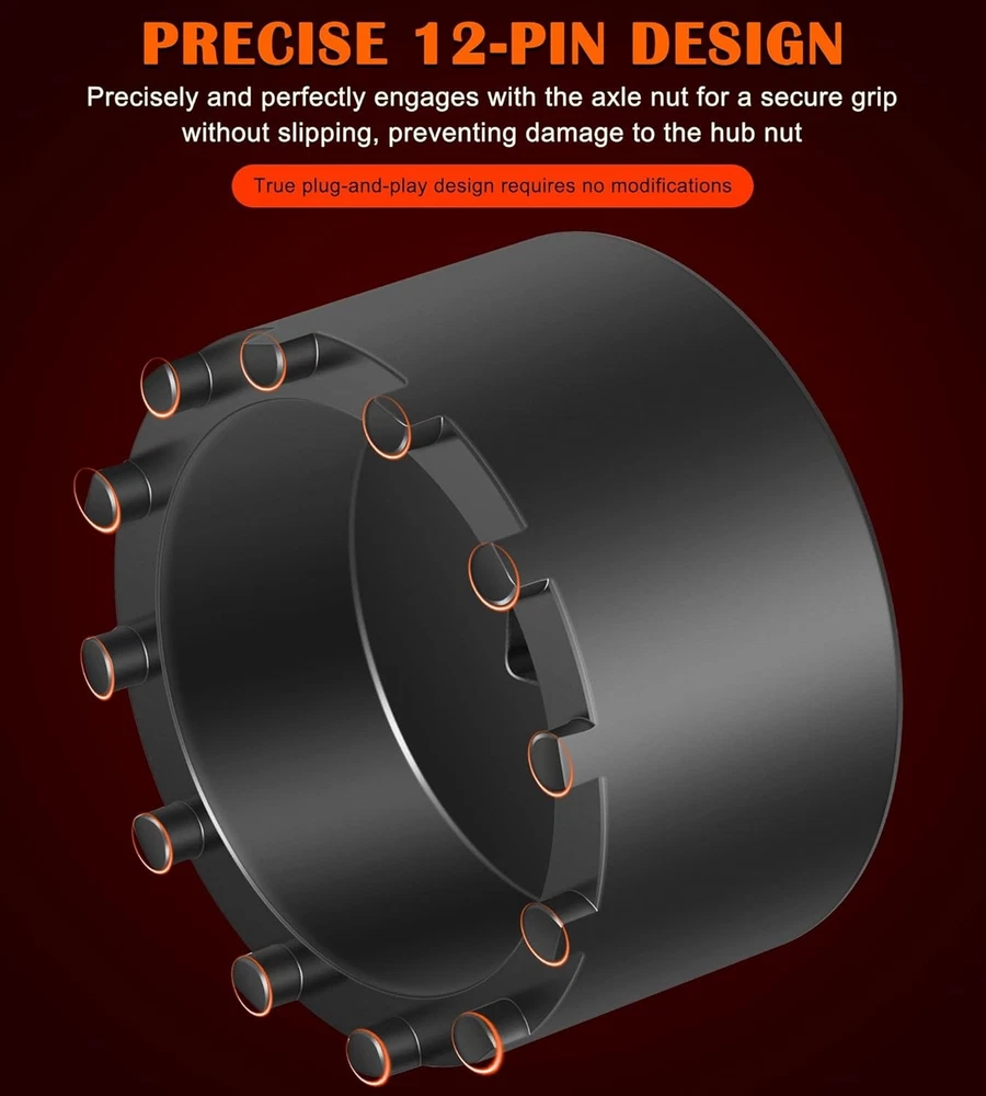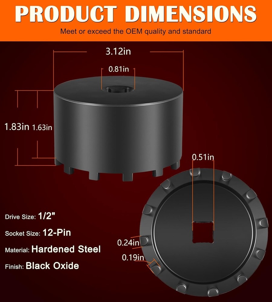 Fitment: The 31520 shaft nut sleeve tool perfectly fits for 2019 and Newer Dodge Ram 3500, 4500 and 5500 Heavy Duty Trucks with 12" Axles. And may work on other vehicles with 3.125" outer diameter axle nut. (NOTE: To make sure this item is the correct part for your needs, please refer to the image to review the product dimension carefully before placing the order.) Features: 1) The 31520 12-Pin Axle Nut Socket is specially designed to easily & properly remove and install the hub bearing retaining nut for the specific Dodge Ram truck models, the circular nut is engaged by this 12 pin socket for ensuring a secure and precise grip without damage, reduces the risk of damaging the axle nut or surrounding components, effectively simplifies the repair process to save time and effort 2) The customized 12-pin design precisely engages with the axle nut, provides a secure grip without slipping, protecting the hub nut from damaging, effectively improves the safety and efficiency during the maintenance process 3) Simply align the 12 pins of the 31520 socket with the corresponding holes on the axle nut, securely attach the socket to a 1/2” drive ratchet or wrench and then apply the appropriate torque to remove or install the axle nut. (1/2” drive ratchet or wrench is NOT included.) 4) This 1/2" drive axle nut socket is hardened from top quality steel with a black oxide finish, rust and corrosion resistance, wear and impact resistant, can withstand high torque operations, sturdy and durable. High precision and hardness ensure long-term reliable service 5) Easy to Operate. No special tools needed. 1) Align the 12 pins of the socket with the corresponding holes on the axle nut. 2) Securely attach the socket to a 1/2” drive ratchet or wrench. 3) Apply appropriate torque to remove or install the axle nut Package included: 31520 Axle Nut Socket