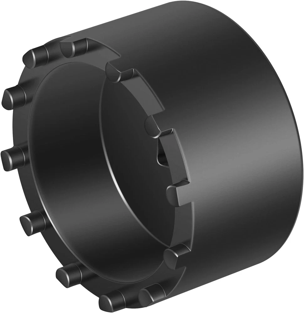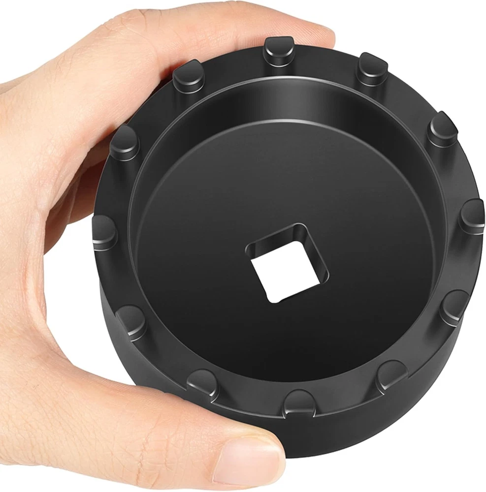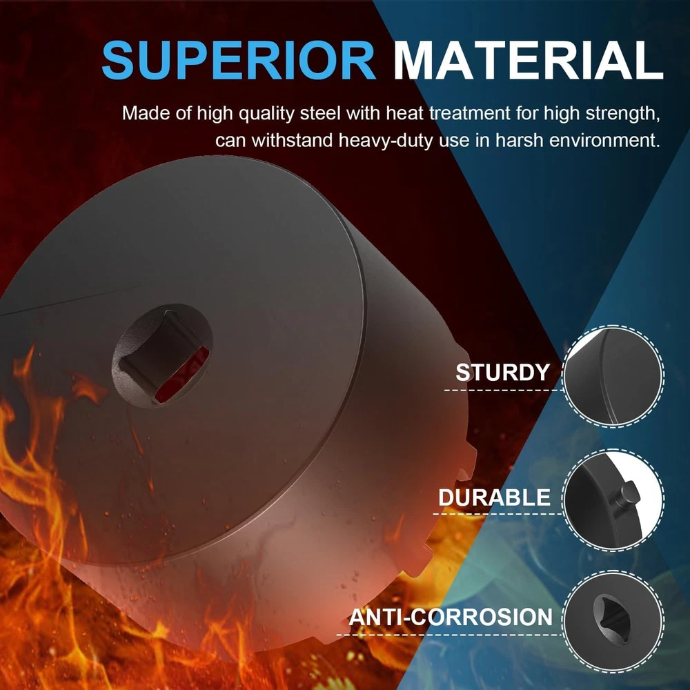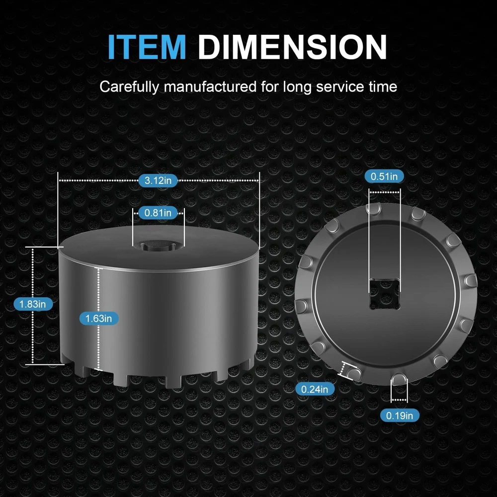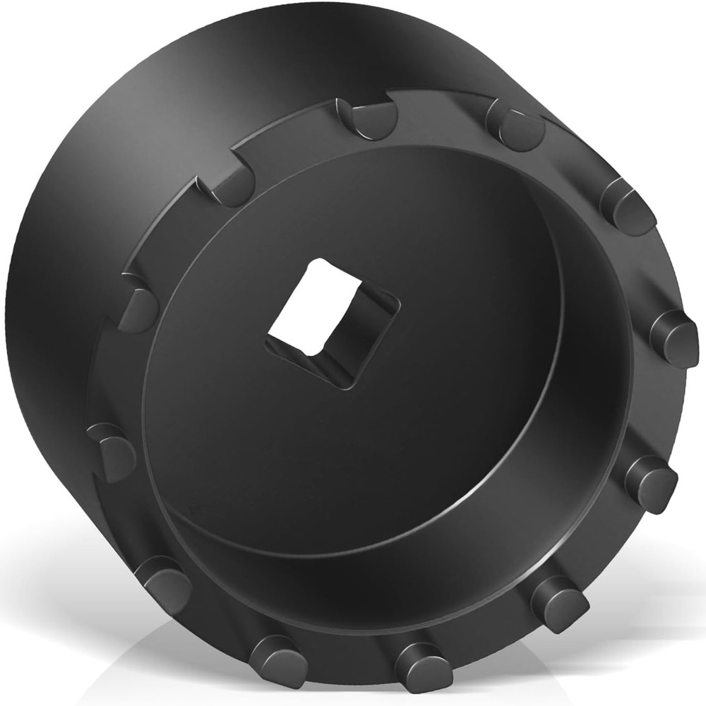 Fitment: The 31520 shaft nut sleeve tool perfectly fits for 2019 and Newer Dodge Ram 3500, 4500 and 5500 Heavy Duty Trucks with 12" Axles. And may work on other vehicles with 3.125" outer diameter axle nut. (NOTE: To make sure this item is the correct part for your needs, please refer to the image to review the product dimension carefully before placing the order.) Features: 1) The 31520 12-Pin Axle Nut Socket is specially designed to easily & properly remove and install the hub bearing retaining nut for the specific Dodge Ram truck models, the circular nut is engaged by this 12 pin socket for ensuring a secure and precise grip without damage, reduces the risk of damaging the axle nut or surrounding components, effectively simplifies the repair process to save time and effort 2) The customized 12-pin design precisely engages with the axle nut, provides a secure grip without slipping, protecting the hub nut from damaging, effectively improves the safety and efficiency during the maintenance process 3) Simply align the 12 pins of the 31520 socket with the corresponding holes on the axle nut, securely attach the socket to a 1/2” drive ratchet or wrench and then apply the appropriate torque to remove or install the axle nut. (1/2” drive ratchet or wrench is NOT included.) 4) This 1/2" drive axle nut socket is hardened from top quality steel with a black oxide finish, rust and corrosion resistance, wear and impact resistant, can withstand high torque operations, sturdy and durable. High precision and hardness ensure long-term reliable service 5) Easy to Operate. No special tools needed. 1) Align the 12 pins of the socket with the corresponding holes on the axle nut. 2) Securely attach the socket to a 1/2” drive ratchet or wrench. 3) Apply appropriate torque to remove or install the axle nut Package included: 31520 Axle Nut Socket