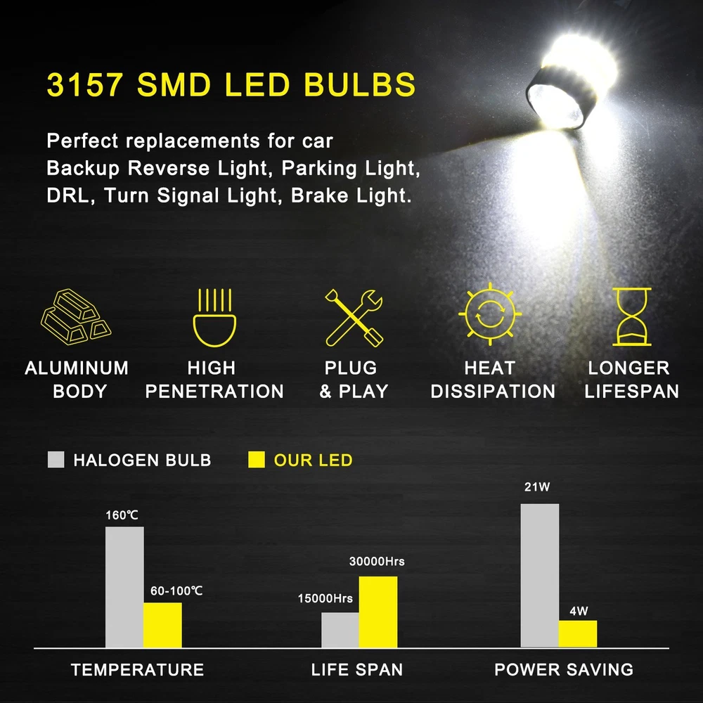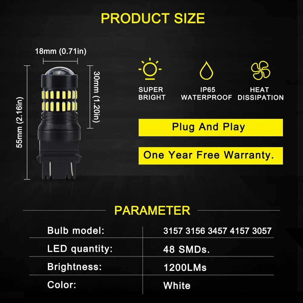 PRODUCT Description: AUXITO LED Light Bulb has specialized in LED lights for many years. Our mission is to produce high quality automotive LED light bulbs. We believe in our LEDs and offer warranty on item(s) confirm to be manufacturer defect. Bulb Size: 3157 3457 3057 4157 3156 4057 3457ECT... LED Type: 48 LED chip 4014SMD Beam Type: 360°Beam Angle Color Temperature: 6000K Super White Lumens: 2400LM Working Voltage: DC 12V-24V Lifespan: 50000 working hours ,Adopt imported chips, stable quality, long service life Application: tail lights, brake lights, back up reverse lights, daytime running lights, etc. NOTE: 3157 LED White Daytime Running Light Bulb DRL for Chevy Silverado 1500 1999-2012 PRODUCT Description: AUXITO LED Light Bulb has specialized in LED lights for many years. Our mission is to produce high quality automotive LED light bulbs. We believe in our LEDs and offer warranty on item(s) confirm to be manufacturer defect. Bulb Size: 3157 3457 3057 4157 3156 4057 3457ECT... LED Type: 48 LED chip 4014SMD Beam Type: 360°Beam Angle Color Temperature: 6000K Super White Lumens: 2400LM Working Voltage: DC 12V-24V Lifespan: 50000 working hours ,Adopt imported chips, stable quality, long service life Application: tail lights, brake lights, back up reverse lights, daytime running lights, etc. NOTE: Energy saving, environmental protection, Stable performance, through strict test, Use safer driving in the car For most cars, just Plug-n-Play,no ballast required. Yet for some European vehicles or new vehicles, load resistors maybe required to avoid the error code or blinking. When installing this bulb, please make sure to turn the car off, and key out. LED bulbs are very easy to install. You just have to plug it in the socket. (LED bulb has + AND -terminal. If it doesn't light up after inserting into the socket, all you need to do is insert it oppositely.) Compatible for Standard socket. PACKAGE: 2x LED Bulbs ABOUT US 3157 LED White Daytime Running Light Bulb DRL for Chevy Silverado 1500 1999-2012 PRODUCT Description: AUXITO LED Light Bulb has specialized in LED lights for many years. Our mission is to produce high quality automotive LED light bulbs. We believe in our LEDs and offer warranty on item(s) confirm to be manufacturer defect. Bulb Size: 3157 3457 3057 4157 3156 4057 3457ECT... LED Type: 48 LED chip 4014SMD Beam Type: 360°Beam Angle Color Temperature: 6000K Super White Lumens: 2400LM Working Voltage: DC 12V-24V Lifespan: 50000 working hours ,Adopt imported chips, stable quality, long service life Application: tail lights, brake lights, back up reverse lights, daytime running lights, etc. NOTE: Energy saving, environmental protection, Stable performance, through strict test, Use safer driving in the car For most cars, just Plug-n-Play,no ballast required. Yet for some European vehicles or new vehicles, load resistors maybe required to avoid the error code or blinking. When installing this bulb, please make sure to turn the car off, and key out. LED bulbs are very easy to install. You just have to plug it in the socket. (LED bulb has + AND -terminal. If it doesn't light up after inserting into the socket, all you need to do is insert it oppositely.) Compatible for Standard socket. PACKAGE: 2x LED Bulbs FAQ Shipping Returns Contact Us Payment Why swith to LED? LEDs not only give your vehicle a clean, modern look but, with proper use, will outlast any halogen bulb and HID bulb! Low energy draw, high lumen output, and instant on/off LED technology out shines stock bulbs in every way. Which bulbs are used in my vehicle? Check Sylvania automotive lamp replacemnt guide , you can select the year, make, and model of your vehicle, then select the application you want to replace or upgrade from stock. What does CAN Bus mean? CAN Bus means Controller Area Network Bus. This system monitors your vehicle and reports operating conditions. CAN Bus systems are commonly found in European vehicles such as BMW, Audi, Mercedes, Volkswagen, Porsche, and in many American vehicles. While most late model American vehicles have CAN Bus systems, it is always good to check with your vehicle dealer to see which system your vehicle has before purchasing electrical products. When do you need Warning Canceller? Some vehicles with cmplex internal computers(such as Audi,BMW,Jaguar,Mercedes,etc.) might report on-dash errors or flickering on the headlights. The warning canceller fixes the dashboard warning and flickering effect. Bulb Out Dashboard Error: On some vehicles, the dashboard will report as if you have a headlight bulb missing or burnt. It does not affect the headlights functioning, but the light on-dash will be on. The warning canceller fixes the issue. Flickering Issue: This happens when your vehicle does not recognize the new headlights installed. When turning the headlights on, the vehicle's computer does not understand the signal back from the headlights hence thinking they are still off. This triggers the headlight flickering effect. The warning canceller solves this issue. LED Advantages: Very low and efficient energy consumption than halogen bulbs & HID Bulbs Compared with HID bulbs, LED bulbs Light up instantly, no warm up period Low voltage protection, high precision constant current driver chip Longer lifespan than HID and halogen bulbs Light can be controlled easily in color and intensity Easy to install a LED headlight conversion kit (1) We will ship your item(s) within 24 hours. (2) We ship this item to US only via USPS first class mail. It usually takes 3-6 working days to deliver. How Long Will It Take to Receive My Refund? If you have emailed us for a refund ,once we have approved it ,after 60 days your money will be refunded. The estimated time for the refund to appear in your account is based on the payment method you use. Paypal is the only supported in NIGHTEYE Store. Please notify us within 30 days after you've received your purchased item. All return requests must be submitted through y