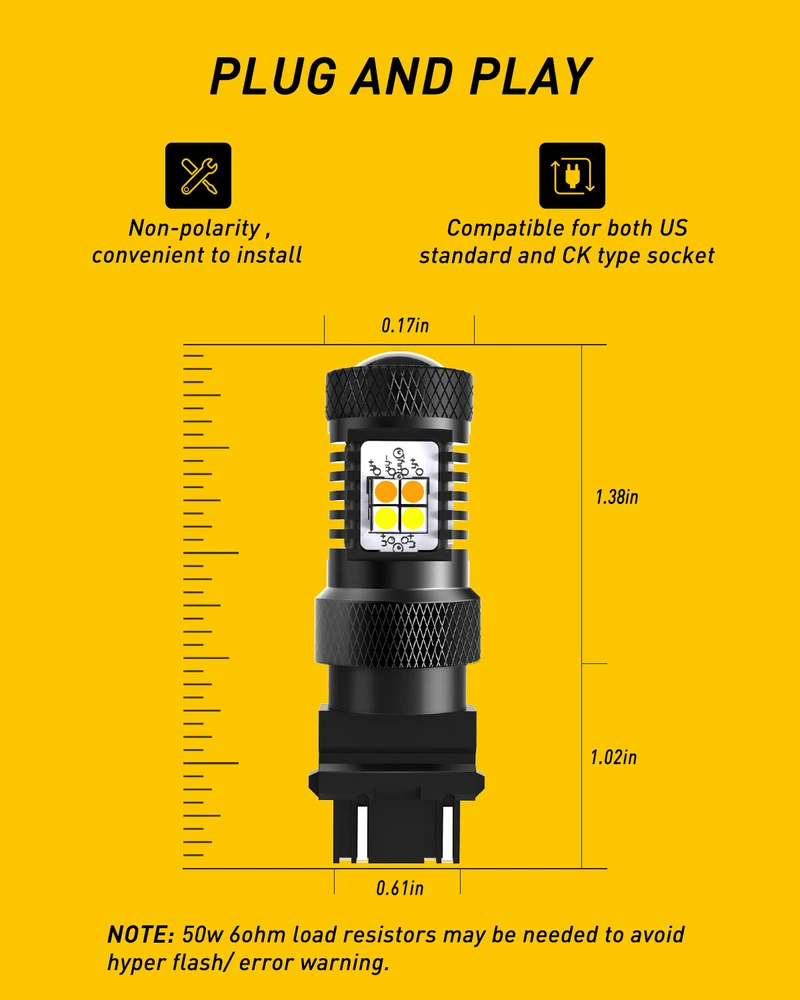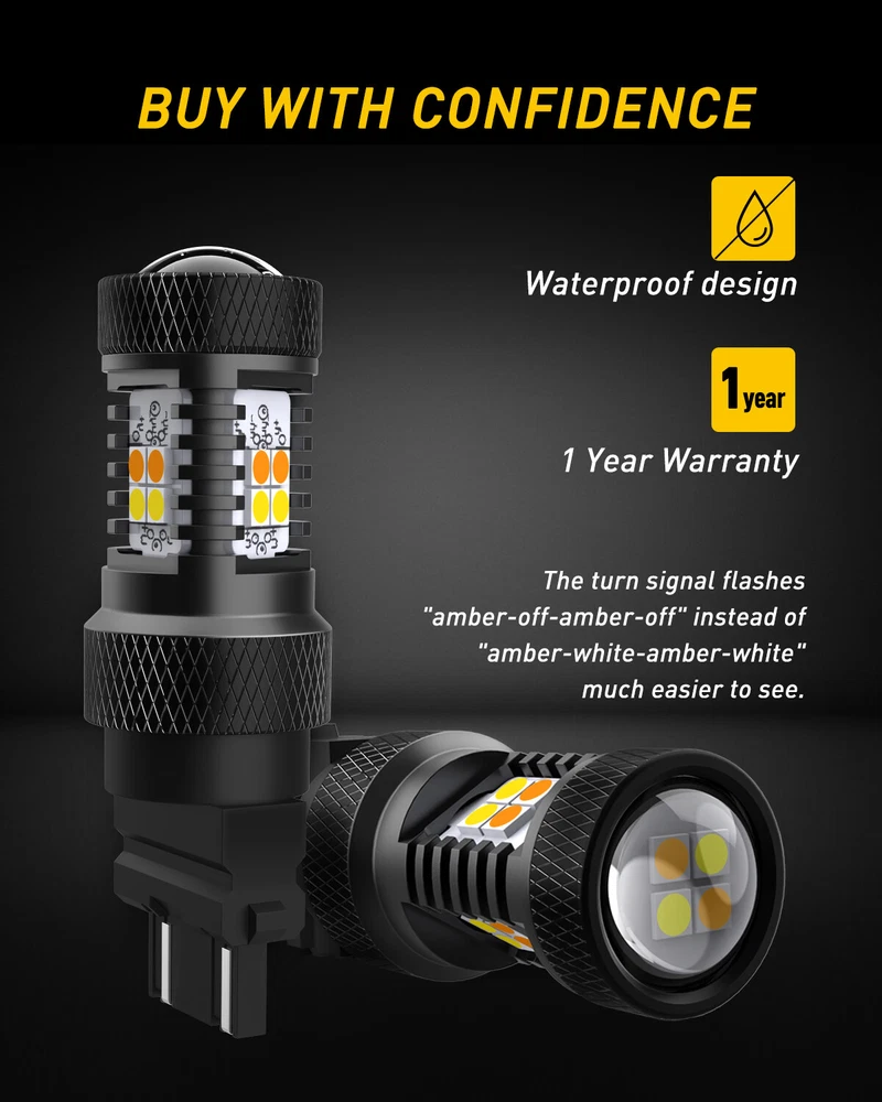 Specifications: Model:3157 3156 3457 4157 3057 T25 LED Chip:16pcs 3030-SMD LED chips for each bulb Lumens:1400Lm/per bulb Color Temperature:3000K Amber/Yellow , 6000K White Waterproof Level:IP65 Waterproof & Shockproof Power:8W/per bulb Beam Type:360°Beam Angle Certified by:CE & ROHs Work Voltage: DC 12V Warranty:1 YEAR Lifetime:More than 30000 hours Placement on Vehicle:Front Bulb size:3057A 3357NA 3047 3057 3155 3357 3454 3457 4057 4157 3757(For Reference Only) Installation positions: Front Turn Signal Light Applicable Used as a: Turn Signal Light/Daytime Running Light Suitable For Pickup, Wagon, UTB, Cab, ATV, SUV, Jeep, Truck, Bus etc. 3157 Switchback LED Turn Lights Signal WHITE Dual AMBER Color Anti Flash Hyper Specifications: Model: 3157 3156 3457 4157 3057 T25 LED Chip:16pcs 3030-SMD LED chips for each bulb Lumens:1400Lm/per bulb Color Temperature:3000K Amber/Yellow , 6000K White Waterproof Level:IP65 Waterproof & Shockproof Power:8W/per bulb Beam Type:360°Beam Angle Certified by:CE & ROHs Work Voltage: DC 12V Warranty:1 YEAR Lifetime:More than 30000 hours Placement on Vehicle:Front Bulb size:3057A 3357NA 3047 3057 3155 3357 3454 3457 4057 4157 3757(For Reference Only) Installation positions: Front Turn Signal Light Applicable Used as a: Turn Signal Light/Daytime Running Light Suitable For Pickup, Wagon, UTB, Cab, ATV, SUV, Jeep, Truck, Bus etc. Features: * Good light type :Double panel design, light source arrangement infinitely close to halogen lamp, light distribution distance 2mm, no dark area. * Excellent Heat Dissipation Construction : Our bulbs use built of lightweight and high-strength aluminum alloy as bulb body to keep themselves cool, even if they're used in constant-on applications like daytime running lights, they still illuminate non-fading brightness. * Non-Polarity Design : Directly replace your factory halogen lamp perfectly with the same socket and electrical connector, for plug and play installation. You needn't worry whether you have a CK or Non-CK socket, these bulbs are universally compatible. (Load resistor or flash relay will be needed to prevent the hyper flash when the replacement on the Turn Signal Lights) * Built-in Constant Current IC Driver : A constant current driver is a device that takes any incoming voltage and smooths it out, regulates it, so a steady stream of voltage/current reaches the LED, ensures a bright, efficient and long-lasting illumination. * CANBUS ERROR FREE : No. For some vehicles, it may require install decoder or load resistor to avoid turn signal hyper flash or fast blinking. Package include: 2*3157 LED Bulb Item Specifics Brand AUXITO Manufacturer Part Number Does Not Apply Ballast Included no Bulb Color Amber(Turn Signal Mode)/White(Parking Mode) Bulb Fitment Code 3157 Bulb Type LED Cable Type Cable Type Color Temperature 6000k (White Light) 3000K (Amber Light) Compatible With 3157 Fitment 2020|Ford|Expedition|King Ranch Sport Utility 4-Door|3.5L 3496CC Fitment Type Direct Replacement LED Number 16 LED Quantitiy 16 Lifetime More than 50,000hrs Light Color White/Amber Light Source Type 3030 Lighting Technology LED Material Metal MPN Does Not Apply Number of Bulbs 2 Suitable For Parking Light,Turn Signal Light To Fit Turn Signal Light,Parking Light Type White/Amber 3157 Turn Signal Parking Light Bulbs Voltage 12V Manufacturer Warranty 2 Years Wattage 16W Available Sizes 9006 9012 9145 9140 9008 H13 9004 9007 H7 7443 1157 1156 Interchange Part Number 3157/4157/4057/3357/3047 part number 1 3047LL, 3057KX, 3157ST, 3057X, 4057K, 3457NAK part number 2 3457AK, 3357ALL, 4114K, 3157X, 3057KLCP, 3757AK part number 3 3357LL, 4057LL, 3157K, 3357K, 3057K, 3057ALL part number 4 4114LL, 3457K, 3157LL, 4157K, 3057LL, 4157NAK part number 5 3047, 3357A, 3757A, 3457, 4114, 3357 part number 6 3157NA, 5702A, 4157NA, 3057, 3454NA, 4157 part number 7 3155, 3457A, 3457NA, 4057, 3157A, 3057A, 3157 Manufacturer Warranty 2 Years Payment Variety of payment methods are accepted, such as credit, debit, gift cards, Apply pay, Google Pay, Paypal and Paypal Credit. Shipping 1. All items will be shipped in 24 hours after receiving your payment . 2. We ship this item to US only via USPS first class mail. It usually takes 3-5 working days to deliver. Returns 1. We offer 60 days return policy. 2. Please contact us if you have any questions with the products . 3. Refund will be sent after we got your returned package. 4. All returned items should be in the original packaging with tracking number. Contact Us We work from Monday - Saturday 9:00AM - 6:00PM, but we will reply once we get your message. There will be delay on response if you send message or E-Mail on Sunday. DESCRIPTION PAYMENT SHIPPING RETURN POLICY CONTACT US Shop Category Store Home LED Headlight ◈ 9005 HB3 ◈ 9006 HB4 ◈ 9007 HB5 ◈ H7 LED Fog Light ◈ H8 H9 H11 LED Plate Light LED Reverse Light LED Brake Light Rear Bumper Light Car Parts & Accessories ◈ LED Third Brake Light ◈ Other Parts & Accessories Other New List Item 4pcs Door Belt Weather Strip Molding Seal For Honda Fit Jazz 2008-2013 I USD 39.99 Red+White Round Truck 16LED Trailer Stop Turn Signal Tail Light Brake Waterproof USD 21.09 2* Rear For 2013-2016 Chevrolet Spark LS EV LT Black Exterior Door Handles USD 35.99 For Ford Escape 13-19 Front RH Door Handle Grab Trim Molding Right SILVER Decor USD 13.99 For 2017-2021 Honda Civic Hatchback Window Visor Vent Rain Sun Guard Shades 4Pcs USD 40.99 Hot Item Rubber Seal Trim Prevent Water Leakage Windshield Sunroof Roof Top Window 10FT USD 10.99 AUXITO Grille Garnish TSS Sensor Cover For 2018-2021 Toyota Tacoma TRD PRO BLACK USD 13.29 Rubber Seal Trim Prevent Water Leakage Windshield Sunroof Roof Top Window 10FT USD 12.99 WHITE LED Side Door Light Lamp For Toyota Camry Prius Avalon 4Runner 6000K 12V USD 11.99 FOR 94-04 MUSTANG PASSENGER or DRIVER SIDE MASTER POWER WINDOW CONTROL SWITCH USD 9.99 Excellent Delivery 3157 Switchback LED Turn Lights Signal WHITE Dual AMBER Color Anti Flas