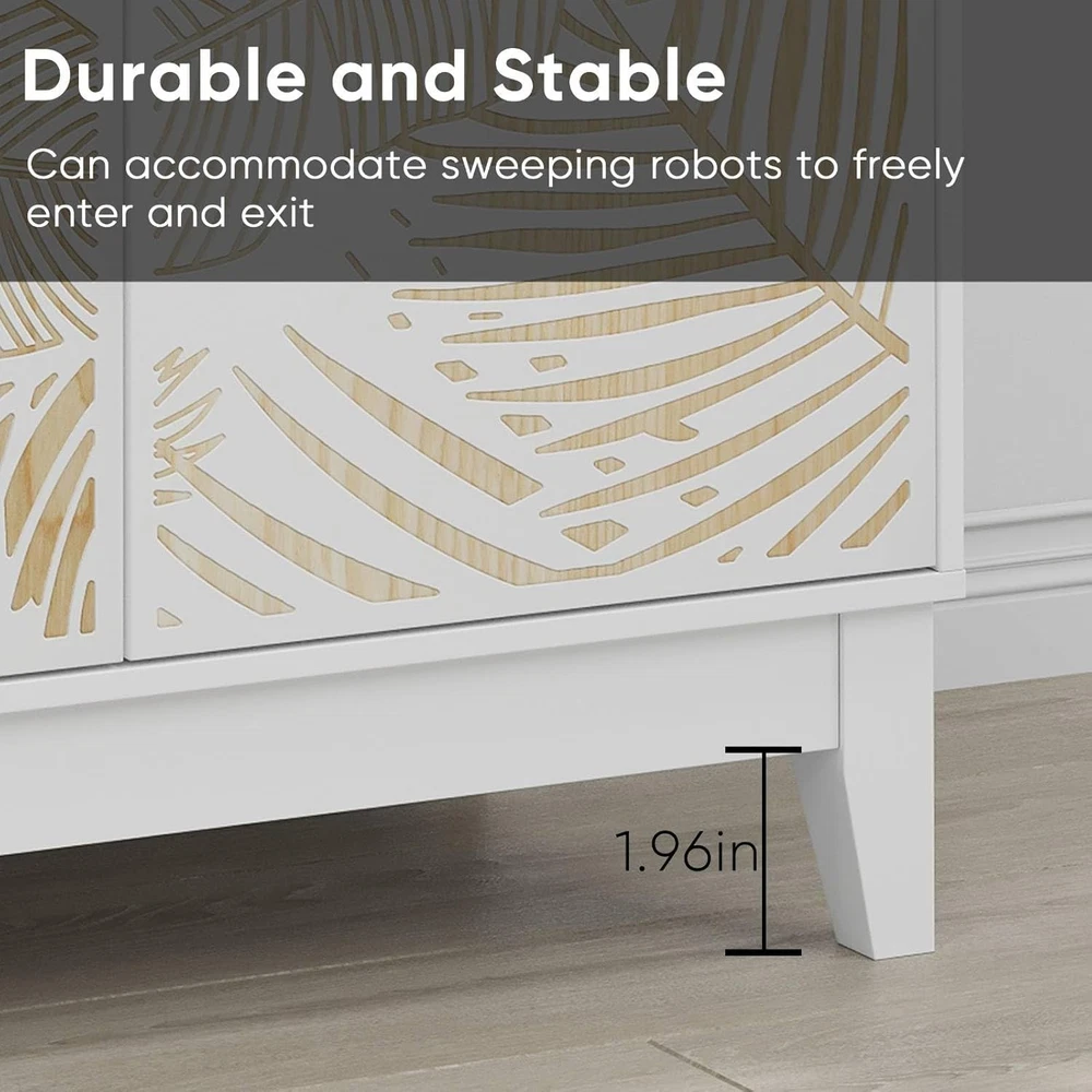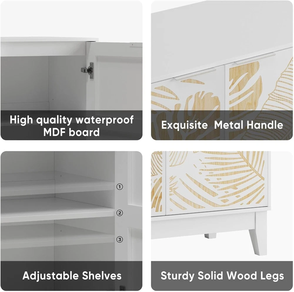 Product Description About this item ELEGANT LEAF CARVING DESIGN: The white sideboard features a stunning tropical leaf pattern carved on the cabinet doors, creating a stylish contrast between white finish and natural wood tones - perfect for adding a fashionable yet farmhouse touch to any room décor VERSATILE STORAGE SOLUTION: This 31.5"L x 15"W x 30"H buffet cabinet offers ample storage space with adjustable interior shelves at 3 different heights, allowing you to organize dishes, glassware, dining essentials, or decorative items efficiently QUALITY CONSTRUCTION: Crafted from premium waterproof MDF board with solid wood legs, this sideboard supports up to 220 lbs total weight capacity, ensuring long-lasting performance while being easy to clean and maintain MULTI-FUNCTIONAL FURNITURE: Use as a kitchen storage cabinet, dining room buffet, TV console, coffee bar, entryway table, or bookshelf - its versatile design complements farmhouse, mid-century modern, and art deco interior styles USER-FRIENDLY DESIGN: Features exquisite metal handles for easy operation, 1.96" clearance underneath for robot vacuum access, and comes with labeled components and detailed instructions for straightforward assembly without specialized tools Specifications: -Main Color: White -Main Material: MDF -Use Case: Dining Room -Wood Type: Engineered Hardwood -Storage Features: Adjustable Shelves -Product Dimensions: Assembled Length (in.):31.50 Assembled Width (in.):14.96 Assembled Height (in.):29.92 -Product Weight (lbs.):43.12 -Assembly Required: Yes 1. The color of the actual product may differ from the image due to the lighting or the monitor’s display. 2. Manual measurement has been used; there may be some reasonable error. Package includes: 1 x Buffet Cabinet
