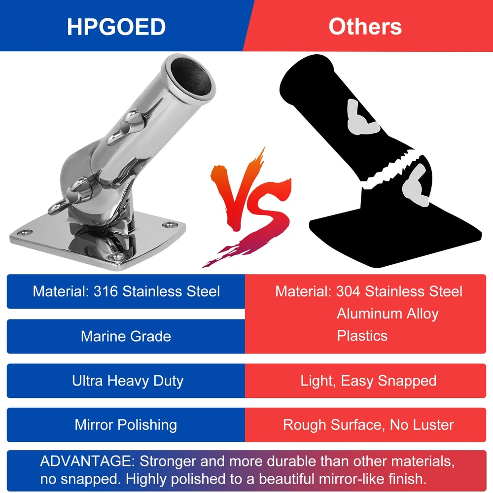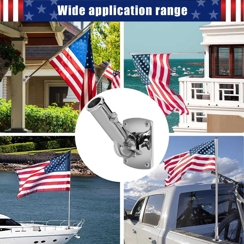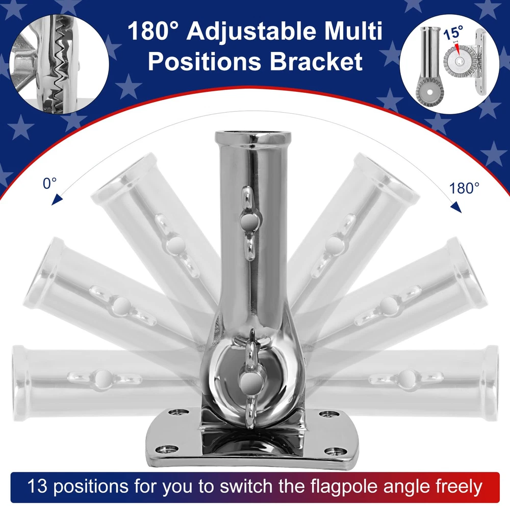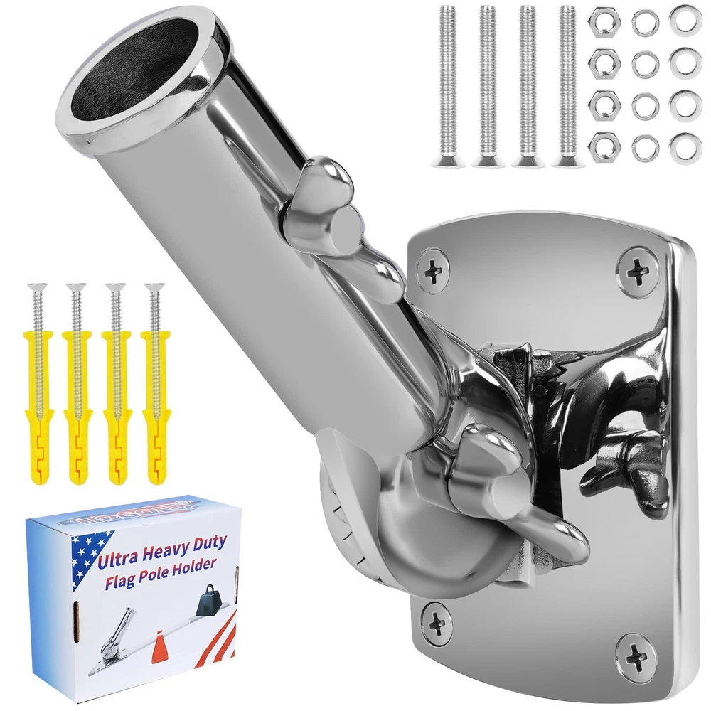 316 STAINLESS STEE - : The flag holder is made of 316 stainless steel. It is very sturdy and durable, with strong wind resistance, excellent seawater corrosion resistance, and can withstand various adverse weather conditions. It is particularly suitable for use in coastal and windy environments. Will never rust or break. ULTRA HEAVY DUTY FLAG MOUNT: Compared with flag pole holder made of 304 stainless steel, aluminum alloy, and plastic materials, 316 stainless steel flag bracket have a heavier weight and higher strength. Even in a hurricane, it can stand tall. Fly your flag proudly with this wind resistant flagpole holder for outside. ADJUSTABLE DESIGN: It adopts gear bite and has 13 adjustment angles, allowing you to adjust the angle and position of your flag to suit your needs. This makes it easy to display your flag in a way that's most visible and eye-catching. MIRROR POLISHING: This flag pole mount has shining polished looking and smooth touch. The high polished 316 stainless steel finish makes this piece a great and luxurious addition to your flag, this is a major upgrade that will look beautiful with your flag. LONG TERM VALUE: This flag pole bracket is of excellent quality, you will not be disappointed with it. It is extremely sturdy with no flimsy part to break off. This will last you flags after flags after flags. This time, it will fly your american flag forever. SERVICE: We always try our best to offer the best service and hope to give customers the best shopping experience, if you have any questions, please feel free to us and we'll help to solve it in 24 hours.
