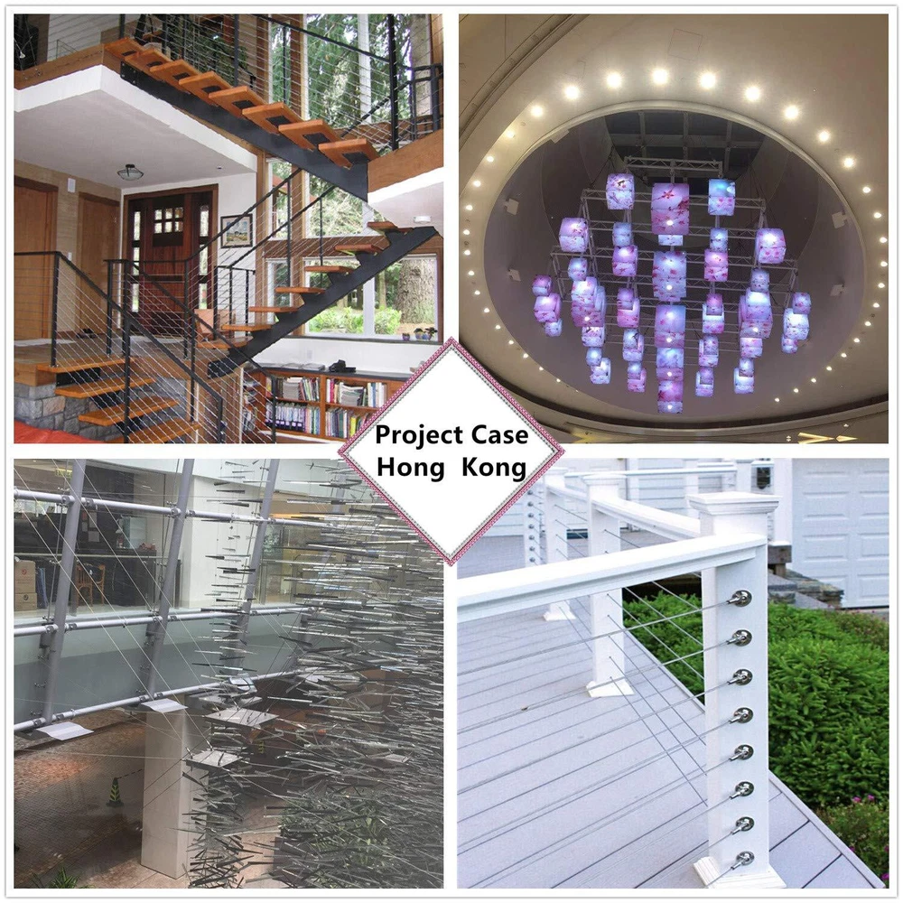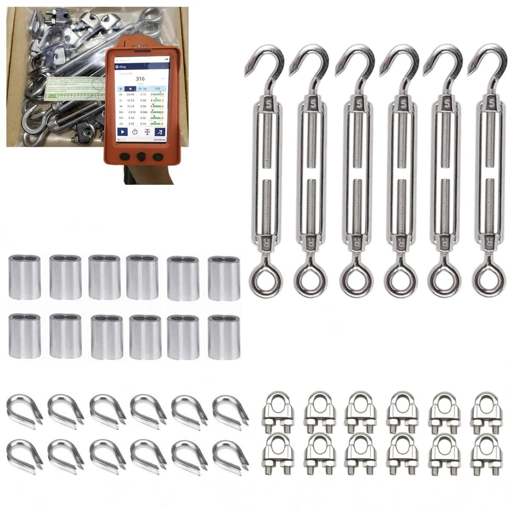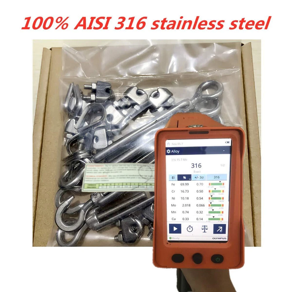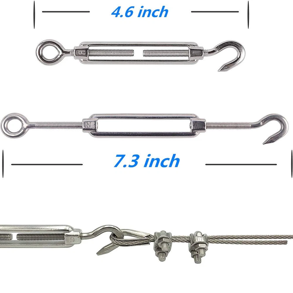 【 HK QUALITY 】Product of Hong Kong company. Made of US AISI standard 316 stainless steel for maximum corrosion resistance, durability and tensile strength. ▲Adopted molybdenum elements-containing material that is more rust-proof than other rust-proof materials since Hong Kong is a coastal city. You are welcome to conduct an optical test or a test. This 1/8" stainless steel cable kit can be used as sun shade hardware kit, hanging commercial string light, clothes lines, stainless steel cable railing kit and so on. ▲For long time , you need this 316 stainless steel cable kit. Require other 316 stainless steel railing hardware, turubuckle, wire rope clip and 316 stainless steel cable please visit: . M3 Wire rope cable clips and thimbles fit 1/8 inch wire rope;M5 turubuckles :Max length 7.3 inch,Min length 4.6 inch. 【 HK QUALITY 】Product of Hong Kong company. Made of US AISI standard 316 stainless steel for maximum corrosion resistance, durability and tensile strength. ▲Adopted molybdenum elements-containing material that is more rust-proof than other rust-proof materials since Hong Kong is a coastal city. You are welcome to conduct an optical test or a test. This 1/8" stainless steel cable kit can be used as sun shade hardware kit, hanging commercial string light,clothes lines, stainless steel cable railing kit and so on. ▲For long time , you need this 316 stainless steel cable kit .Require other 316 stainless steel railing hardware, turubuckle, wire rope clip and 316 stainless steel cable please visit: . M3 Wire rope cable clips and thimbles fit 1/8 inch wire rope, M5 turubuckles :Max length 7.3 inch, min length 4.6 inch.