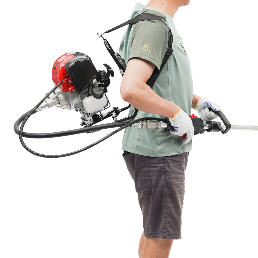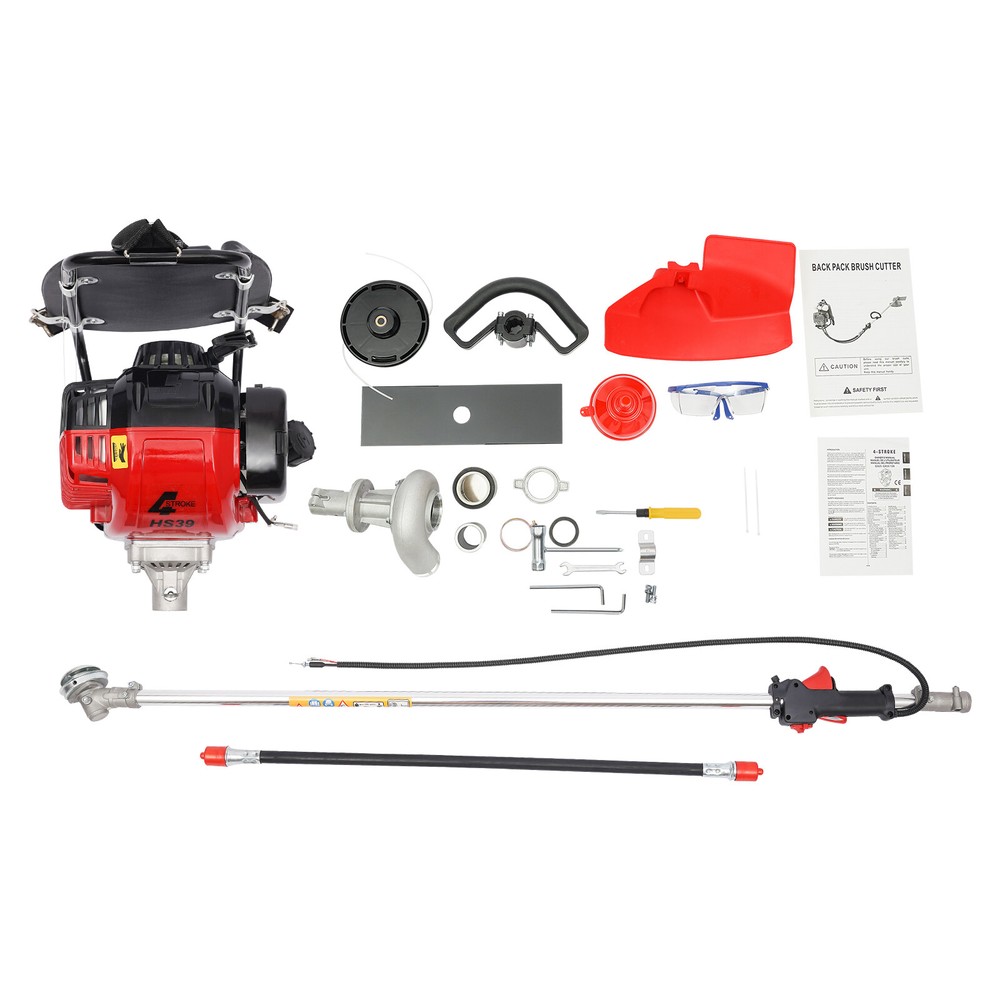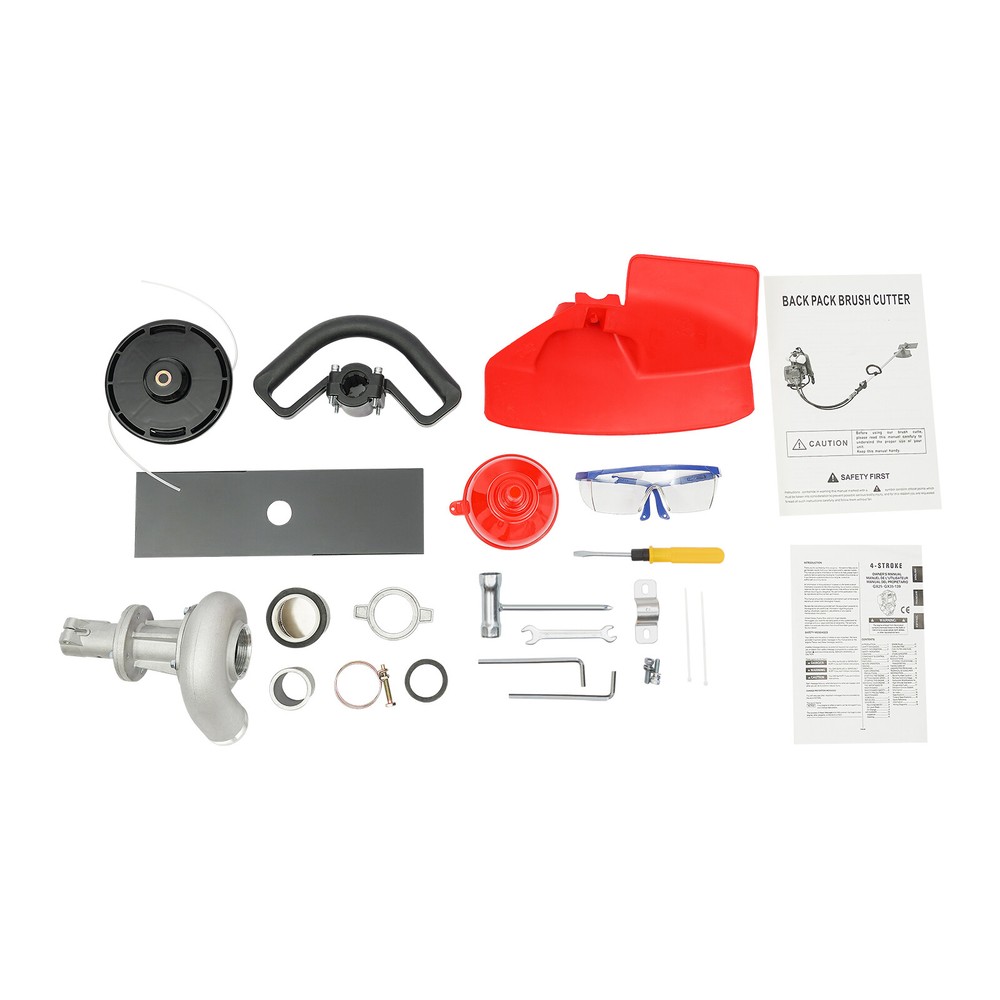 31CC 4-stroke Backpack Gas Garden Brush Cutter Grass Trimmer Lawn Mower+Pumping Backpack 4 Stroke Brush Cutter Tiller Grass Hedge Trimmer Lawn Mower Weed Wacker Description Are you looking for an efficient and durable backpack brush cutter? This product will win your favor! High-quality materials, high-power, and pumpable design for water can meet your daily needs for trimming and irrigating lawns. The lever and locking button make it easier and safer for you to operate, ensuring high working efficiency and security. This will be an ideal product for you! Key Features Sturdy and Durable : The high-quality aluminum, steel, nylon, and PP are strong and sturdy, resistant to corrosion and rust, making this item withstand high-strength use, ensuring sufficient durability. Strong Power : This product uses a sharp blade and a single-cylinder air-cooled four-stroke gasoline engine with a strong power of 750W to rotate the trimmer head at 8500rpm, making it efficient and high-quality complete lawn mowing work, delivering reliable results. Easy to Operate : The widened lever handle and hand-pull starter allow you to easily pull 1-3 times to start the machine. The extended and flexible rod can reduce usage restrictions. The throttle button can be used to adjust rotation speed, meeting your various needs. The throttle positioning button can increase the throttle by a maximum of 70% during extreme weather or when the engine is difficult to start due to heat, providing you with more convenience. Safe and Reliable : Multiple heat dissipation holes and the air-cooling model are designed for the timely discharging of heat, protecting the machine from breakdown. The safety lock of the throttle valve can avoid accidental contact with the throttle valve to cause sudden engine acceleration, so you press the safety lock to pinch the throttle valve for acceleration, greatly improving the safety of use. Considerate Design : The shoulder straps and backrest are filled with sponge to make them softer and more comfortable, reducing fatigue during prolonged use. The ergonomic grip makes your operation smoother and more labor-saving, providing you with more convenience. The air filter can effectively filter impurities and reduce damage to the machine, and the built-in silencer can effectively reduce noise and bring you a quieter operating environment. 2 in 1 Design : This product can not only be used for lawn mowing, but also for timely irrigation of your garden by replacing it with the water pump without the need to purchase additional irrigation tools, making lawn maintenance easier. Strong Stability : The various parts of the product are tightly connected, and the transmission is stable, greatly reducing the vibration problem during use. The three springs on the bottom bracket can reduce vibration and form a stable triangular support, ensuring a more stable operation. Cost-saving : The high-quality pump-film carburetor allows fuel to fully burn and convert into kinetic energy, greatly improving performance and saving your costs. Horizontal pumping design eliminates the need for water diversion, and you just need to directly put it into the water source and start the engine fuel door to pump water. Easy to Carry and Store : The compact size of 12.99*12.59*16.53 inches, detachable, and backpack design allows you to easily take it anywhere and store the product. Effortless to Assemble : The simple construction, complete accessories, and clear English instructions help you achieve a quick and easy assembly, and you just need to make sure all parts are properly and tightly nested. Details Baffle and Goggle : The baffle can prevent weeds from splashing around, while the goggle can prevent them from entering the eyes, providing you with dual protection. Fuel Tank : The 27.5oz fuel tank effectively reduces frequent refueling and fully meets the needs of outdoor work. The semi-clear design also makes it easy for you to view surplus and add in a timely manner. Application It is suitable for weeding glass and pumping in parks, residential buildings, shopping malls, lawns, pastures, farmlands, etc. Specification Material: Aluminum, Steel, Nylon, PP Color: Red, Black Style: Modern Fuel: Gasoline Power: 750W Rotation Speed: 8500rpm Displacement: 31cc Oil Tank Volume: 80ml/3.38oz Fuel Tank Volume: 650ml/27.5oz Carburetor Type: Pump-film Type Engine Type: Single Cylinder Gasoline, Air-cooled, 4-Stroke Assembly Required: Yes Mount Type: Shoulder Carrying, Free Standing Flexible Shaft Length: 88cm/34.64in Rod Length: 153cm/60.23in Engine Size: 33*32*42cm/12.99*12.59*16.53in Engine + Pump: Gross Weight: 11kg/24.3 lbs Package Size: 32*30*40cm/12.6*11.8*15.7in Rod: Gross Weight: 4kg/8.8lb Package Size: 153*11*11cm/60*4.3*4.3in Package Included 1* Backpack Brush Cutter 2* English Instructions 1* Funnel 1* Goggles 2* Allen Keys All Accessories for Assembly Notes We send the engine and water pump, and rod separately to protect the product from damage during transportation. Please wait patiently for all parts to arrive. Please read the manual carefully and pay attention to the safety precautions inside. This product uses a four-stroke motor, so please use specialized four-stroke gasoline to avoid machine damage. Before starting the machine, please ensure sufficient fuel in the fuel tank. It is recommended to replace every 20 working hours. After starting, let it run at low speed for 3-5 minutes for sufficient preheating to better protect the engine. During preheating, please speed up properly to check whether the trimmer head is normal and whether there is abnormal noise, and please turn off the engine to check whether the shutdown switch function is good and effective. Please ensure the nylon rope extends 5-10cm. It may become shorter due to wear and tear after a period of use. You only need to lightly tap the trimmer head on the ground, and the nylon rope will automatically swing out and extend. You can repeatedly tap it several times 