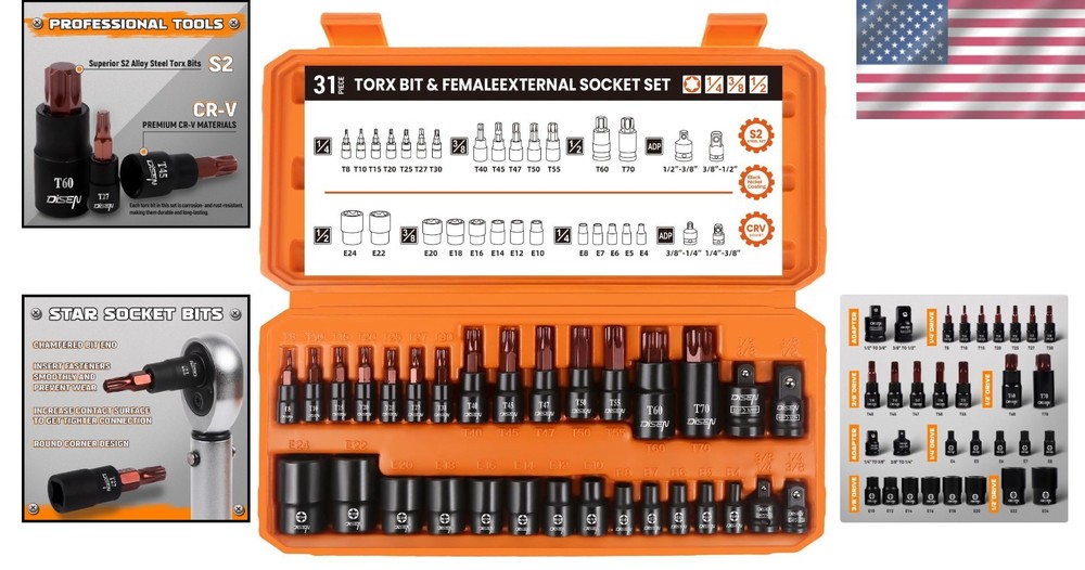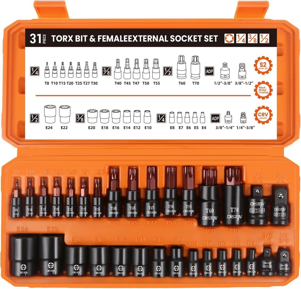 31-Piece Torx Bit Socket Set Alloy Steel Impact Adapter for Automotive ‹ › ‹ › ‹ › ‹ › ‹ › ‹ › ‹ › ‹ › ‹ › 31-Piece Torx Bit Socket Set Alloy Steel Impact Adapter for Automotive Features: Materials: Crafted from S2 alloy steel and chrome vanadium steel (CR-V), this Torx socket set boasts increased torque and hardness, ensuring durability for every task. Comprehensive Set: Includes 14 solid star Torx bits ranging from T8 to T70, and 13 female E-Torx bits (E4 to E24), along with a 4-piece impact-grade adapter and reducer kit, making it the ultimate toolkit. Adapter Versatility: Features a range of socket adapters (1/4"(F) to 3/8"(M), 3/8"(F) to 1/4"(M), 3/8"(F) to 1/2"(M), 1/2"(F) to 3/8"(M)), accommodating a variety of tasks with ease. Clear Identification: High-contrast laser markings allow for quick size identification, ensuring you can work efficiently in any lighting conditions. Each piece is also corrosion- and rust-resistant for prolonged use. Convenient Storage: Comes with a blow-molded carrying case that offers easy transportation, safe storage, and quick organization of your tools. Benefits: Enhances your tool collection with high-quality, high-durability bits, perfect for automotive work. Durable construction ensures long-lasting performance, even under tough conditions. Versatile adapters make it easier to handle different tasks, saving you time and effort. Compact case design makes it easy to keep everything organized and portable. High-visibility size markings maintain productivity in fast-paced environments. Why Choose Our 31-Piece Torx Bit Socket Set? Upgrade your toolkit with a set that combines comprehensive utility and unmatched durability. Our 31-Piece Torx Bit Socket Set is engineered not just for tasks around the home, but specifically for professionals and enthusiasts looking for reliable performance in demanding automotive applications. The superior materials, thoughtful design, and portable storage make this set an essential addition to any workshop. Don’t settle for less! Elevate your projects by acquiring our high-performance Torx Bit Socket Set today! Shipping Free & Fast Shipping - We offer free shipping to most of the USA with a normal delivery time of 3-7 days. However, due to the current situation, additional delivery time (up to 3 weeks) may be required for some items. Alternative Carriers - We may use alternative carriers (e.g. USPS, FedEx, UPS, etc.) to ensure your package arrives safely and on time. Due to the use of multiple carriers, we are unable to provide a tracking number automatically. Handling Time - Orders are processed and shipped within 1-2 business days of receiving cleared payment. Shipping Restrictions - Shipping to Alaska, Hawaii, Puerto Rico, Guam, and other US territories may incur shipping charges or delivery restrictions. Please contact us before ordering, or your order can be refunded/cancelled. State Restrictions - There may be restrictions based on your state of purchase. For example, certain items may not be shipped to California due to state regulations. Contact for Tracking Updates - If you require tracking updates or have any concerns about the delivery of your order, please feel free to contact us, and we will be happy to assist you. Return 30-Day Hassle-Free Returns - We want you to be completely satisfied with your purchase. If you are not, you can return the item within 30 days of receiving it for a full refund or exchange. Easy Return Process - To start a return, simply contact us and we will provide you with a prepaid return shipping label and detailed instructions. Restocking Fee - There are no restocking fees for returns. However, the buyer is responsible for return shipping costs if the return is not due to a seller's error. Refund Processing Time - Refunds will be processed within 5 business days of receiving the returned item in its condition. Payment We accept all major credit cards, PayPal, and Apple Pay for your convenience. Your payment information is secure and encrypted to ensure a safe and seamless transaction. Please complete your payment within 3 days of purchase to avoid any delays in shipping. Feedback Your feedback is extremely important to us. We strive to provide the best products and customer service possible. If you are satisfied with your purchase, please take a moment to leave us a positive review. If you have any concerns or issues with your order, please contact us before leaving negative feedback. We are committed to resolving any problems and ensuring your satisfaction. Contact Us If you have any questions or concerns, please feel free to out to our customer support team. You can contact us through the eBay messaging system. We are available Monday to Friday, 9:00 am to 5:00 pm EST, and we will do our best to respond to your inquiry within 24 hours. Buy it now and enjoy a pleasant shopping experience! Manufacturer Part Number: Torx Bit Socket Set Unit Quantity: 31 Tools Included: Impact Socket Adapter,Reducer Kit Size: 31pcs torx bit socket,Solid Star T8,T10,T15,T20,T25,T27,T30,T40,T45,T47,T50,T55,T60,T70,Female E-Torx (E4),(E5),(E6),(E7),(E8),(E10),(E12),(E14),(E16),(E18) Socket Type: Impact Drive Type: Torx Drive Size: 1/4in. Surface Finish: Polished Number of Pieces: 1