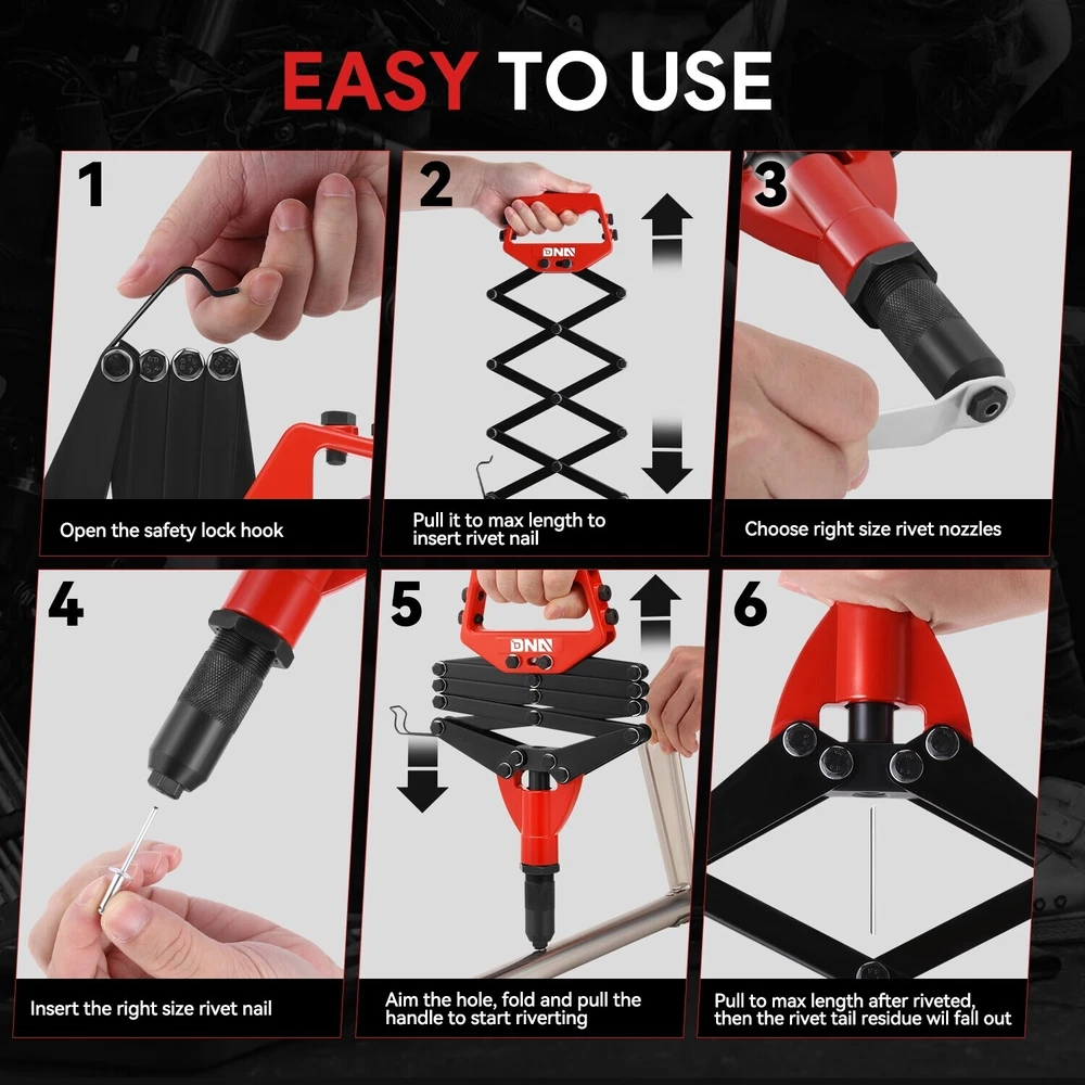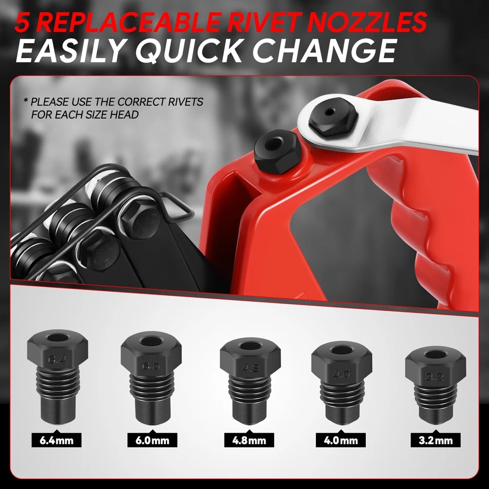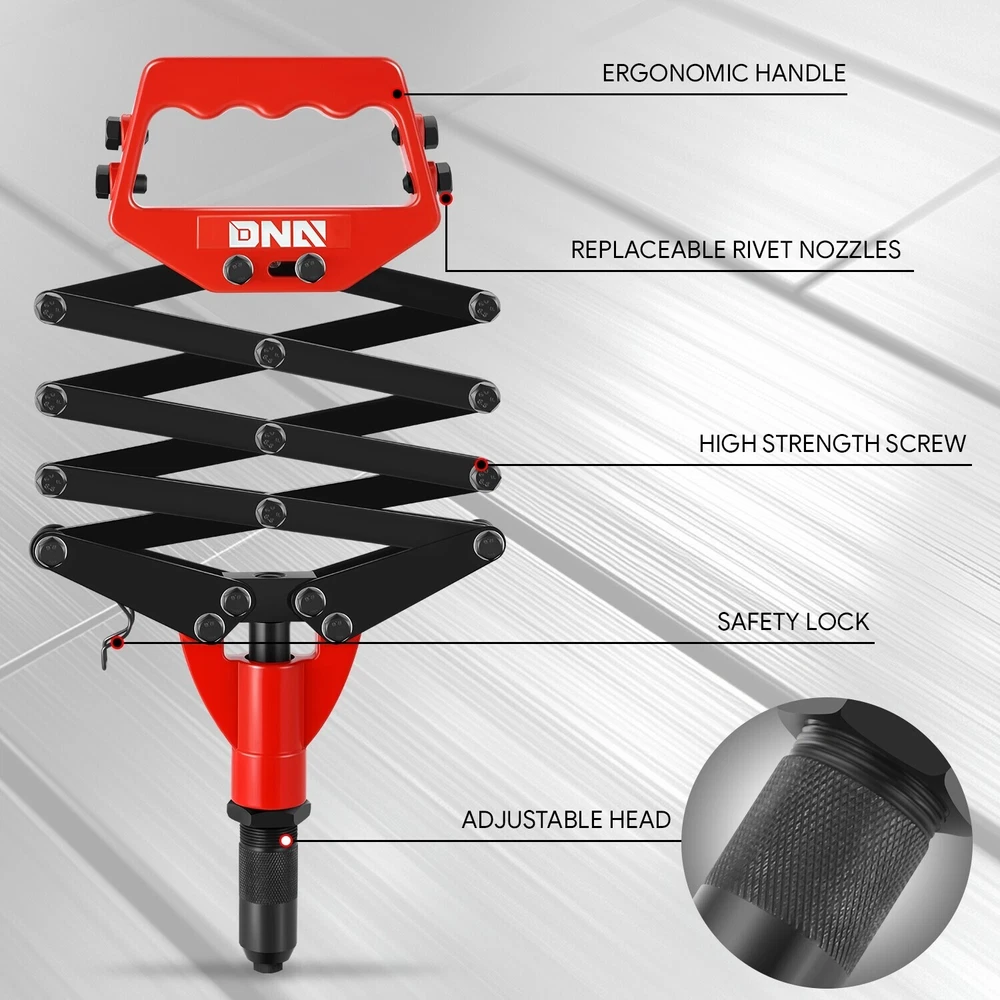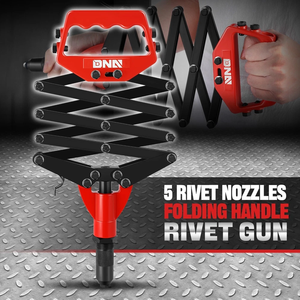 Tools Included: 5 Guide Nozzles, Wrench, Hand Rivet Product Dimensions: ‎12 x 7.5 x 1.8 inches Type: Hand Riveter Set Superseded Part Number: SDD-TOOLS00568 Exterior: ‎Stainless Steel Finish: Powder-Coated Features: Foldable, Portable Number of Pieces: 7 Manufacturer Part Number: SDD-TOOLS00568 Case Included: No Guide Nozzle Size: 3.2 mm, 4 mm, 4.8 mm, 6 mm, 6.4 mm OE/OEM Part Number: SDD-TOOLS00568 gtin13: Does not apply Color: Red / Black Brand: Speed Daddy Interchange Part Number: SDD-TOOLS00568 UPC: Does not apply