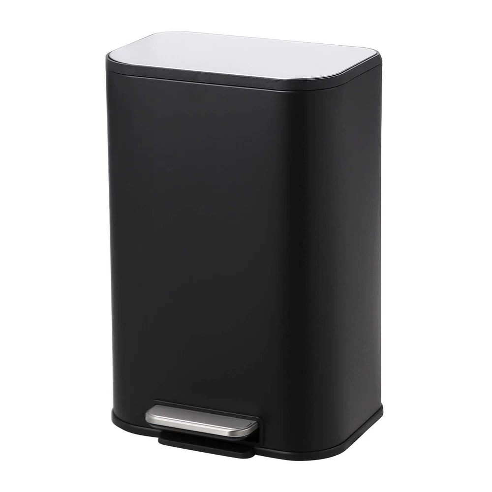 We have three sizes of 12L, 20L, and 30L trash cans for you to choose from and three colors of black, white, and stainless steel. Sleek Modern Design: This garbage can features stylish rectangular shape and smooth lines, allowing for placement against a wall or cabinet. Its 12-liter capacity makes it ideal for use in bathrooms and smaller spaces Matte Black Finish: Crafted from robust stainless steel, featuring a stainless steel lid and foot pedal and a matte black -coated body, this trash can boasts a fingerprint-resistant and scratch-proof exterior that is effortless to clean and maintain Silent Close Lid: Designed for a slow, gentle closure, the trash can lid avoids slamming shut, ensuring a quiet and elegant experience every time Convenient Foot Pedal: Our user-friendly foot pedal design eliminates the need for bending or touching the trash can. The foot pedal is located at the bottom, and you can easily open the lid with a light step Removable Inner Bucket: Equipped with a plastic inner bucket, this trash can facilitates easy waste disposal and garbage bag . The top hole securely holds the trash bag in place, enhancing convenience and functionality
