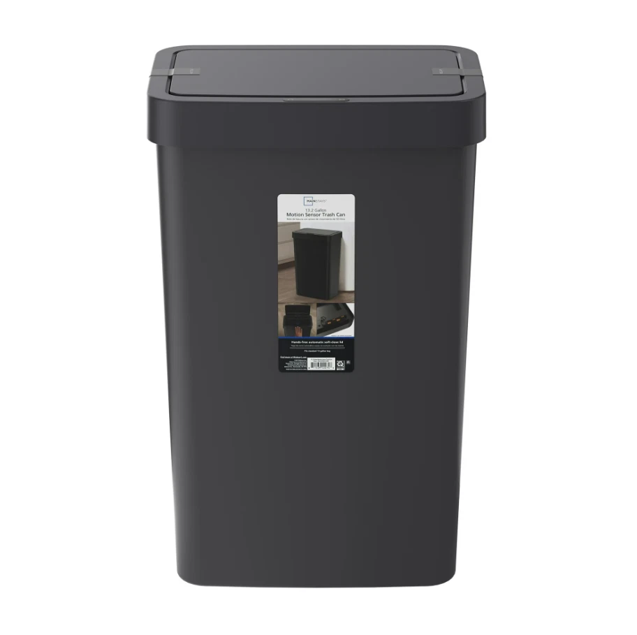 The 13.2 Gallon Plastic Motion Sensor Kitchen Trash Can is perfect for large families or busy environments. The touchless operation allows for improved cleanliness and hygiene, this trash can operates with hands-free motion sensing technology. Simply wave your hand above the sensor at the front of the lid to open it automatically. The creative lighting system counts down to the soft close of the lid for a quiet user experience. Perfectly sized to accommodate any standard 13-gallon trash can liner, this durable plastic resin garbage can also features soft touch buttons for manual operation. The rectangular design and all black finish makes this the ideal garbage can for use in the kitchen, office, laundry room or any other area of the house where you need the convenience of a touchless trash disposal. Motion Sensor Technology: Touch-less motion sensor trash disposal Hands-Free Operation: Uses 4 AA alkaline batteries (not included) Built-In Bag Fixer: Helps secure the trash bag in place Air Vent On Back: Allows easier removal of full trash bags Soft Open & Close: No flying open or slamming shut Manual Option: Soft touch buttons allow user to operate the product manually when desired No Special Orders: Uses standard 13G kitchen trash bags Why You'll Love It: Hands-free convenience at a fantastic price