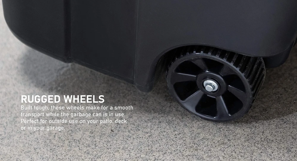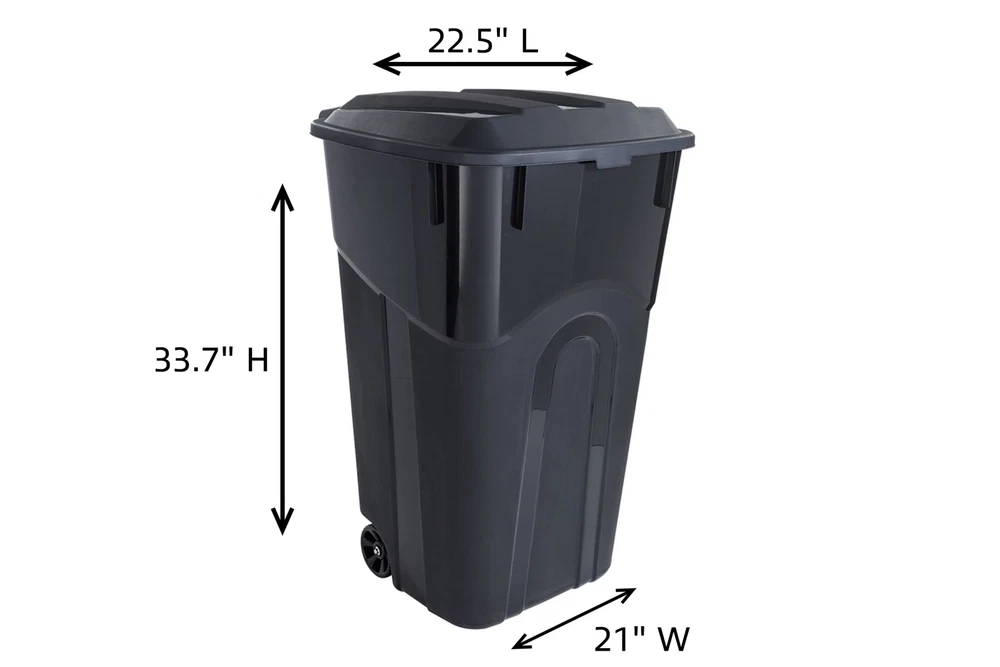 This 32 Gallon Trash Can with wheels and attached lid is perfect for heavy loads and a wide variety of contents. Use it as a trash or recycling bin. It is ideal for use indoors, outdoors, in the garage, basement, and everywhere in between. ' 32-gallon trash cans are strong, durable, sturdy and reliable. With a securely attached lid, you can feel confident that its contents are safe and secure. Tote the large trash can with lid around on its rugged wheels. With the capacity of 64 pounds, you can load it up and easily transport this big trash can with the ergonomic handle. Constructed with heavy duty polypropylene and high-quality construction, this garbage can with lid is ideal to endure extreme temperatures and rough use. Capitalize on its versatility, and use this trash can in your basement, kitchen, garage, back yard, and more. Product Dimensions – 22.5” L x 21” W x 33.7” H. Securely Attached Lid – With the attached snap lock lid, this trash can will make it simple to place trash inside and keep it there. Leave this trash can with lid in your driveway backyard and know that everything is secure, even in windy conditions. Heavy Duty Handle – Make transportation effortless with the comfortable and easy to grip handle on this black trash can with wheels. Paired with the integrated wheels, getting this 32 gallon trash can to the curb and back has never been easier. Rugged Wheels – Built tough, these wheels make for smooth transport while the garbage can is in use, making this perfect for outside use on your patio, deck or in your garage. Tote this trash bin wherever you need it to go without having to lift it. Withstand the Elements – This outdoor trash can is with heavy-duty polypropylene and durable construction to endure extreme temperatures and rough use. The large bin on wheels is impact resistant and can be trusted on rough terrain and smooth ground. Multiple Uses - The sleek design and size of this black trash can make it a versatile addition to any space. Perfect for use in the garage, on the patio, or at the office. Use it as a dog food bin, recycle bin, deck storage container, and more.