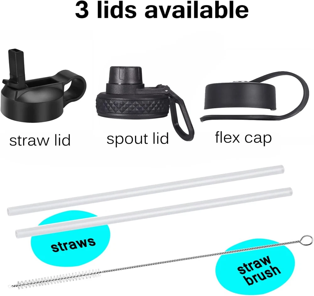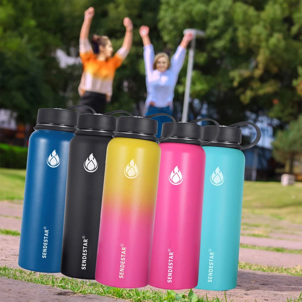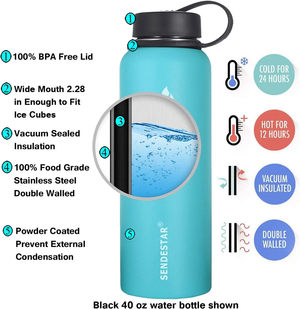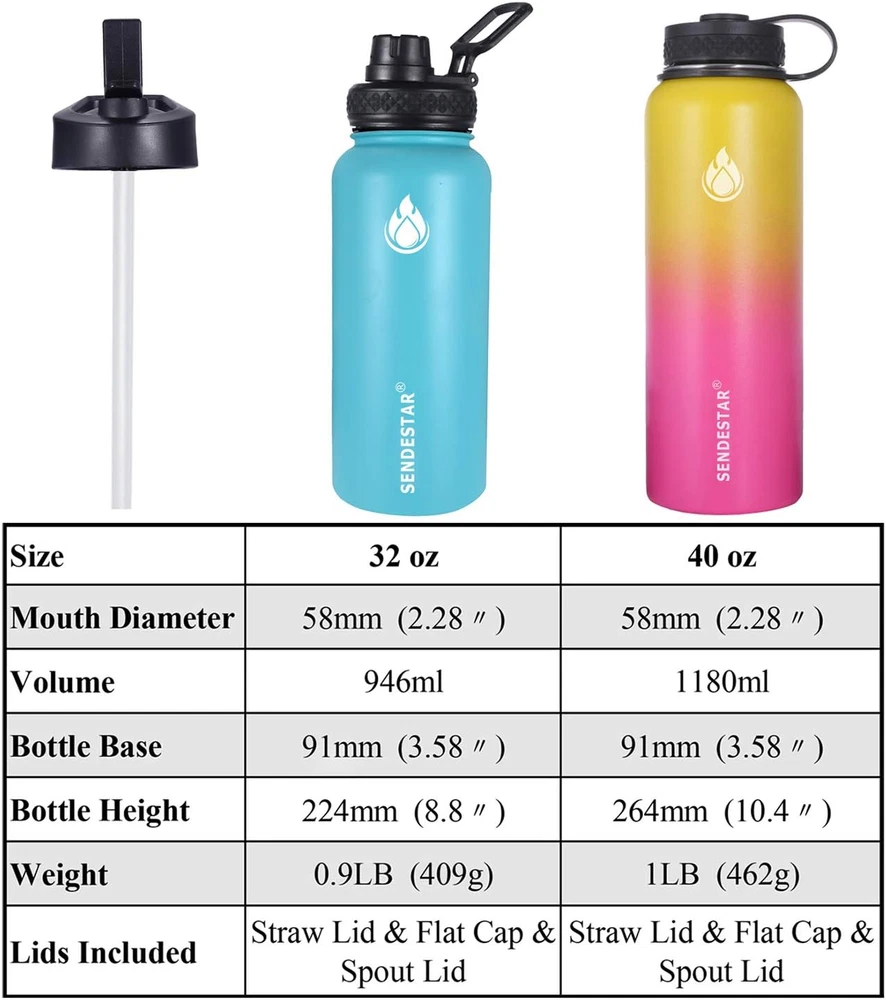 Store New Arrivals Add to Favorite View Feedback Contact 32 Oz Double Wall Vacuum Insulated Leak Proof Stainless Steel Sports Water Bottle—Wide Mouth with Straw Lid & Flex Cap & Spout Lid (Sky Blue) Description Capacity 2 Pounds Number of Items 1 Color Mint Material Stainless Steel Material Type Stainless Steel Cap Type Flex Cap With Lid Yes Special Features Leakproof, Double Wall Included Components Lid, Straw Special Feature Leakproof, Double Wall Product Care Instructions Hand Wash Only The water bottle is double-walled and made from high quality food grade 18/8 stainless steel that will not break. The exterior of the vacuum sealed area is dipped in copper for added insulation. Copper reduces the transfer of temperature, adding even more insulation to your bottle. Wide mouth makes it easy to clean, BPA-free lid which means they are very secure. 3 lids can be switched at any time, the Spout Lid is perfect for the beach, camping, the Flex Cap fit for office and hiking, while the Straw lid is suitable for cycling and road trip. Take this easy to carry portable water bottle while hiking, biking, shopping or leave it at the office. While sitting anywhere in any temperature condition, your cold drink will stay perfectly chilled up to 24 hours or your coffee or tea will keep hot for up to 12 hours. The insulated water bottle is a great gift for any occasion. Choose between the most popular and durable powder coated colors on the market, The Powder Coat works with the premium insulation, which inhibits condensation from forming on the outside of the bottle, to give you exactly what you want in an everyday refreshment delivery system. What You Get: SENDESTAR Water Bottle, Straw Lid, Flex Lid, Spout Lid, 2X Straws, and friendly customer service. Product Description SENDESTAR is a professional water bottle manufacturer and designed for the most adventurous outdoor activities. We are always trying to offer better and better product quality and servicer for every customer who trust in us In order to improve the customer's product experience, we have designed different lids and color options for you to choose from. 3 lids ( sport lid, screw-top lid and new desiged straw lid) and 2 lids ( sport lid and our new designed hotsale wide 360° rotating flexiable straw lid) Our Stainless vacuum water bottle is double-walled and made of high quality food grade 18/8 stainless steel that will maximize strength and integrity. The exterior of the vacuum sealed area is dipped in copper for added insulation. Copper reduces the transfer of temperature and keep your liquid hot or cold longer than your expected. Multiple colors to choose Straw lid, spout lid and screw-top lid options 3 lids can be switched at any time, the Spout Lid is perfect for the beach, camping, the Flex Cap fit for office and hiking, while the Straw lid is suitable for cycling and road trip. Do not put the lid in Oven, Microwave, Fridge or dishwasher to avoid damage. Please do not over-tighten the lid and do not force it open. Please make sure that the internal rubber seal correctly lines up within the cap lining before use to avoid leakage. Stainless Vacuum Bottle with 3 different lids to keep Liquid Hot and Cold for hours Package Content SENDESTAR Stainless Water Bottle(Wide mouth) Package includes: 1 x Vacuum Flask, 3 x different Lids, 2 x straws, 1 x Cleaning Brush Condition: 100% Brand New Item Type: Drinkware Drinkware Type:Vacuum Flasks & Thermoses Theme: Outdoors&i Indoors Color: Pink, Pink+Yellow,Mint/Cobalt, Sky Blue, Cobalt, Black, Day&Night, Tiffany blue & Dark blue Cup Surface: Powder Coating Material:18/8 Stainless Steel Water Bottle, BPA Free Leak Proof Lid Volume: 32oz or 40oz Diameter: 3.5inches Weight: 546 grams for 32oz and 599 gram for 40oz Double-Wall insulated Vacuum Bottle leak proof and food grade safety Patent new flex straw lid Rotating straw lid especially for kids 2 lids option especially the new designed flex straw lid is Easy to carry, perfect for any outdoor activity. The Silicone tape is tested to a breaking point/tensile strength of 100 lbs. Comfortable to carry full bottle of Water, One of the best options. Spout lid is perfectly for outdoor family or friends party. All our lids can fit in hydro flask or most wide mouth water bottles suche size 12oz, 18oz, 21oz, 24oz, 32oz, 40oz and 64oz wide mouth If you have any question about any of our item, our servicer team will provide you a satisfacttion service for you. Insulated water bottle with 2 different lids to keep your water cold in summer and hot in winter Package Content SENDESTAR Vacuum Water Bottle(Wide mouth) with coopper inside of the inner wall Package includes: 1 x Vacuum Flask, 1 x Straw lid, 1xSpout Lid, 2 x straws, 1 x Cleaning Brush Size: 18oz, 24oz, 32oz, 40oz, 64oz and 87oz Diameter: 18oz and 24oz 2.9 inches can fit in the car cupholder , 32oz and 40oz with 3.5 inches, 64oz and 87oz with 4.9inches Colors: Black, Gray, Ombre yellow and pink, Tiffany blue and dark blue ombre, Light pink, Tiffany blue, purple, light pink, etc Before first use wash with detergent to completely clean the products, then rinse and dry. It comes with two separate straws that can be cut to fit your wide mouth Water Bottles. Please do NOT store sugary drinks in the water bottle for more than 24 hours. Vacuum insulated Spout lid offers the ultimate combination of wide mouth convenience provides for easy, one handed drinking. Easy carry wide loop handle for all day carrying comfort and durability. Hinge lock keeps cap out of your way while drinking. The Spout Lid is perfect for the beach, camping Flex new straw lid design This water bottle designed for the most avid sports enthusiasts. Whether you are camping, hiking, kayaking, or rock climbing. the insulated water bottle is a great gift for any occasion. The straw lid also fits the 12 oz 16 oz 18 oz 32 oz 40 oz and 64 oz Hydro Flask wide mouth Water Bottles. NOTE: Except for 40 oz. The straws must be cut to fit your other