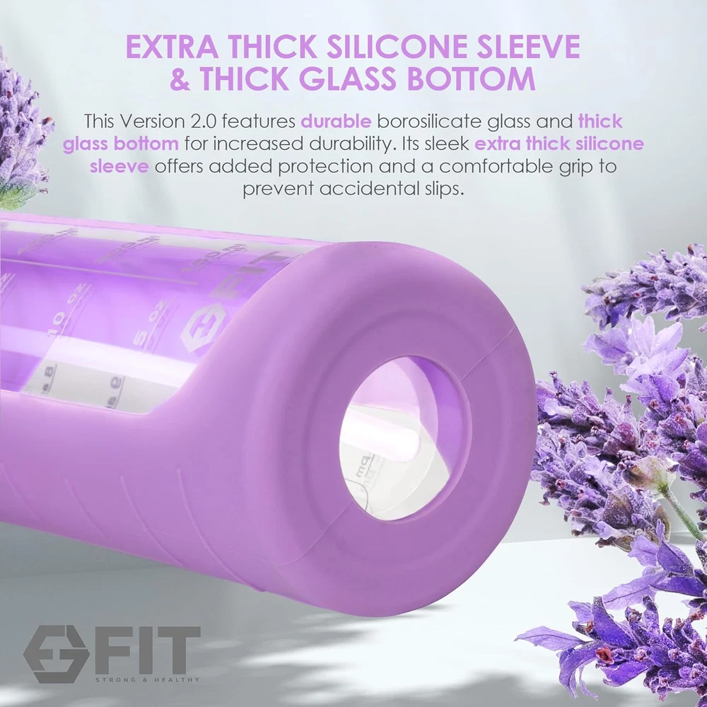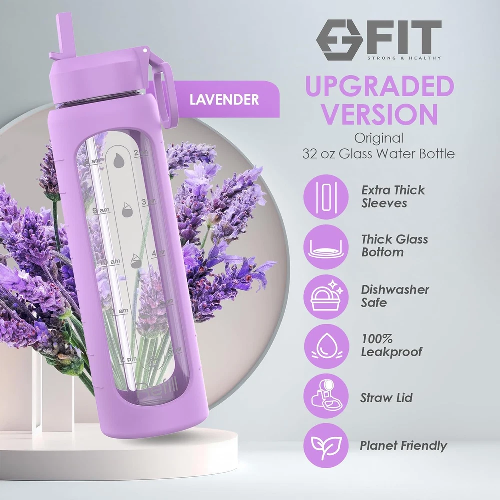 Store New Arrivals Add to Favorite View Feedback Contact 32 Oz Glass Water Bottle with Time Marker & Silicone Sleeve - W/Handle & 2 Leakproof Lids Straw & Spout Lid, Wide Mouth, BPA Free 1 Liter Motivational Drinking Bottle, Lavender Description Item model number WaterBottle_32_Lavander Style Colorful and Silicone Sleeve Bottle Type Wide Mouth Glass Bottle, Wide-Neck Capacity 32 Fluid Ounces Number of Items 1 Country of Origin China Theme style" or "design Unit Count 1.0 Count Batteries required No Material Borosilicate Glass Age Range (Description) Adult Package Information glass Finish Type Clear Glass Bottle Specific Uses For Product Home, Office, Outdoors, Gym, Yoga Studio, College, Travel, Camping, Beach/Pool, Road Trips Included Components Extra Lid, Water Bottle with Silicone Sleeve Reusability Reusable Model Name Glass Water Bottle - Upgraded Item Weight 1.61 pounds Material Type Free Bisphenol A (BPA) Free Special Feature Carrying Loop, Leakproof, Wide Mouth, BPA Free, Time Marker Color Lavender Sleeve Shape Round Recommended Uses For Product Work, Fitness Finish types Clear Glass Bottle Product Dimensions 3"W x 11"H Product Care Instructions Hand Wash Only UPGRADED DESIGN & VERSATILE STYLE: Equipped with two wide mouth lids: a flip-up straw lid and an easy-twist spout lid, allowing for one-handed or hands-free sipping when you’re busy or on the go. Features an extra-thick silicone sleeve for added protection and a secure grip. The durable borosilicate glass construction is perfect for home, gym, or office, while the removable sleeves come in a variety of colors, letting you express your personal style STAY HYDRATED ALL DAY WITH EASE: Designed to support your daily hydration reminders, this 32 oz glass water bottle includes time markers and precise measurements printed directly on the bottle. Refill just once and stay hydrated throughout your day, whether you’re at school, work, or the gym. Choose a reusable option that reduces single-use plastic waste while keeping you stylishly hydrated wherever you go CONVENIENT STRAW & WIDE-MOUTH DESIGN: This 32 oz wide mouth glass water bottle is easy to clean and perfect for effortless filling and ingredient additions. Easily add ice cubes, fresh fruits, or use as protein shaker to create refreshing blends or smoothies. The upgraded flip-up straw lid ensures easy, spill-free sipping for hydration on the go, making it an ideal companion for workouts, travel, or busy days PURE TASTE & TRANSPARENT DESIGN: Crafted from premium borosilicate glass for a clean, fresh drinking experience without any plastic aftertaste. The crystal-clear design lets you easily track your beverage levels while the dishwasher safe bottle (excluding high-heat settings) ensures effortless cleaning. Handle with care to enjoy its long-lasting durability TWO LIDS FOR FLEXIBILITY & CONVENIENCE: Includes two interchangeable lids: the straw lid for easy sipping and a twist spout lid for controlled flow. Switch between lids to suit your activity, from gym sessions to relaxing at home. The extra lid ensures long-term usability, making this bottle a reliable companion for daily hydration Product Description 1 Wide Mouth 2 Durable and Stylish 3 Keeps You Motivated 4 Extra Lid 5 Precaution The video showcases the product in use. The video guides you through product setup. The video compares multiple products. The video shows the product being unpacked. Can I wash the bottle and the lid in the dishwasher? Yes, you can. Please let all the parts of the bottle to cool off and completely dry before screwing the lid on the bottle to prevent it from getting stuck. Does it come with a neoprene carrier and a silicone sleeve as shown in the video? if not, where can it be purchased? We offer 3 combinations: 1. Glass Water Bottle with a Silicone Sleeve only, 2. Glass Water Bottle with a Silicone Sleeve and a Neoprene Carrier with a shoulder strap, and 3. Glass Water Bottle with a Silicone Sleeve and a Brush. Is this bottle made out of glass or any other material? The bottle is made out of borosilicate glass. The lid is plastic. What will happen if I drop the bottle? This is a glass water bottle and, like any other glass product, if dropped, it would most likely break. PLEASE BE MINDFUL OF IT AND DO NOT DROP THE BOTTLE. Check Out Our Other Products! Add to Cart Add to Cart Add to Cart Add to Cart Add to Cart Add to Cart Add to Cart Customer Reviews 4.3 out of 5 stars 3,878 4.3 out of 5 stars 190 4.6 out of 5 stars 8,594 4.6 out of 5 stars 8,594 4.6 out of 5 stars 8,594 4.7 out of 5 stars 2,407 4.6 out of 5 stars 220 Price $17.99 $ 17 . 99 $17.99 $ 17 . 99 $25.99 $ 25 . 99 $24.99 $ 24 . 99 $29.99 $ 29 . 99 $19.99 $ 19 . 99 $19.99 $ 19 . 99 Borosilicate Glass ✔ ✔ ✔ ✔ ✔ ✘ ✘ BPA FREE ✔ ✔ ✔ ✔ ✔ ✔ ✔ Reusable ✔ ✔ ✔ ✔ ✔ ✔ ✔ Leakproof ✔ ✔ ✔ ✔ ✔ ✔ ✔ Sustainable ✔ ✔ ✔ ✔ ✔ ✔ ✔ Extra Thick Sleeve ✔ ✔ ✘ ✘ ✘ ✘ ✘ Ribbed Sleeve Surface ✘ ✔ ✘ ✘ ✘ ✘ ✘ Straw Lid ✔ ✔ ✘ ✘ ✘ ✘ ✘ Extra Lid ✔ ✔ ✘ ✘ ✘ ✘ ✘ Plastic ✘ ✘ ✘ ✘ ✘ ✔ ✔ ABOUT US We offer the best prices around on high quality products. Our E-store includes media such as books, movies, music and games while offering electronics, toys, sporting apparel, clothing, tools, general home, garden items and more. SHIPPING We are always working hard to ensure your package arrives as soon as possible. Please understand that some factors like weather, high postal traffic, and the performance of shipping companies are outside of our control. We offer free shipping to the lower 48 states and ship within 2 business days of payment, usually sooner. We do not accept P.O. Boxes. Please provide a physical address. For shipping outside of the continental USA, we only use eBay's Global Shipping Program.The item is shipped to KY and then sent to the rest of the world. International customers are responsible for all duties and taxes. Continue