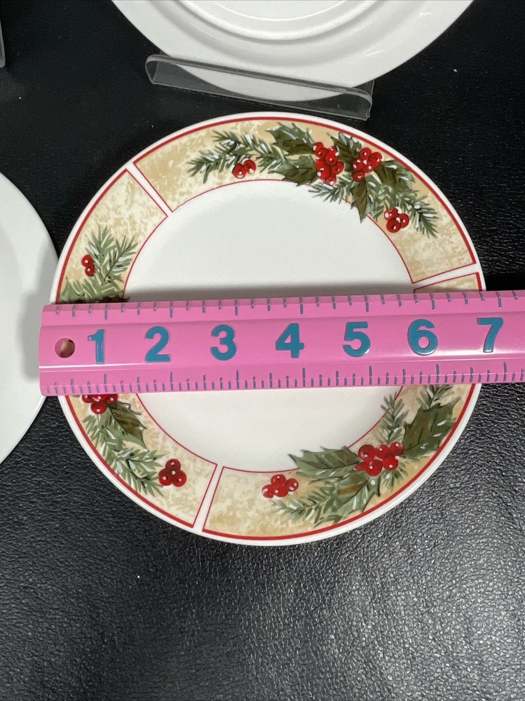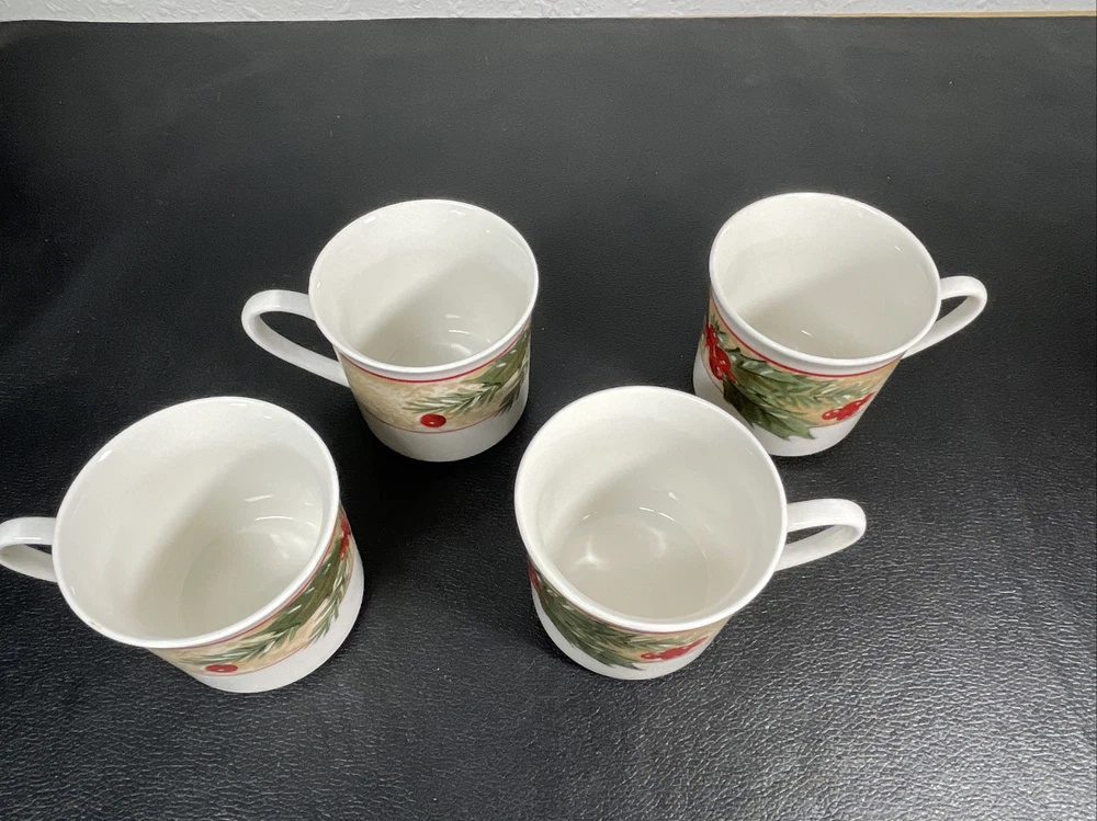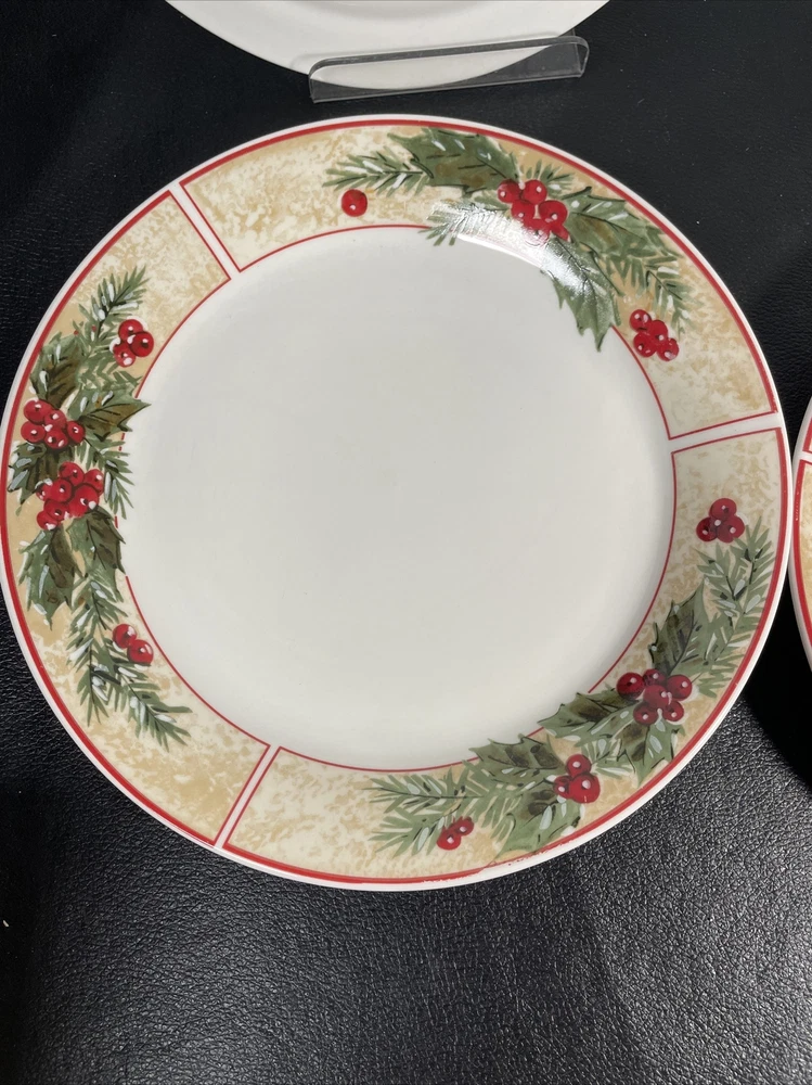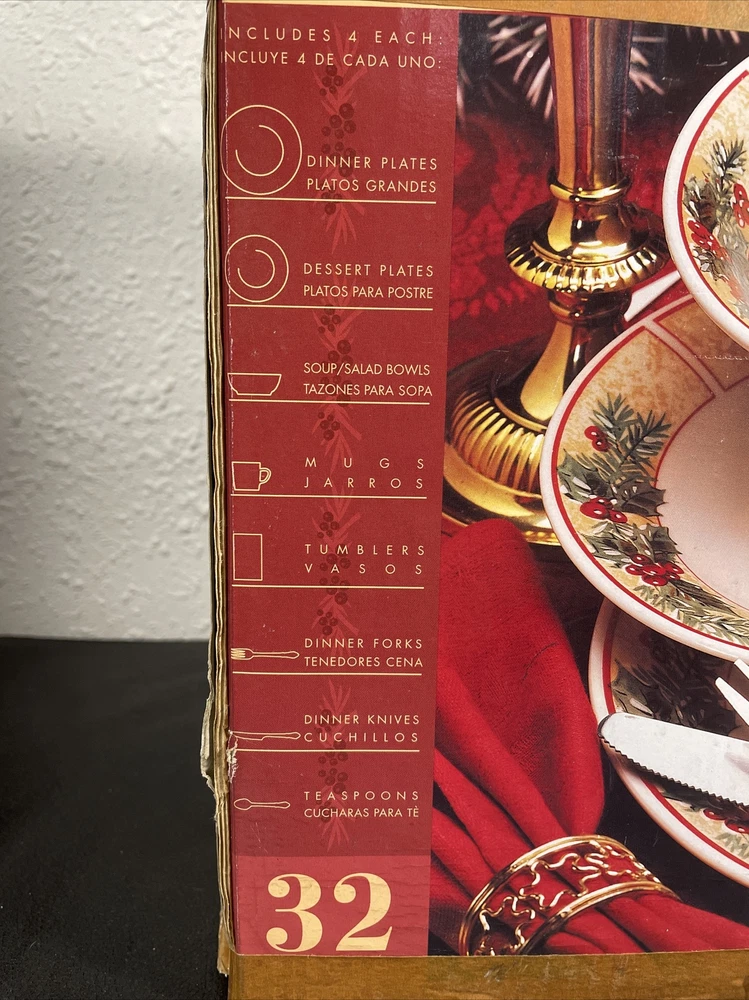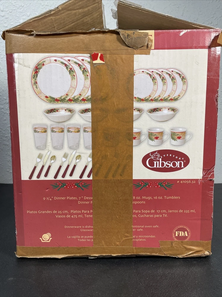 This is a 32-piece dinnerware set from Gibson, perfect for Christmas occasions. The set includes dinner plates, dessert plates, bowls, cups, knives, forks, and spoons, all featuring a Christmas mistletoe pattern with holly berries. The set is made of stoneware and comes with 16oz tumblers. It is designed for four place settings and is manufactured in China. We have 3 sets and of the piece that we have looked at show very little wear, utensil marks.