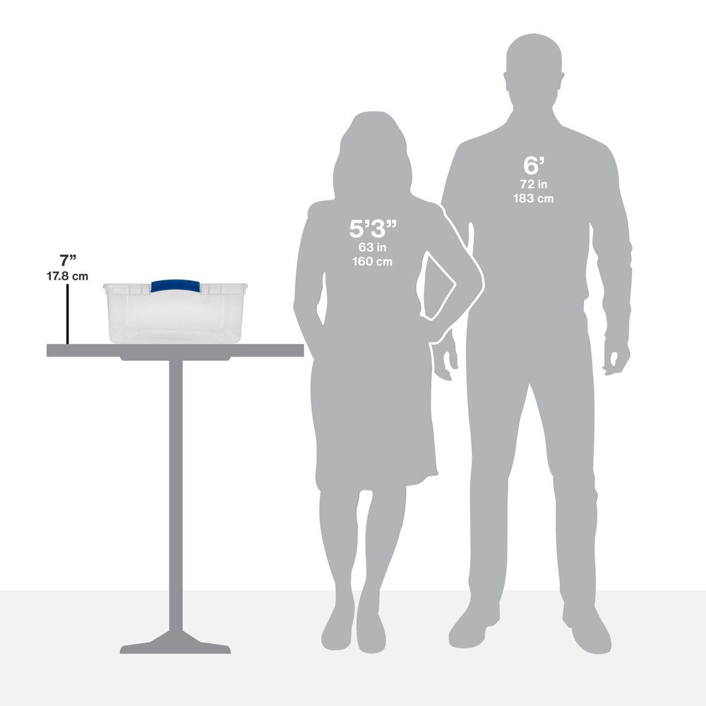About this item 32 Quart Latch Box, Clear Plastic Storage Bin with Clear Lid, Blue Outside Dimensions: 24" x 16" x 7" Interior Dimensions at bottom: 20 3/8" x 14 1/4" x 6 1/8" Clear lid and base for easy identification of contents from any angle Contemporary styling and shape to provide solutions to a variety of household storage needs Colorful latches secure lid to base, keeping contents safely stored inside Indexed lids allow for storage boxes to stack neatly on one another BPA-free and phthalate-free