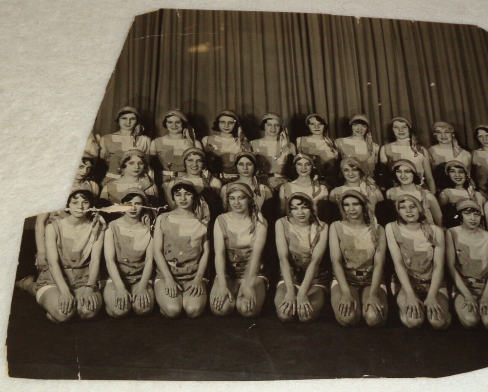 Antique Original The 32 Roxyettes Broadway Dancing Pre-Rockettes 1920s NYC Rare Historical Photo Photo of Russell E. Markert's Thirty-Two Roxyettes at the Roxy Theatre in New York City - Circa. Late 1920s. The Roxyettes later became the famous Rockettes. Measures approximately 6 5/8" x 9 1/8". Photo has uneven sides and has been cut. The left side has been cut significantly, and one of the women is not visible, while another is partially visible. The other edges and corners have also been cut. I don't know why. The right side corners are rounded. There is surface and edge tearing, a heavier tear on the left side of the image, surface scratches, creasing, discoloration and marks from age, handling and storage. There is some bowing to the photo as well. Measures need to be taken to historically preserve this classic image. On the reverse side, tape was placed across nearly the entire surface. Please see photos for more information on condition and ask any questions you may have.