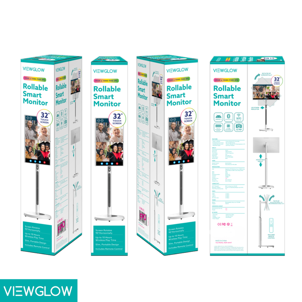The VIEWGLOW 32" Rollable Smart Monitor is a versatile and portable display solution, perfect for daily use. Its compact design and adjustable height/tilt make it ideal for multitasking, video conferencing, and streaming. The touch screen and remote control offer effortless navigation, while the rechargeable battery provides up to 15 days of standby time. Whether you're working, learning, or relaxing, this monitor seamlessly integrates into your daily routine, offering convenience, flexibility, and high-quality visuals. Its rollable design makes it easy to take anywhere, making it perfect for on-the-go productivity and entertainment. Use it to stream videos, TV, and more! VIEWGLOW 32" Rollable Smart Monitor Features: - 32-inch FHD IPS touch screen - Adjustable height and tilt - Remote control included - Portable design - Glides on wheels Specifications: - Screen Size: 32 inches - Resolution: 1920 x 1080 - Touch Panel: 10-point capacitive - Screen Ratio: 16:9 - Brightness: 250-300cd/m² - Colour Gamut: 16.7M, 100% sRGB - Refresh Rate: 60Hz Connectivity: - Wi-Fi: 802.11 a/b/g/n/ac 2.4G+5G - Bluetooth: Support Version 5.0 Audio: - Speaker System: Built-in 80.5Wx2 - Microphone: Noise Reduction MIC 6050 Power: - Rechargeable Battery: 14400mAh Lithium-ion 19.2.4Wh - Adapter: 18V/3A Dimensions & Weight: - Dimensions (H x W x D): 57.08 x 28.74 x 16.92 inches - Weight: 33.06 lbs