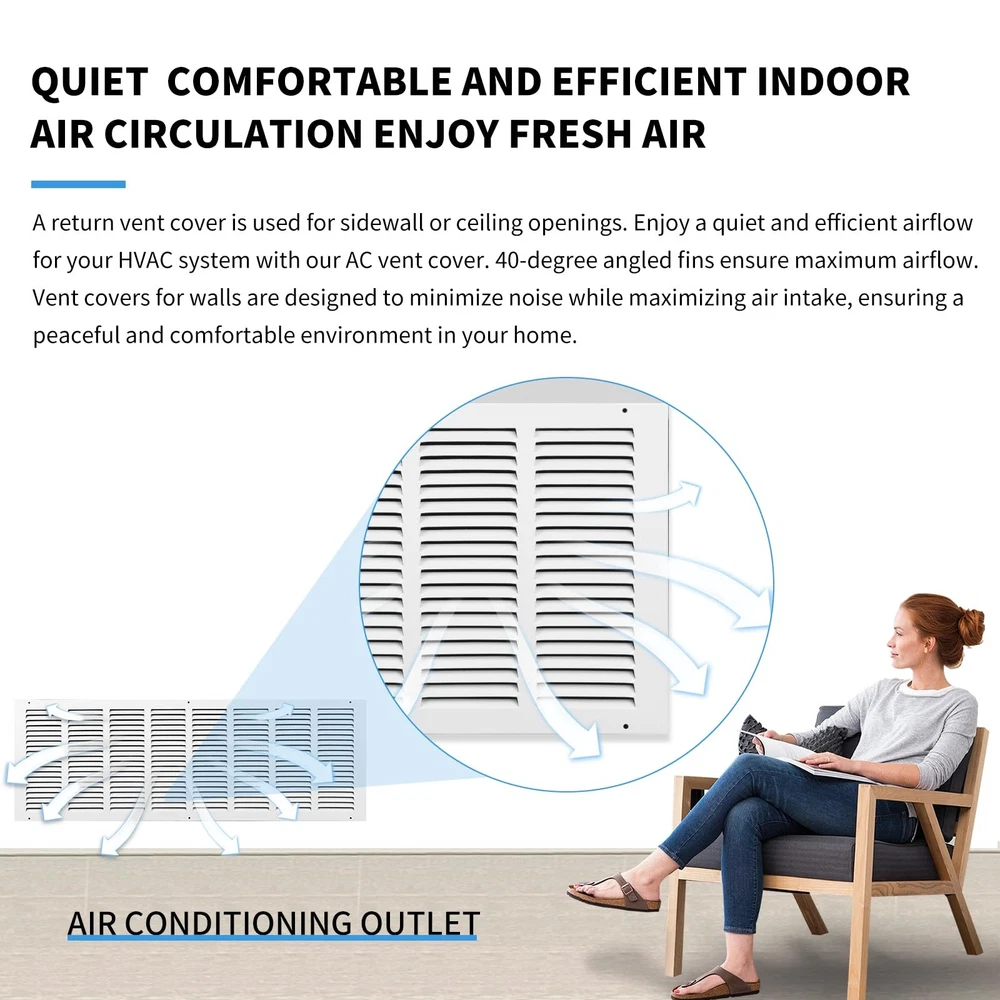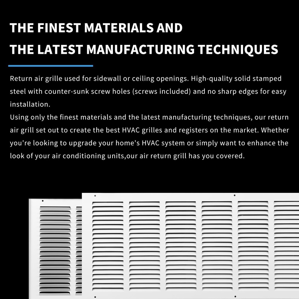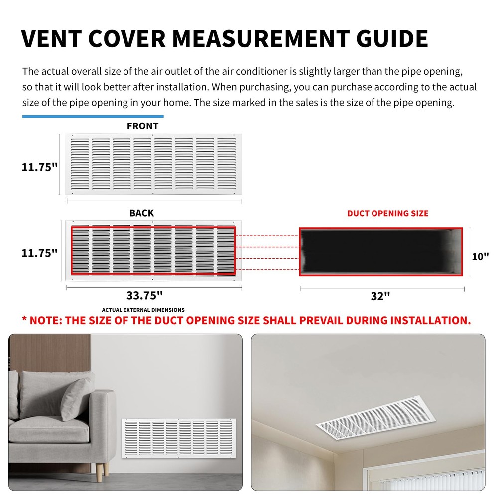 32 x 10 Vent Cover(Duct Opening Size),Air Return 32"W x 10"H, Duct 32x10 Return Air Grille(Duct Opening Size),Outer Dimensions:33.75"W x 11.75"H,Flat Return Air Grilles,Air Vent Covers,AC Return Vent Cover,Vent Covers for Wall,Modern Vent Covers for Home Ceiling,Return Air Vent CoverFeatures:①Return air grille used for sidewall or ceiling openings. High-quality solid stamped steel with counter-sunk screw holes (screws included) and no sharp edges for easy installation.ATTENTION: This is a flat stamped steel return air grille. Please order by the duct opening measurement.Before buying, ensure precise fitting by measuring your wall opening before placing your order. Wall Opening Size = Listed Size. If the duct opening on the wall is 32"W x 10"H please order (32"W x 10"H, Duct Opening). 32"W x 10"H is the size for the duct opening measurement only, actual return air grille outer dimensions are 33.75"W x 11.75"H.②With its easy installation and easy to operate, this air return vent cover 32x10 can be quickly and securely mounted to your wall or ceiling for instant improvement in airflow and circulation. Our return air grilles can help circulate air in residential and commercial buildings. Cold air return vent cover can also be used to circulate cool air between different rooms in your home.③Using only the finest materials and the latest manufacturing techniques, our return air grill set out to create the best HVAC grilles and registers on the market. Whether you're looking to upgrade your home's HVAC system or simply want to enhance the look of your air conditioning units, our 32x10 air return grill has you covered.Specification:-Material: Heavy Duty All-steel construction. Durably white powder coated.-1/2" spaced fins set at 40 degrees.-Primary use: Side wall and ceiling.-Screws are included with the system, standard.-Concealed mounting holes.Package includes:1 * 32x10 return air grilleHow to Measure for Return Air Grill:Step 1 - Remove your old grilleRemove the screws that secure the grille onto the wall/ceiling. If this is a ceiling application, prevent the grille from falling for your safety.Step 2 - Take the correct measurementsMeasure the Duct Opening (the hole on the wall/ceiling) by measuring the WIDTH first:32", and then the HEIGHT:10" (e.g. 32"W x 10"H), please order (32"W x 10"H, Duct Opening) this HVAC return air grille is the size you should order.ONLY MEASURE THE DUCT OPENING, DO NOT MEASURE YOUR OLD GRILLE!Note:1. Please allow 0-0.4 inch error due to manual measurement. Please make sure you do not mind before you bid.2. Due to the difference between different monitors, the picture may not reflect the actual color of the return vent. Thank you! Product Features How to Measure: Always measure the wall opening to determine which size you should order. Wall Opening Size(32"W x 10"H) = Listed Size(32"W x 10"H, Duct Opening). 32"W x 10"H is the size for the duct opening measurement only, actual return air grille outer dimensions are 33.75"W x 11.75"H. ATTENTION: This is a flat return air grill used for mounting on the wall directly (Screws included) High-Quality Materials: Embodying a powder-coated finish, the return air grill exhibits resilience against flaking, scratching, and fading, the cold air return vent cover is made of high-quality steel, and the steel is stamped so there are no sharp edges. Modern vent covers for home ceilings are a sturdy construction that ensures long-term durability, making them a reliable choice for residential and commercial applications Efficient Airflow: A return vent cover is used for sidewall or ceiling openings. Enjoy a quiet and efficient airflow for your HVAC system with our AC vent cover. 40-degree angled fins ensure maximum airflow. Vent covers for walls are designed to minimize noise while maximizing air intake, ensuring a peaceful and comfortable environment in your home Enhance Home Aesthetics: Easy Installation, Installing this 32x10 return air grille is a breeze, with simple, hassle-free mounting options and included screws. Enjoy a quick and straightforward wall vent cover setup to enhance your home's ventilation, granting your home or office space a contemporary appearance while maintaining a refreshing atmosphere Quality after-sales service: We attach great importance to the quality of our return air grilles products and our customers' shopping experience. If you have any dissatisfaction or questions about the HVAC return air grille you purchased, you can contact us, we will be happy to help you solve the problem and make sure you have a pleasant shopping experience Shipping: Shipping is complimentary within the lower 48 US States. We Do Not Ship to PO/APO Boxes, HI or Alaska We Do Not Ship Outside of the Continental US All items ship within 24-72 hours of Payment For large items that require Freight shipping a valid phone number is required to call and schedule your delivery Terms of Sale and Feedback: Feedback is extremely important to us and eBay If you are satisfied with our transaction, please take a moment to leave Positive Feedback. YOUR Satisfaction is our #1 Priority! If there are any issues, PLEASE contact us BEFORE leaving a neutral or negative rating so that we may resolve any concerns. We PROMISE we can make you happy if you give us a fair chance. Returns / Concerns: All items qualify for returns within 14 - 30 days of receipt. Buyer is responsible for return shipping on any item that is not damaged Please be sure this is an item you want before making your purchase. Customer Satisfaction is our TOP priority! All items are IN STOCK at time of listing. Inventory on eBay changes constantly and it is impossible to maintain a perfectly accurate count of all items. Please do not penalize us if we have to issue you a refund! Thank You For Your Business!