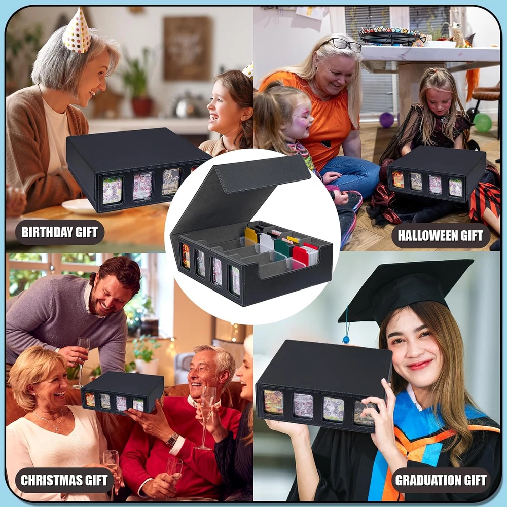 LARGE CAPACITY TRADING CARD STORAGE BOX: The TCG deck box mtg commander deck box has a large capacity, holding 3200 unsleeved cards, 1800 single-sleeved cards, 1500 double-sleeved cards, and 640 + Toploader cards. Suitable for most MTG/TCG/CCG/Baseball/Football/Basketball/Game Trading Card Storage Box STRONG MAGNETIC MTG DECK BOX: Our trading card storage box features 4 large magnets designed to give it a sturdy closed design for increased stability, no need to worry about cards falling out of the box EASY SORTING MTG DECK BOX ORGANIZER: Easy organization and sorting, 4×display windows are a great for showing some favorite cards, 4×card supports help cards upright and keeping from bending and getting damaged, 30×colorful dividers are sturdy and easy to label, you can customize the organization to fit your preferences WATERPROOF MTG COMMANDER DECK BOX:The exterior of the TCG deck box is made of waterproof material, exquisite stitching, and soft and tough leather, the interior of the card storage box is made of a faux suede type material, quite soft and smooth and keeps card getting scratched IDEAL GIFT FOR CARD COLLECTORS: Our mtg commander deck box trading card storage box is designed for MTG/TCG/CCG gamers and collectors, large capacity perfect storage for various game cards, baseball card and other prized items. Excellent Halloween/Christmas/Birthday/White Elephant Gift for family, friends, or partners who love card collecting or gaming Product Description