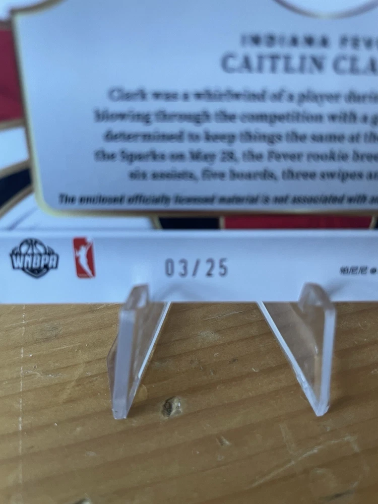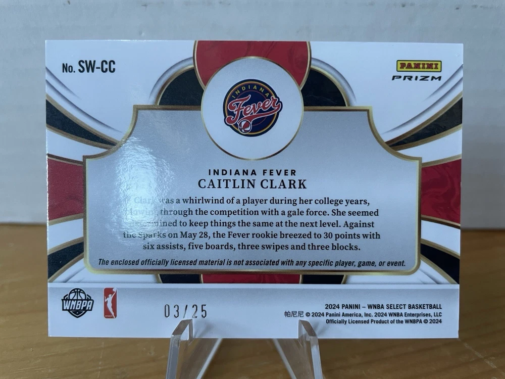 Type:Sports Trading CardParallel/Variety:Tie-Dye PrizmMaterial:Card StockAutographed:NoCard Name:2024 SelectCard Number:11Player/Athlete:Caitlin ClarkPrint Run:25League:Women's National Basketball Association (WNBA)Set:2023-24 Panini SelectManufacturer:SelectSeason:2024Team:Indiana FeverCountry/Region of Manufacture:United StatesYear Manufactured:2024Features:Memorabilia, Parallel/Variety, Rookie, Serial Numbered, Short PrintSport:BasketballCard Thickness:130 Pt.