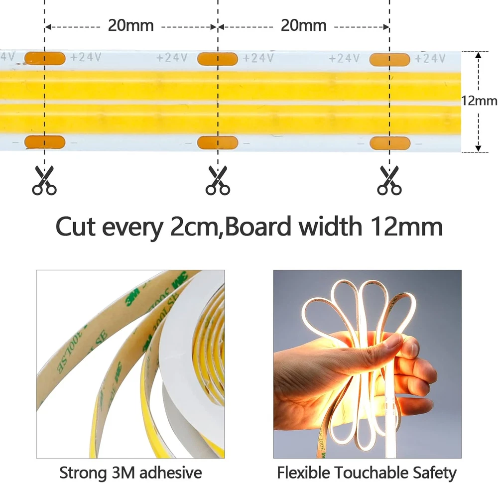 Store New Arrivals Add to Favorite View Feedback Contact 32.8Ft(10M) 24V Double Row COB LED Strip Light Warm White 3000K 6000Leds CRI 93+ 20000Lm Uniform Glow Dotless IP20 Not Waterproof Flexible LED Tape Lights for DIY Home Decor(No Power Supply) Description Light Source Type LED Item model number COB Style LED Strip Power Source 24V 300W power supply(Without power supply) Number of Light Sources 600 Country of Origin China Theme People Batteries Included? No Usage decorative lighting Controller Type Remote Control Batteries Required? No Material Plastic Package Dimensions 9.21 x 8.23 x 0.63 inches Item Package Quantity 1 White Brightness 20000 Lumens Indoor/Outdoor Usage Indoor Control Method App Light Color 3000K Water Resistance Level Not Water Resistant Item Weight 10.8 ounces Occasion Halloween Special Features Decorative lighting Special Feature Decorative lighting Part Number COB Color Temperature 3000 Kelvin Color 3000K Wattage 2.4E+2 Voltage 24 Volts (DC) Luminous Flux 20000 Lumen Size IP20 Non étanche 【Double Row COB LED STRIP】600LEDs/M(3.3ft), 6000LEDs/32.8ft(10m), COB light strips have more dense LED chips, Which make the emitting units nprecedentedly close to each other, and create super even lighting performance. At the same time, it brings higher luminous efficiency 【24V INPUT】Driven by 24V power supply, the maximum power reaches 240W/10M(32.8ft), and the brightness value is as high as 20000lm; At the same time, The use of 24V voltage can ensure that the brightness at the beginning and the end of the strip is almost the same.It is recommended to use at least 24V 300W power supply(Without power supply). 【CRI 93+】With high color rendering index(93+), rich colors and strong reduction, It can make people feel more natural and soft. 【Cuttable】The LED strip lights can be cut every 2cm(0.79in) along the cutting marks, very suitable for easy DIY. 【Widely use】The COB LED strip light is Cuttable and self-adhesive backing suitable for interior decoration/Home decoration,such as Cabinet,Kitchen,stair,mirror,Decorative lighting for high-end entertainment venues. Product Description It is recommended to use 24V 300W power supply(Without power supply) Driven by 24V power supply, the maximum power reaches 240W/10M(32.8ft), and the brightness value is as high as 20000lm; At the same time, The use of 24V voltage can ensure that the brightness at the beginning and the end of the strip is almost the same.It is recommended to use 24V 300W power supply(Without power supply). It is strictly forbidden to directly connect the LED light strip to 110V high voltage, high voltage will instantly damage the LED light strip. DC 24V Double Row COB LED Strip Light 32.8ft(10M) Specification LED Type Double Row COB LED Strip Light Input Voltage DC 24V Total Wattage MAX 240W LED Density 600LEDs/M total 6000LEDs/32.8ft(10M) IP Rating IP20 Non Waterproof CRI 93+ View Angle 180° Beam Angle Working Temperature -20℃ to 50℃ Color Warm White Dimension L1000cm (10M) x W12mm x H3mm Dimmable Support ( Dimmer Switch Not Included) Cuttable Every 0.79in(2cm) been cuttable,please follow the mark on PCB board Mounting LED adhesive light strips,just stick on,comes with strong adhesive sticker Luminous Flux 20000 Lumen Package 1X10Meters Non Waterproof Double Row COB LED Strip Light (Power adapter & LED Dimmer NOT INCLUDED) Advantages of double-row COB LED strips Double-row COB LED strip with maximum power of 240W/10M, brightness of 20,000 lumens, higher brightness; board width of 12mm, larger light-emitting area. The Correct Way to Tear Off Double-sided Tape Double-sided Tape Structure The yellow part is release paper, the white part in the middle is double-sided tape, and the lower part is the circuit board. Correct Operation The yellow part is release paper, tear off the release paper and keep the double-sided tape. Wrong Operation It is wrong to tear off the release paper and double-sided tape. Features CRI>93 With high color rendering index(93+), rich colors and strong reduction, It can make people feel more natural and soft. Dimmable You can adjust the brightness of the LED strip according to your needs( Dimmer Switch Not Included). Safe to Touch,Easy to DIY. 24V Low voltage is safe for daily use,especially for children and pets. Flexible design allows you to DIY for your kitchen,tv,pc,on the edges and inside of your wardrobe,make your home look brightness. Wide Range of Application Scenarios It is suitable for stairs lighting of auditorium corridor, wine cabinet decoration, TV Background, mirror, party, wedding, show exhibition decoration, etc. ABOUT US We offer the best prices around on high quality products. Our E-store includes media such as books, movies, music and games while offering electronics, toys, sporting apparel, clothing, tools, general home, garden items and more. SHIPPING We are always working hard to ensure your package arrives as soon as possible. Please understand that some factors like weather, high postal traffic, and the performance of shipping companies are outside of our control. We offer free shipping to the lower 48 states and ship within 2 business days of payment, usually sooner. We do not accept P.O. Boxes. Please provide a physical address. For shipping outside of the continental USA, we only use eBay's Global Shipping Program.The item is shipped to KY and then sent to the rest of the world. International customers are responsible for all duties and taxes. Continue to check out in order to calculate costs for shipping the item to your country. Messages regarding eBay's Global Shipping Program MUST be directed at eBay EXCLUSIVELY. RETURNS We offer a 30-Day Return Policy on items which you are not completely satisfied with. You have the option for a full-refund or an exchange of the item. No returns are available on items shipped outside of the USA. PAYMENT We accept PayPal. CONTACT US This page content is yet to come Please ad us to your favorite seller and visit 
