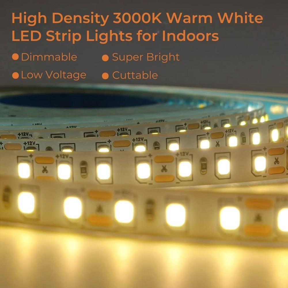 HIGH QUALITY LED STRIP LIGHTS - Designed with double sided PCB 2835 LED lights, more durable and reliable for use with many applications. More than 50000Hours (5 Years) lifespan, these discreet strips feature closely packed LEDs for a smooth, even light without any spotting. UPGRADED LED TAPE ADHESIVE - Compared with other non-high quality LED strip lights, we use high-quality blue strong adhesive backing with heat resistance, strong viscosity and integration. Please contact customer service emails for any LED light strip with adhesive problems. We will accommodate a solution that best fits your projects and needs. SIMPLE AND EASY TO USE - Working for 24V voltage, Rated Power 24W. Please note that the total wattage of the LED strip should not exceed the maximum wattage of the power adapter. Doing so may cause the LED lights to flicker or the Lights to be dim. DIMMABLE and FLEXIBLE - These LED strips are great for a variety of indoor / interior uses including under-cabinet lighting in kitchens, ambient accent lighting in bedrooms, lighting toekicks in bathrooms, or adding a backlighting source to displays, decorations, or book shelves, you are only limited by your imagination. QUALITY ETL-LISTED. Backed by one year from for peace of mind. Contact our customer service team at any time for no-hassle troubleshooting and replacement or for any questions about purchasing or installation. 💡Please note that 3000k warm white led strip light packaging may change without prior notice, but rest assured, our commitment to quality remains constant.
