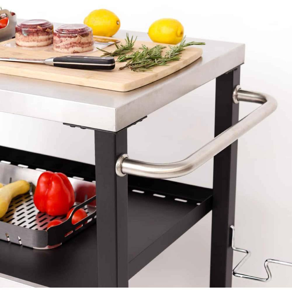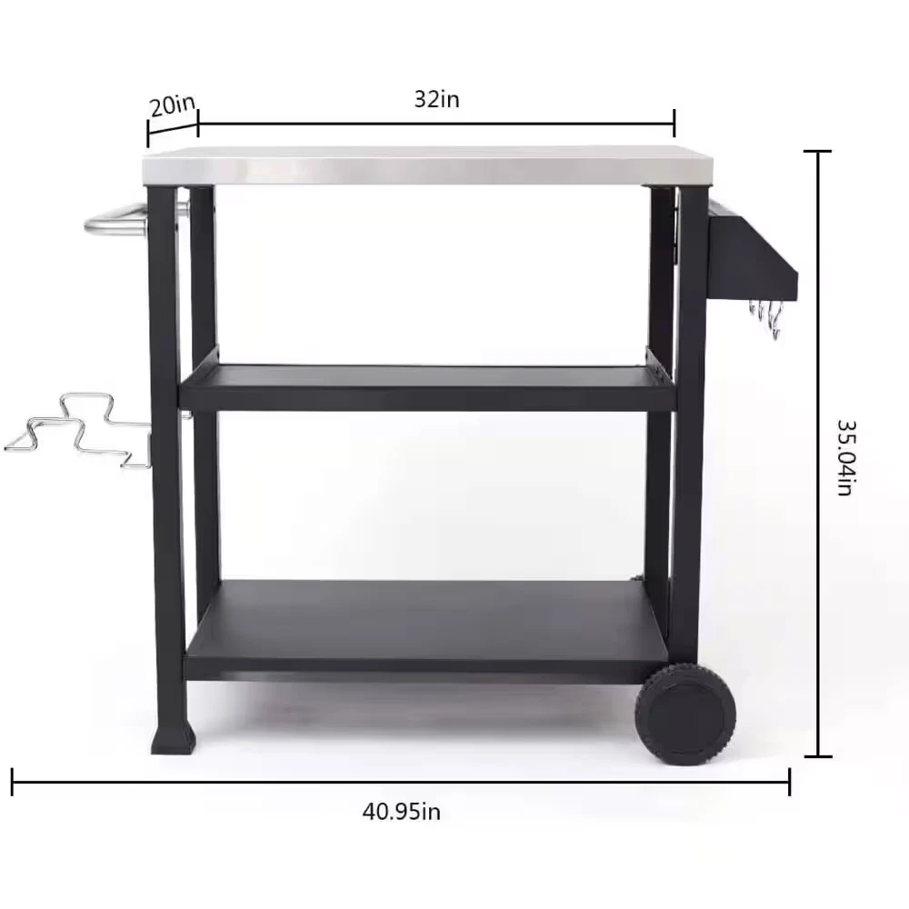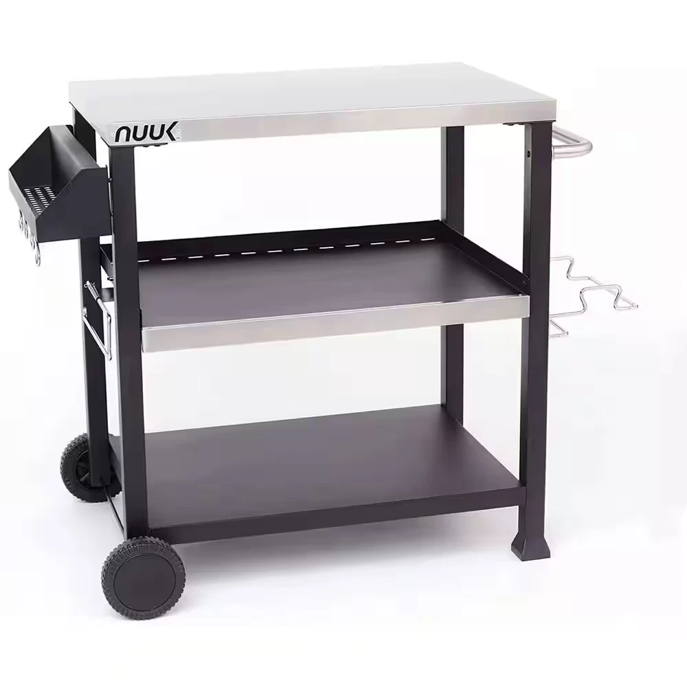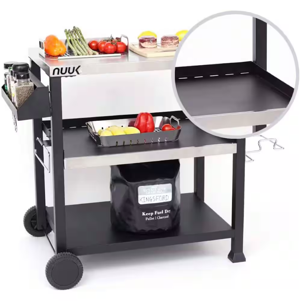 Designed with wheels for easy mobility Made from stainless steel for enhanced durability Measures 35.04 in. H x 32 in. W x 24 in. D The NUUK MC610 Outdoor 3 Shelves Prep Station and cart can hold your portable grill, griddle and pizza oven, it fits your deck, backyard and indoor kitchen area. The 20 in. x 32 in. total 640 SQ in top made by food grade stainless steel, offer enough space for preparing and seasoning food. Mid-shelf offer ample space for storage, 3 side fold up lip can hold items during moving. The solid steel bottom shelf provide another full space for storage. Large capacity condiments rack can hold all your sauce, multi-function S tool hook can hold all your cooking tools. 2 large plastic wheels and side large handle let you roll the table easy and go everywhere you want.