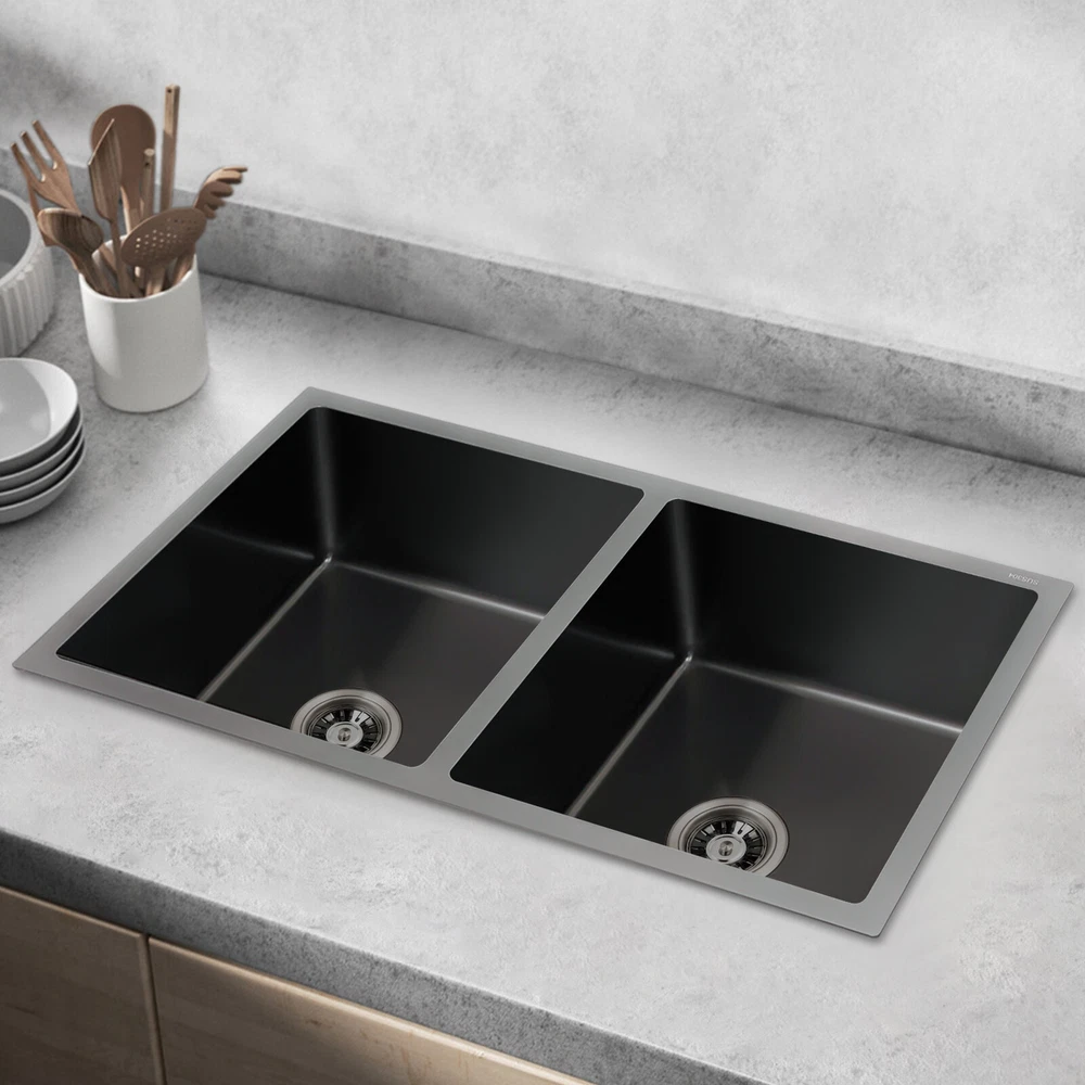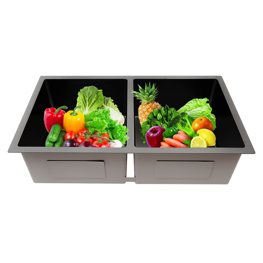 Specifications Material: 304 Stainless Steel, Rubber Color: Black Assembly Requirements: Yes Process: Brushed, Blackening Style: Modern Stainless Steel Thickness: 3mm/0.12in Number of Bowls: 2 Gross Weight: 12kg/26.46lbs Single-bowl Size: 36.83*40.64cm/14.5*16in Overall Product Size: 81.28*45.72*22.86cm/32*18*9in Pakage Size: 85*54*28cm/33.46*21.26*11.02in 32"x18'' Drop-in Double Bowl Basin Kitchen Sink Black With Filter Baskets Description Description This 304 stainless steel sink is made of high-quality material and adopts excellent brushed and blackening workmanship, making it hard-wearing and corrosion-resistant . Its enlarged and deepened 2 sinks not only reduce water splashing, but also increase the space for cleaning a lot of cookware. With it, you can enjoy a more convenient life. Key Features Build to Last: It is made of high-quality 304 stainless steel with brushed and blackening processes, s o it has good corrosion resistance , oxidation resistance an d strength. It can be used in wet environments such as the kitchen and laundry room. Large Capacity : You can put a large number of dishes in 2 bowls of 32*18*9 inches, making it more comfortable and efficient for you to clean. So it is a great helper for you to clean dishes or prepare food. Good Sealing : The connection between the downpipe and the drain is fitted with high-quality connectors and rubber seals, adding to its good sealing to avoid leaks. Separate Cleaning : 2 separate bowls are equipped with separate downpipes, so they can be used independently. You can wash different dishes and vegetables at the same time without interfering with each other. Effortless Cleaning: The stainless steel surface is brushed, so it is very smooth. Therefore, you only need to wipe it with a soft cloth to keep it neat and tidy. Easy to Assemble : The complete range of mounting parts and the simple construction of the product allow you to install it quickly and accurately in a short time. Thoughtful Design: We use high-quality stainless steel filters, which are corrosion-resistant a nd can be used for a long time. And it collects food and debris, preventing debris from clogging the pipes thus saying goodbye to unpleasant smells. It is equipped with an acoustic insulation system that includes a protective coating and an eco-friendly rubber mat that reduces the harsh sound of running water or the echo of falling cutlery. Modern and Simple: The low-key and luxurious black color, delicate connections, and smooth streamlines give this sink set a modern and simple appearance, which fits most household styles. Quality Service: We are honored that you have chosen our product. We have sufficient confidence in the quality of the product so that you can buy it confidently. But if you have any questions, you can contact our customer service, he will patiently answer and solve your problems. Details Thickened Panel: The 3mm thickened panel can provide better support and load-bearing force for the sink. X-shape Diversion Line: It can help guide and accelerate the water-flowing speed and keep the sink bowl dry and clean when not in use. Arcs Shape: The rounded and smooth edges not only add to the aesthetics of the product but also improve the safety of use. Application This product can be widely used in homes, restaurants, laundry rooms, basements, bars, kitchens, food trucks, dessert shops, coffee shops, hotels, garages, gardens, pet shops, etc. for cleaning tableware, vegetables, fruits, pets, etc. Specifications Material: 304 Stainless Steel, Rubber Color: Black Assembly Requirements: Yes Process: Brushed, Blackening Style: Modern Stainless Steel Thickness: 3mm/0.12in Number of Bowls: 2 Gross Weight: 12kg/26.46lbs Single-bowl Size: 36.83*40.64cm/14.5*16in Overall Product Size: 81.28*45.72*22.86cm/32*18*9in Pakage Size: 85*54*28cm/33.46*21.26*11.02in Package Included 1* 304 Stainless Steel Sink 2*Filter Baskets 2*Sealing Rings 2* Connection Hoses Notes Please check the size carefully before ordering. Please do not scratch its surface with sharp objects to obtain a longer service life. If you want to get a better installation result, we recommend that you hire a professional plumber to install it. Please allow the slight color difference caused by the shooting light and 1-3cm error due to manual measurement, and make sure you do not mind before you order. Payment Delivery details Terms of sales About us Contact us Payment We accept ebay payment 。 Fees such as import duties, taxes are not included in the item price or shipping costs. These charges are the buyer's responsibility. Delivery details Shipping: 2-9 working days to: USA Terms of sales We maintain high standards of excellence and strive for hundred percent customer satisfaction. Feedback is very important to us. We hope that you contact us immediately before you give neutral or negative feedback, so that we can address your concerns. It is impossible to address issues if we do not know about them! About us Your satis faction is our ultimate goal. We work hard to earn your trust and future business. Our certified technicians have tested each item before shipping. The unit comes with 1 year limited warranty on all manufacturing defects. a) If you receive a defective item, you may return it or ask for a discount. Please contact us within 14 days after you receive the package. b) What you returned must be intact and in its original packaging as re? u. Customer is responsible for shipping costs of the returned item. c) We will cover the cost of shipping back t with the shipping rate indicated in the registration page. We will send you a new unit or refund the full payment you paid. Thank you. Contact us Business Hour Business Hour: Monday To Friday: 8:30 AM to 5:00 PM (Beijing China time) Due to time zones, our reply to your questions may not be immediately. But within above working time, we will reply your email within 24 hours. If it's non-workdays, please kindly be patient and wait till Monday. P
