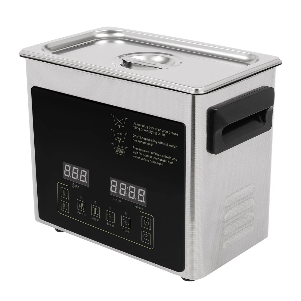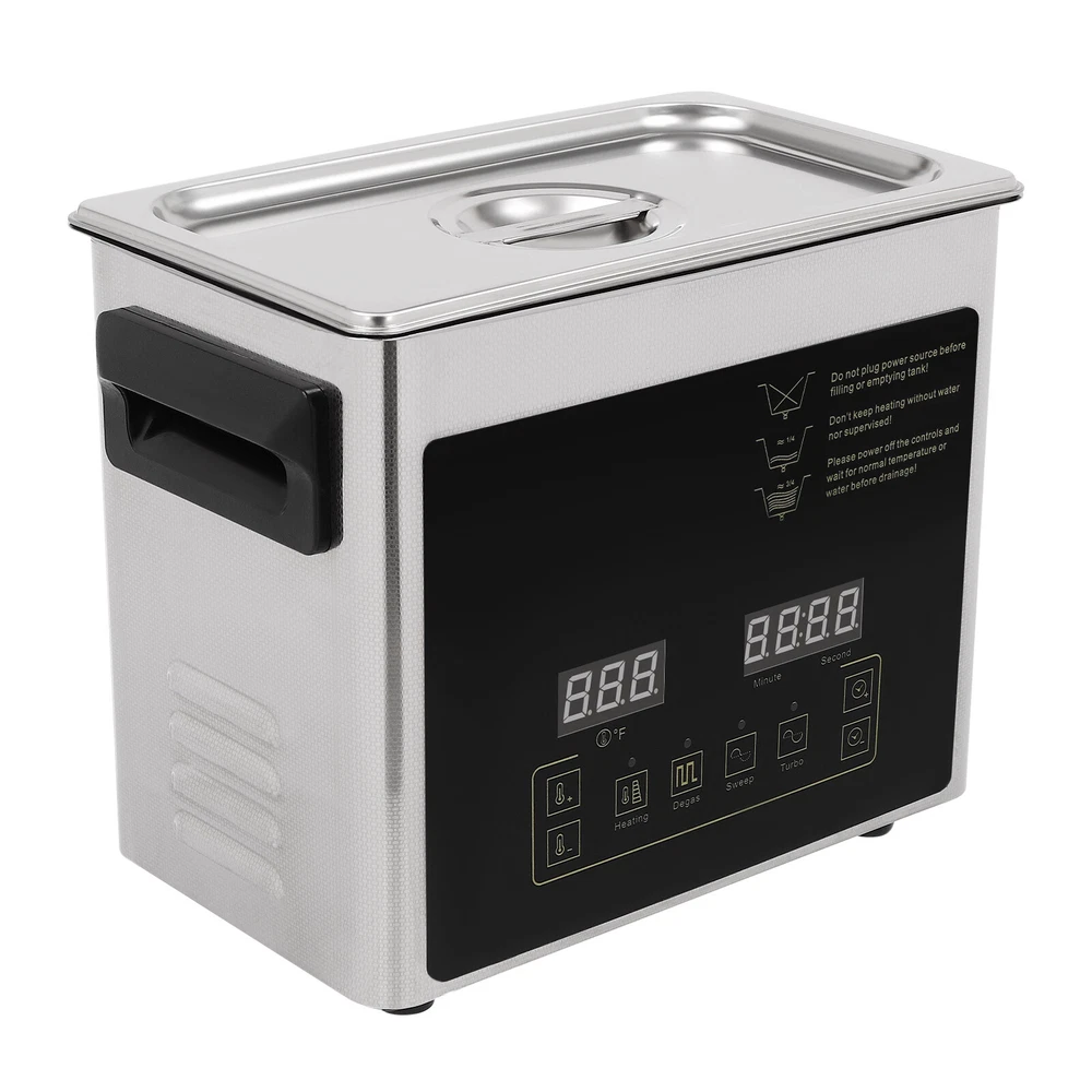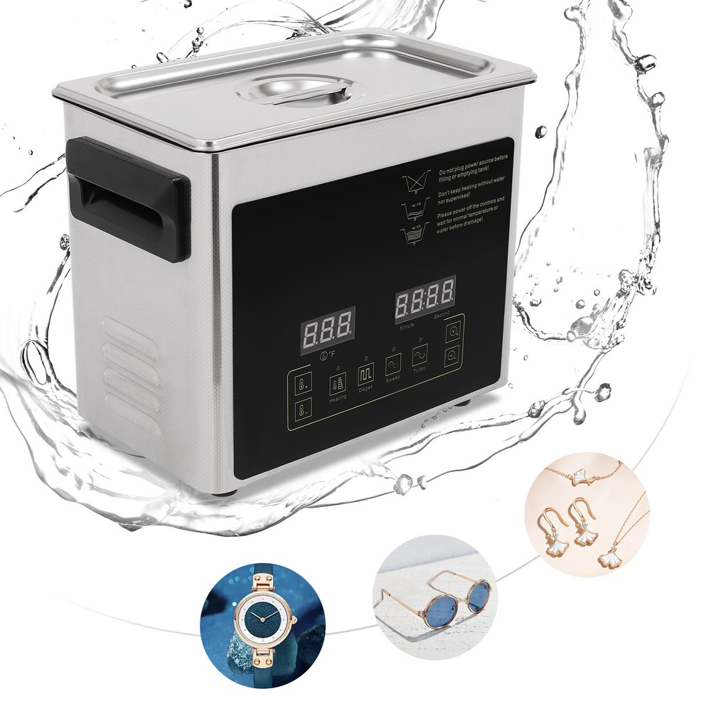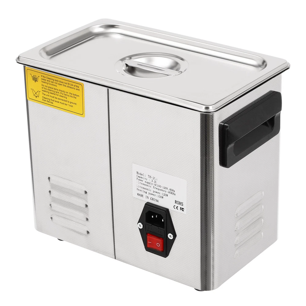 Specification Material: 201 Stainless Steel, 304 Stainless Steel Color: Silver Style: Modern Plug Type: US Standard Controller Type: Push Button, Touch Key Cleaning Modes: Sweep, Turbo, Degas Mount Type: Table Standing Style: Modern Model: TH-20A Shape: Rectangular Noise: 100dB Thickness: 1mm Capacity: 3.2L/0.84 gal Time Setting: 0-30min Heating Power: 100W Cavitation Range: 60W Ultrasonic Power: 120W Voltage: AC100-120V, 60Hz Ultrasonic Frequency: 40 Khz, 46,000/s Heating Temperature: 0-80℃/0-176℉ Power Cord Length: 1.5m/4.92ft Product Size: 25.4*15.24*21.59cm/*10*6*8.5in Package Size: 35*24*29cm/13.78*9.5*11.4in Net Weight: 3.2kg/7 lbs Gross Weight: 3.8kg/7.98 lbs lab Ultra Sonic Glasses Cleaning Ultrasonic Jewelry Cleaner Machine 3.2L Description Are you looking for ultrasonic cleaning? This product will win your favor! High power, high vibration frequency, three cleaning modes, and a heating function can meet your diverse cleaning needs. The timer function, LED screen, and touch control allow you to get rid of tedious operations and provide you with more convenience. This is your ideal choice! Key Features Sturdy and Durable : The high-quality 201 stainless steel shell and 304 stainless steel inner make it resistant to corrosion, deformation, tear, and wear and can withstand high-strength use, ensuring sufficient durability. Excellent Performance : It features an industrial strong vibration head (40kHz), high power (120W), a wide range of cavitation (60w), high-frequency vibrations (46,000 per second), and high heating power(100W) to produce millions of small bubbles to destroy the adhesion of dirt and grease, enabling effective 360° deep cleaning, penetrating blind holes, cracks and grooves, thus achieving a fast and efficient cleaning effect. High Safety : It uses high-frequency sound waves for cleaning without the use of chemical cleaning agents, which is harmless to the environment and the human body for added safety. It also has a double fuse protection system to prevent burnout. Three Cleaning Modes : It includes sweep (28khz-gross rinse of the sample surface), turbo(40khz-intensive cleaning of blind holes), and degas (high-intensity ultrasonic pulses and bubbles removal in solutions for effective cleaning), meeting the cleaning needs for different applications and different effects. Excellent Heating Dissipation : It comes with multiple heat dissipation holes, ensuring the motor can dissipate heat timely to avoid burning and providing a safer and more stable operation. Large Capacity : The large tank (0.84 gal) can accommodate multiple items at a time, and the cleaning basket and a ball-shaped jewelry cleaning basket can reduce friction and scratches during cleaning, better protecting your items and it also can be used to drip dry items. Easy to Operate : With a simple operation interface, sensitive touch keys, and a clear LED display, you can easily set parameters and monitor the product's working status in real-time, providing you with more convenience. Strong Function : The temperature (0-176℉) and time (0-30 minutes) can be adjusted freely through the panel button. When the temperature is higher than the preset value, the machine will automatically stop heating. Besides, it will automatically remember the last information to avoid frequent settings, providing more efficient and convenient operation. Protective Packaging : The strong box and pearl cotton provide comprehensive protection for products to ensure that it is fully delivered to you to the greatest extent possible. Guaranteed Customer Service: We aim to provide quality products and services. If you have problems, please feel free to contact us. We will reply and solve the problem for you as soon as possible. Details Top Lid : It can reduce heat loss and noise during operation and the enlarged handle on the top allows you to easily pick it up. Recessed Insulated Handles : The insulated handles with anti-static and high-temperature protection performance make it convenient to move the machine. Support Feet : The four support feet are abrasion-resistant, non-slip , and can ensure the stable placement of the product. Long Wire : The 4.92ft long wire reduces usage restrictions, and allows stable and reliable current and voltage, ensuring a safer use. Application It is suitable for cleaning jewelry, watches, glasses, tableware, dental equipment, milk bottles, circuit boards, hardware parts, razors, laboratory equipment, golf clubs, fishing reels, window blinds, firearm components, car fuel injectors, musical instruments, gramophone records etc. It can be used to clean the long holes, cracks, and shields of the workpiece and is mainly used in the laboratory, food industry, biology industry, agriculture industry, or daily necessities industry. Specification Material: 201 Stainless Steel , 304 Stainless Steel Color: Silver Style: Modern Plug Type: US Standard Controller Type: Push Button, Touch Key Cleaning Modes: Sweep, Turbo, Degas Mount Type: Table Standing Style: Modern Model: TH-20A Shape: Rectangular Noise: 100dB Thickness: 1mm Capacity: 3.2L/0.84 gal Time Setting: 0-30min Heating Power: 100W Cavitation Range: 60W Ultrasonic Power: 120W Voltage: AC100-120V, 60Hz Ultrasonic Frequency: 40 Khz, 46,000/s Heating Temperature: 0-80℃/0-176℉ Power Cord Length: 1.5m/4.92ft Product Size: 25.4*15.24*21.59cm/*10*6*8.5in Package Size: 35*24*29cm/13.78*9.5*11.4in Net Weight: 3.2kg/7 lbs Gross Weight: 3.8kg/7.98 lbs Package Included 1* Ultrasonic Washing Machine 1* Cleaning Basket 1* Ball-shaped Basket 1* Power Cord 1* English Manual Notes Please note that the machine can only work under 120V voltage. Turning the cleaner on or off frequently is not recommended. Please read the operating manual completely before use and pay particular attention to the safety instructions included. The best temperature we suggest is 40℃~60℃, and the cleaning time is 30 mins one time. The tank is made of 304 stainless steel , please do 