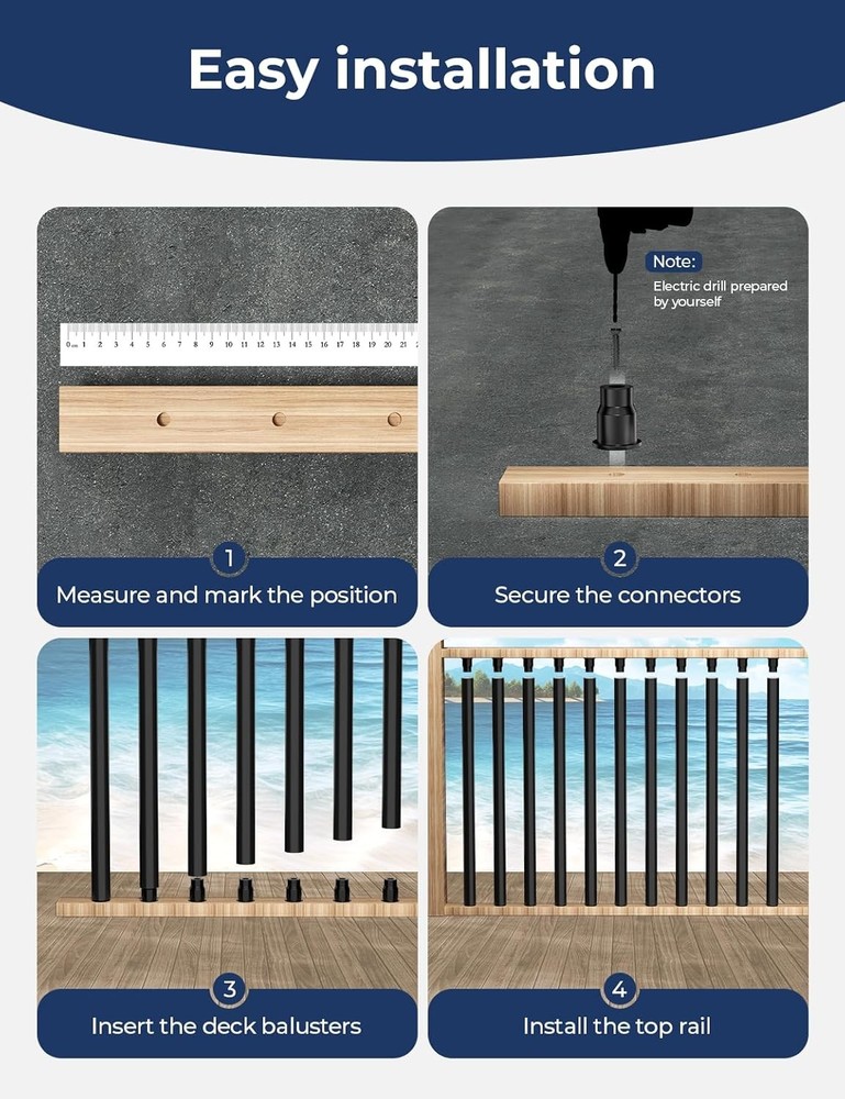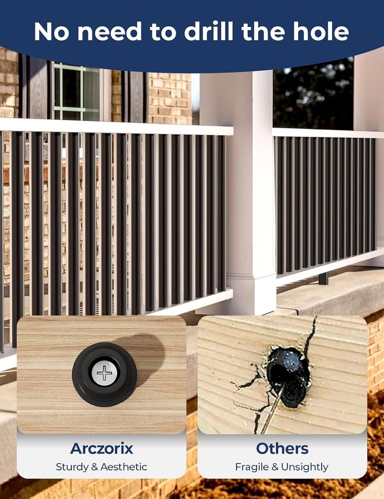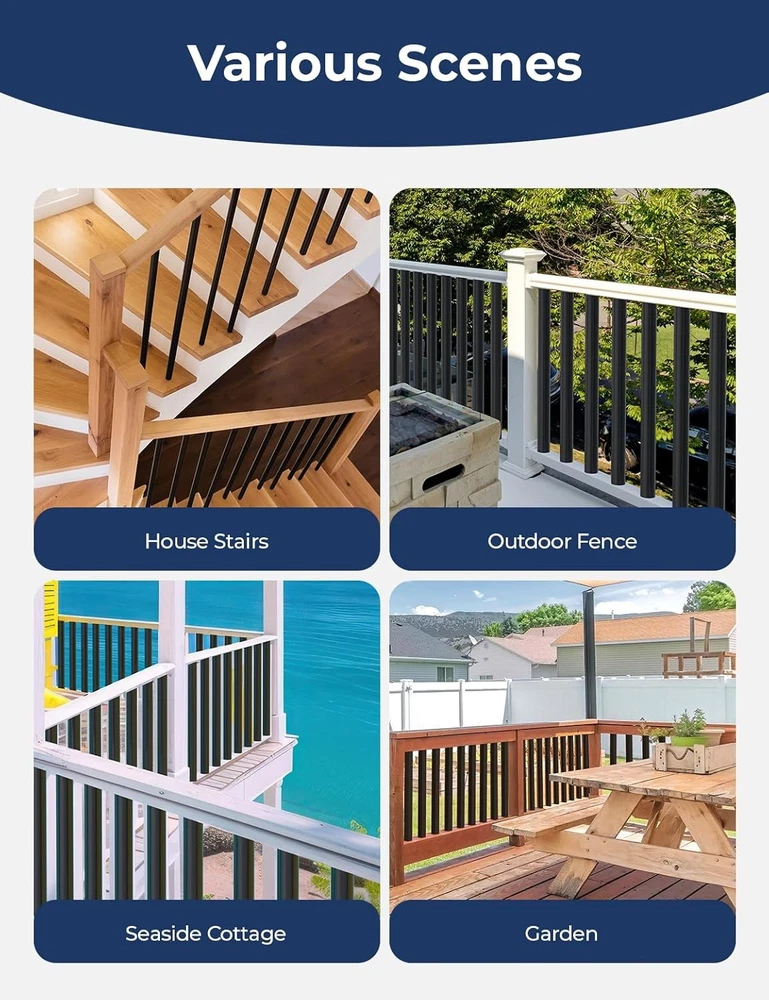 51-Pack 32" Round Aluminum Deck Balusters, Black Staircase 32", Product Details Package Dimensions : 35 x 10.75 x 3.75 inches; 16 Pounds Item model number : AR-DB3251-US Manufacturer : Arczorix Country of Origin : China Material: Aluminum Brand: Arczorix Color: Black Shape: Round Item Diameter: 0.75 Inches [Premium Quality Construction]: Made from high-quality aluminum, our 32" deck balusters are highly rust-resistant, durable, and built to withstand various weather conditions. The AAMA-2604 powder-coated surface ensures a matte, non-reflective, and durable finish that is environmentally friendly and glare-free, making it perfect for both indoor and outdoor use with no maintenance required. [Complete Set with Connectors]: Each package includes 51 aluminum balusters (32" in length, 3/4" in diameter), along with 102 connectors and screws for both level and stair railing installations, providing the perfect 32" rail height. [Hassle-Free Installation]: Pre-included connectors allow quick assembly without routing holes. Simply align the balusters, screw in the connectors, and attach the top and bottom rails for a secure fit. [Customizable Fit]: Thanks to the hollow aluminum design, the balusters are easy to cut for custom heights and can be installed on wood, composite, or aluminum railings, making stair remodels fast and efficient.