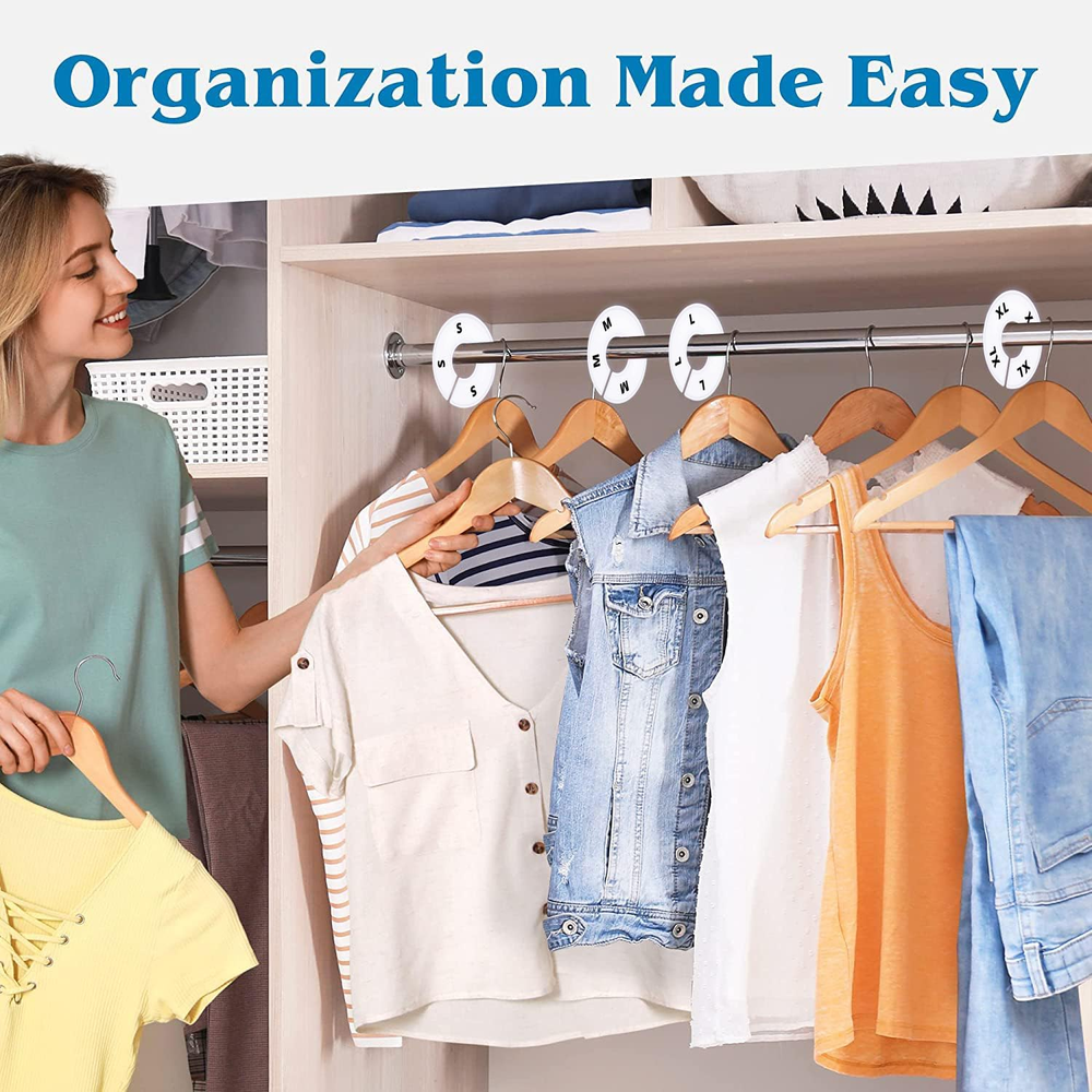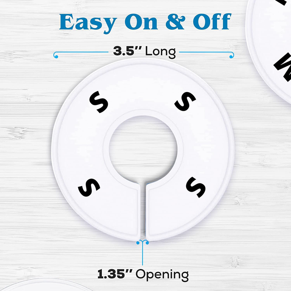 30 closet size dividers for organizing clothes from baby to adult; ideal for home and retail Blank white closet hanger dividers for easy personalization; simplifies finding and sorting items Clothing dividers made from sturdy plastic with slight flex for easy installation; resistant to snapping or breaking Fully customizable design allows for a personalized closet organization system; marker not included Each clothing rack divider has a 1.35” wide opening; ensure compatibility with your closet rod before purchasing Product Description