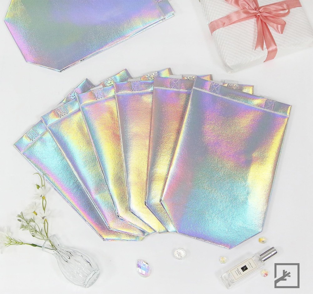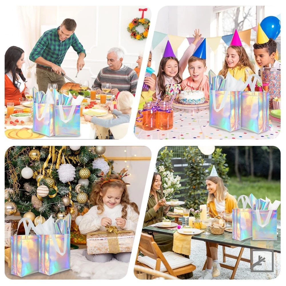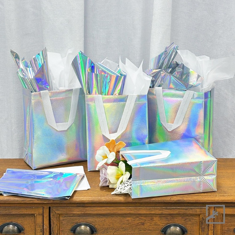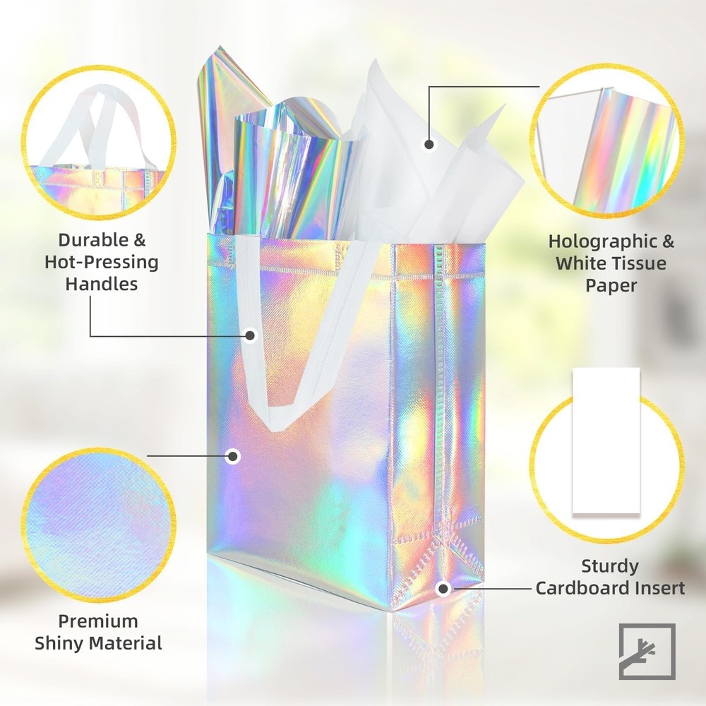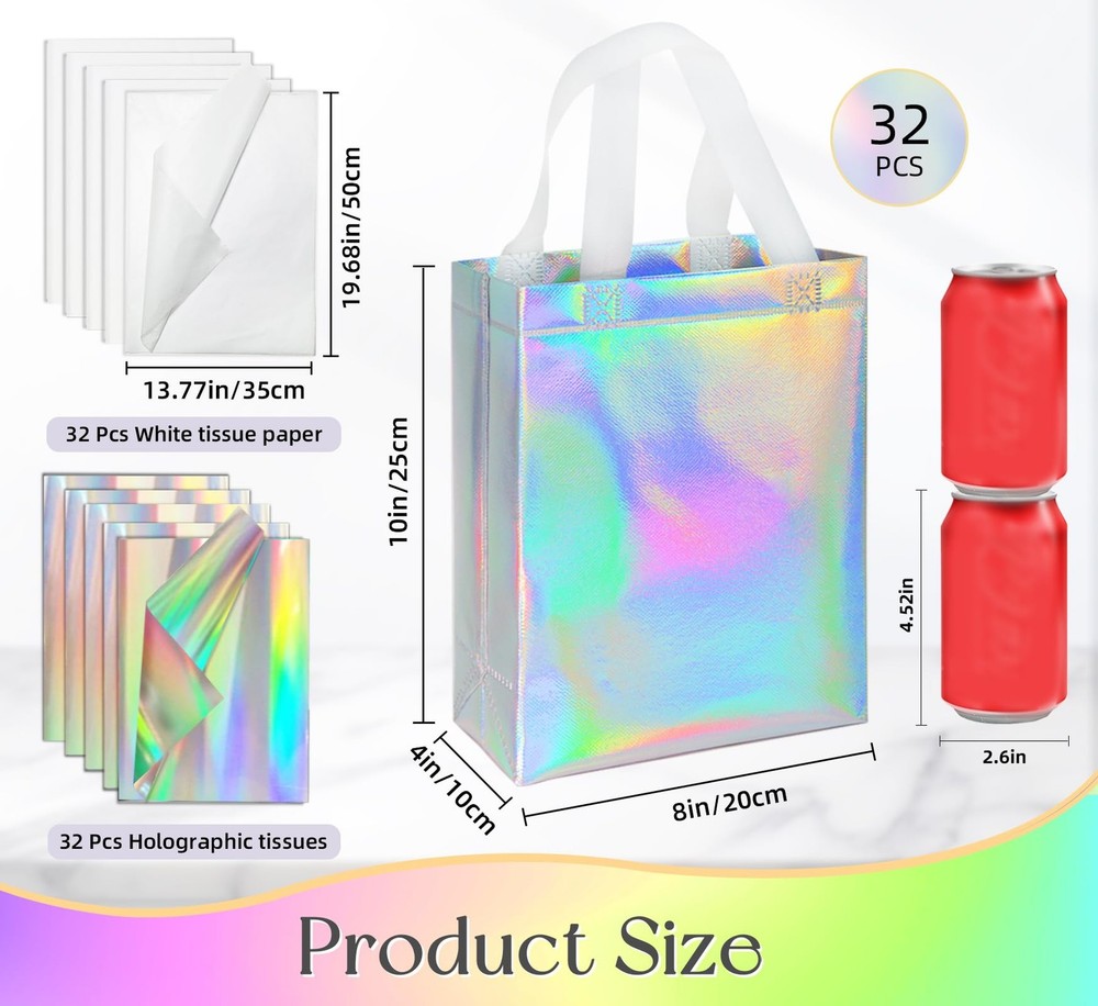 [You Will Receive]: Our holographic reusable gift bags, which are approximately 10 x 8 x 4 inches, can easily hold birthday gifts, small clothing, bottled drinks, and various snacks. [Shine Under The Sun]: You will receive 32 reusable gift bags, each of which comes with a pair of 32 white tissues and 32 holographic tissues, showcasing different colors beautifully in the sunlight. [Excellent Material]: This medium gift bag is made of non-woven fabric and can be reused, unlike ordinary paper gift bags. The outside of the bag is covered with film to prevent water damage. It is equipped with a handle that is not easily broken. [Bottom Reinforcement]: Each gift bag is equipped with white cardboard at the bottom to keep the bag upright, maintain its shape and prevent bending. [Multi Applications]: Each holographic gift bag is an ideal shopping bag and also suitable for various occasions, such as birthday parties, weddings, gift-giving, baby showers, and more. [You Will Receive]: Our holographic reusable gift bags, which are approximately 10 x 8 x 4 inches, can easily hold birthday gifts, small clothing, bottled drinks, and various snacks. [Shine Under The Sun]: You will receive 32 reusable gift bags, each of which comes with a pair of 32 white tissues and 32 holographic tissues, showcasing different colors beautifully in the sunlight. [Excellent Material]: This medium gift bag is made of non-woven fabric and can be reused, unlike ordinary paper gift bags. The outside of the bag is covered with film to prevent water damage. It is equipped with a handle that is not easily broken. [Bottom Reinforcement]: Each gift bag is equipped with white cardboard at the bottom to keep the bag upright, maintain its shape and prevent bending. [Multi Applications]: Each holographic gift bag is an ideal shopping bag and also suitable for various occasions, such as birthday parties, weddings, gift-giving, baby showers, and more.