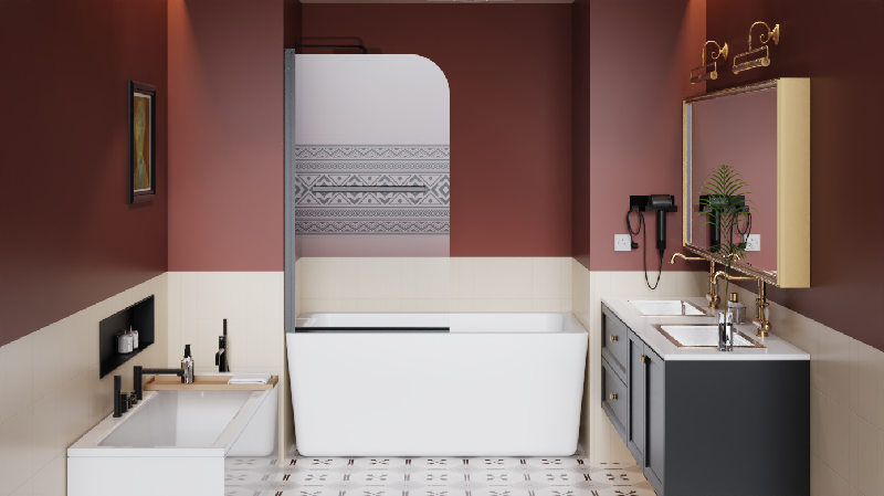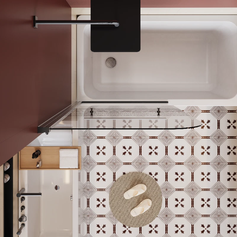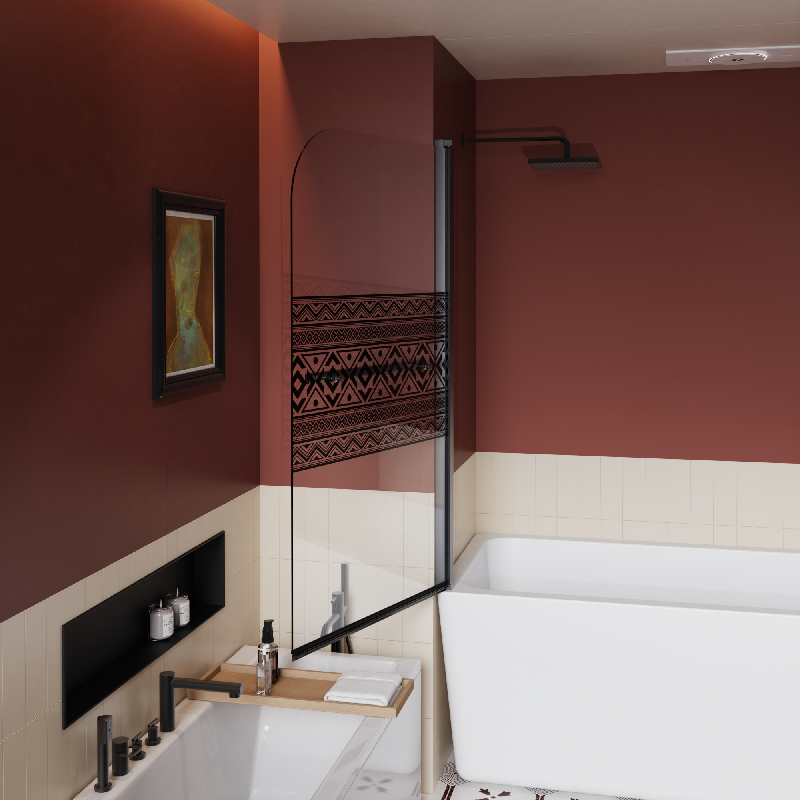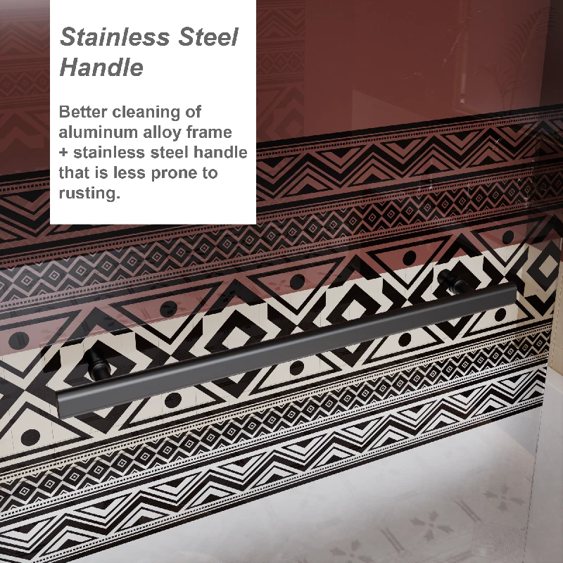 Features and Details: 【Special Design】 Bohemian pattern design with high temperature ink screen print. Add unique style to your shower space while providing more privacy compared to regular glass. 【Size】- 31.5" x 55" (80cm x 140cm). Suitable for most standard bathtubs. The frameless design is simple and stylish, enhancing the aesthetics of your bathroom and space saving. 【Certified Safety Glass】 - Prioritize safety with our door featuring 1/4" tempered glass certified by SGCC standards. This glass minimizes the risk of breakage, creating a secure bathing space. Its stain-resistant and easy-to-clean properties add to its durability and user-friendly design. 【Functional】 -High quality stainless steel handles and screws, beautiful design, functional and practical, with excellent rust and corrosion resistance, especially suitable for wet bathtub environment. Also you can place towels on the handles, convenient for your bathing. 【Sturdy Alloy】- Durable hardware,zinc alloy material, sturdy and corrosion-resistant, ensures smooth working of the pivot system. Aluminum frame is durable and long lasting for years. 【Reversible Installation for Flexible Layout】: The shower screen is equipped with a 180-degree pivoting hinge, making it easy to get in and out of the bathtub. Designed for versatility, this shower screen allows both left-fixed, right-sliding or right-fixed, left-sliding configurations. Specification: Color: Matt Black Material: Stainless Steel Dimensions: 32"L× 0.25"W×55" H Product Weight (lbs.): 41.8