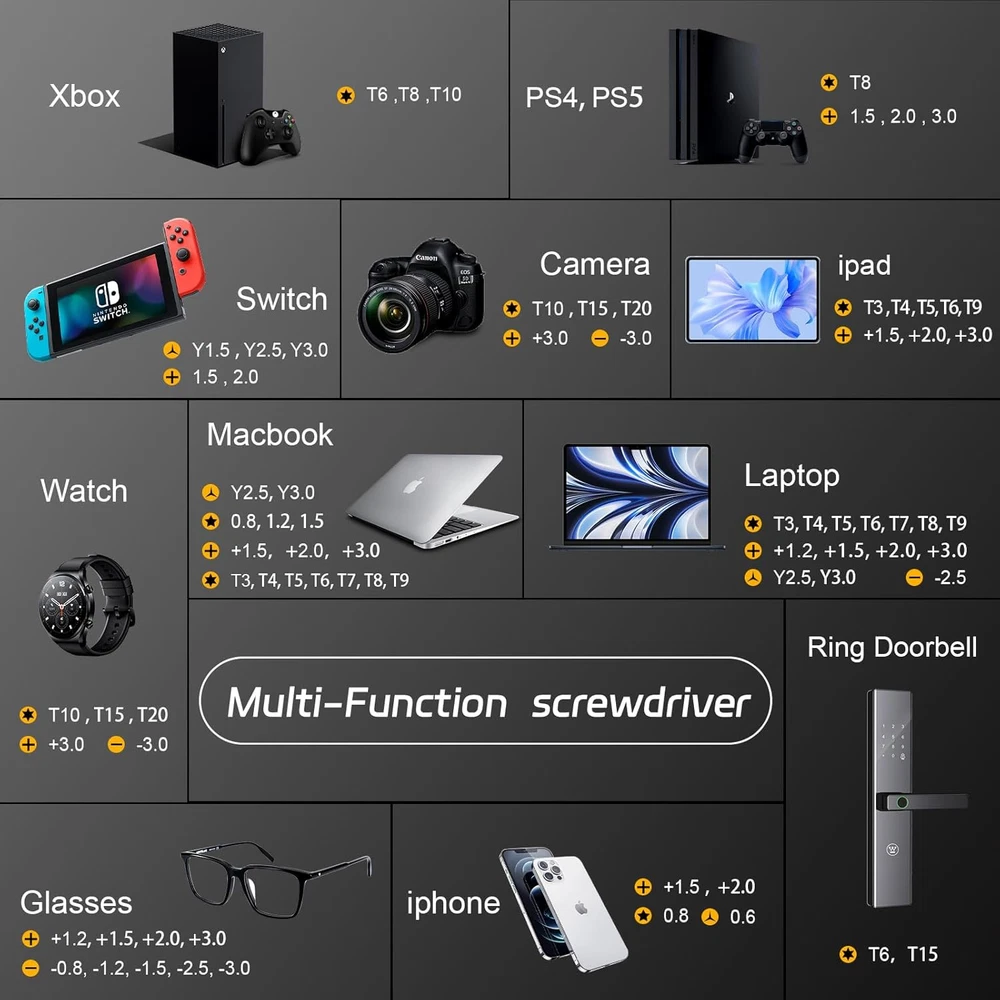【Portable and lightweight】Unlike conventional screwdrivers, this screwdriver adopts a hidden storage design, and the compact handle carries 32 commonly used screwdriver bits. The handle is made of aluminum alloy, weighs only 67 grams, and can be placed in your pocket like a pen. 【Magnetic storage】 The magnetic storage slot design is used to easily absorb and store screwdriver bits and prevent the bits from being lost. The matching velvet bag is convenient for storing and protecting the screwdriver, making it easy to carry when going out. It also comes with a double-ended spudger for convenient work. 【S2 Steel and Magnetic Design】 The screwdriver bits are made of high-quality S2 steel, making them harder and more durable than silver CRV bits. The handle head adopts a magnetic design, allowing you to easily replace the screwdriver bit. The screwdriver bit also adopts a magnetic design, which can absorb and fix small screws. 【32-In-1 Precision Screwdriver Set】 Includes: Philips PH000 (+1.2) PH000 (+1.5) PH00 (+2.0) PH0 (+3.0); Flathead -0.8 -1.2 -1.5 -2.5 -3.0; Torx T1 T2 T3 T4 T5; Torx Security TR6 TR7 TR8 TR9 TR10 TR15; Tri-point Y000 (Y0.6) Y00 (Y1.5) Y0 (Y2.5) Y1 (Y3.0);Pentalobe P2(0.8) P5(1.2) P6( 1.5); Hex H1.5 H2.0 H2.5 H3.0; MID 2.5. 【Wide range of applications】 Suitable for iPhone7/8/X/XR/11/12/13, Samsung/Huawei/Xiaomi and other mobile phones; iPad/Mini/Air/Pro and Huawei/Honor and other tablets; Macbook/Air/Pro ; Kindle/Kindle Fire; Ring Video Doorbell/Video Doorbell 2/Pro/Elite; Repair of some parts of precision equipment such as model aircraft and drones. The screwdriver set is a really good helper for life and work.