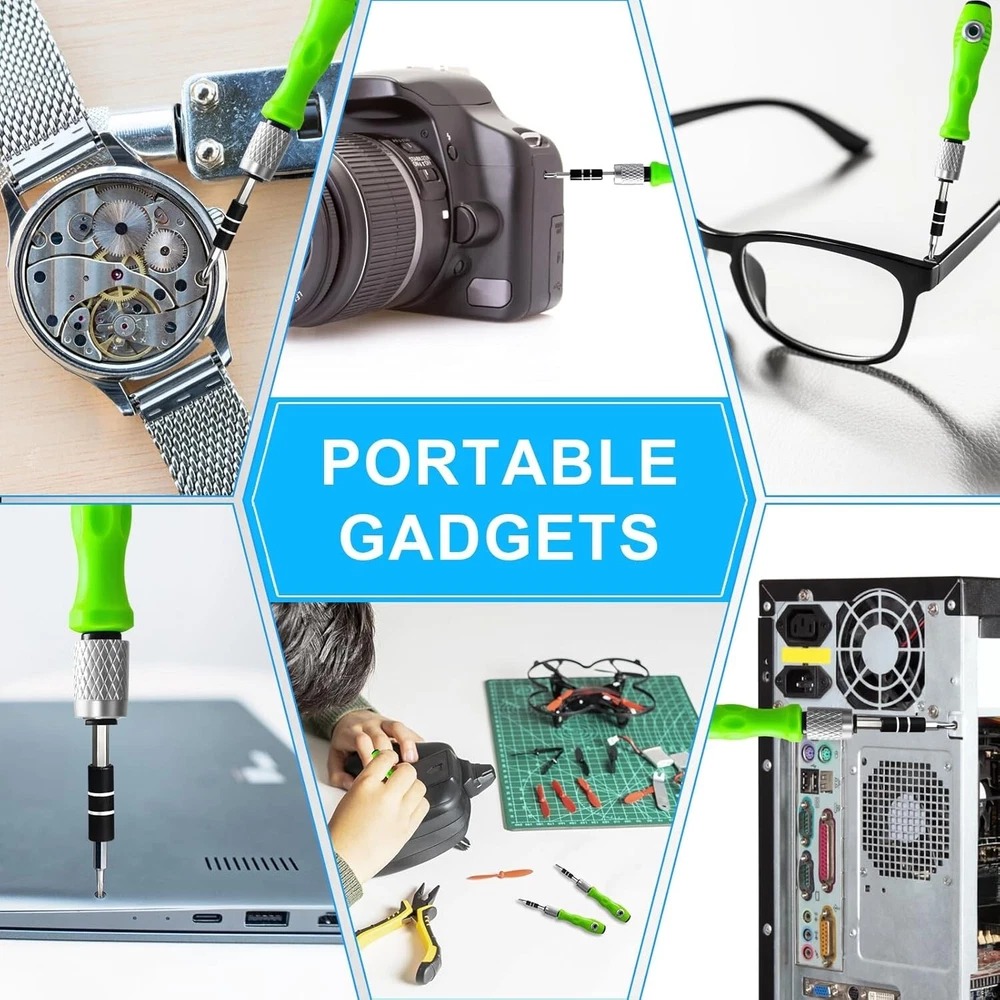 About this item Family must-have : Every family has watches, mobile phones, glasses, toys, computers, jewelry, electronic devices, etc. Similarly, every home and office has at least two screwdriver sets, which is part of your work and life. You can use them yourself or give them as presents to relatives, friends or colleagues Green handle: Green grass, green forest, green always brings wonderful visual enjoyment. The green handle is light and non-slip, ergonomically designed, and can be used horizontally or vertically. The plastic head adopts forward and backward push motion and rotatable design Screwdriver bits: 30 screwdriver bits are premium CR-V chrome vanadium steel, with phillips PH000 PH00 PH0 PH1 PH2, slotted -1.5 -2.0 -2.5 -3.0 -4.0, torx T4 T5 T6 T8 T9 T10, hexagon H1.5 H2.0 H2.5 H3.0 H3.5 H4.0, triangle 2.0 2.3, triwing Y2.0 Y3.0, pentagon 0.8 1.2 2.0, U-type 2.3, each screwdriver bit has magnetic adsorption, which can quickly replace the screws Extension rod: The extension rod is divided into 3 equal sections. The extension rod can be directly inserted into the horizontal handle for use, or the handle can be pressed in the opposite direction and then inserted into the vertical handle for use. It can be long or short and is used for screws in narrow spaces. The head of the extension rod is equipped with a black metal head with magnetic adsorption, which can quickly replace the screwdriver bits Convenient packaging: You can see 30 upright screwdriver bits through the lid of the transparent plastic storage box, allowing you to quickly find the screwdriver bits you want, open it with one button when you need it, and close it with one button when you are done, saving time and effort