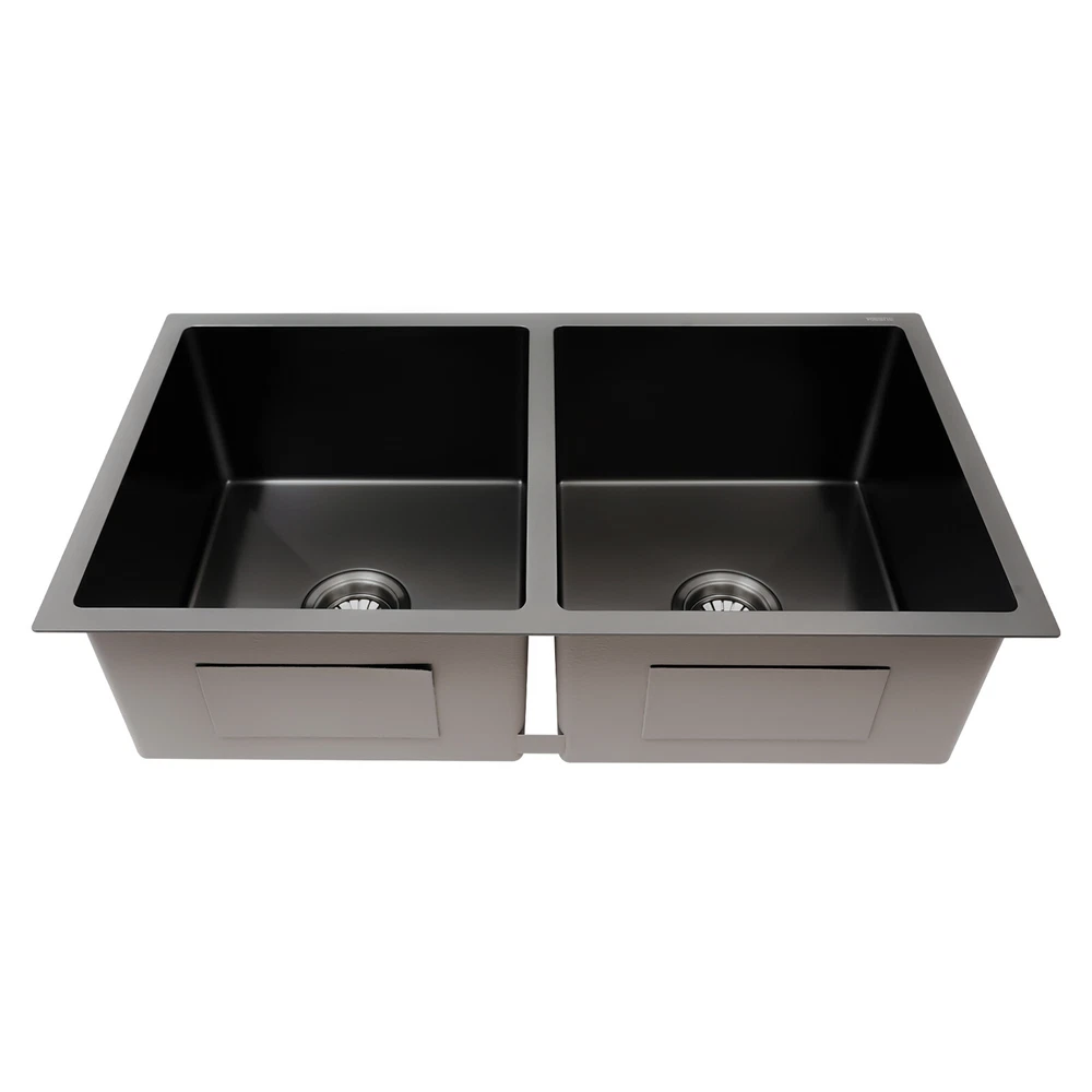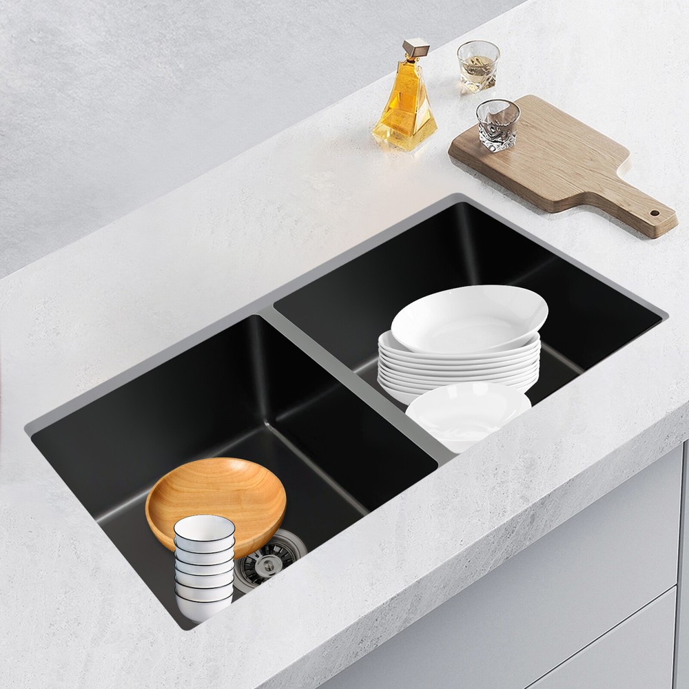 Specifications Material: 304 Stainless Steel, Rubber Color: Black Assembly Requirements: Yes Process: Brushed, Blackening Style: Modern Stainless Steel Thickness: 3mm/0.12in Number of Bowls: 2 Gross Weight: 12kg/26.46lbs Single-bowl Size: 36.83*40.64cm/14.5*16in Overall Product Size: 81.28*45.72*22.86cm/32*18*9in Pakage Size: 85*54*28cm/33.46*21.26*11.02in 32"x18'' Drop-in Double Bowl Basin Kitchen Sink Black With Filter Baskets Welcome to our store^-^ Description This 304 stainless steel sink is made of high-quality material and adopts excellent brushed and blackening workmanship, making it hard-wearing and corrosion-resistant . Its enlarged and deepened 2 sinks not only reduce water splashing, but also increase the space for cleaning a lot of cookware. With it, you can enjoy a more convenient life. Key Features Build to Last: It is made of high-quality 304 stainless steel with brushed and blackening processes, s o it has good corrosion resistance , oxidation resistance an d strength. It can be used in wet environments such as the kitchen and laundry room. Large Capacity : You can put a large number of dishes in 2 bowls of 32*18*9 inches, making it more comfortable and efficient for you to clean. So it is a great helper for you to clean dishes or prepare food. Good Sealing : The connection between the downpipe and the drain is fitted with high-quality connectors and rubber seals, adding to its good sealing to avoid leaks. Separate Cleaning : 2 separate bowls are equipped with separate downpipes, so they can be used independently. You can wash different dishes and vegetables at the same time without interfering with each other. Effortless Cleaning: The stainless steel surface is brushed, so it is very smooth. Therefore, you only need to wipe it with a soft cloth to keep it neat and tidy. Easy to Assemble : The complete range of mounting parts and the simple construction of the product allow you to install it quickly and accurately in a short time. Thoughtful Design: We use high-quality stainless steel filters, which are corrosion-resistant a nd can be used for a long time. And it collects food and debris, preventing debris from clogging the pipes thus saying goodbye to unpleasant smells. It is equipped with an acoustic insulation system that includes a protective coating and an eco-friendly rubber mat that reduces the harsh sound of running water or the echo of falling cutlery. Modern and Simple: The low-key and luxurious black color, delicate connections, and smooth streamlines give this sink set a modern and simple appearance, which fits most household styles. Quality Service: We are honored that you have chosen our product. We have sufficient confidence in the quality of the product so that you can buy it confidently. But if you have any questions, you can contact our customer service, he will patiently answer and solve your problems. Details Thickened Panel: The 3mm thickened panel can provide better support and load-bearing force for the sink. X-shape Diversion Line: It can help guide and accelerate the water-flowing speed and keep the sink bowl dry and clean when not in use. Arcs Shape: The rounded and smooth edges not only add to the aesthetics of the product but also improve the safety of use. Application This product can be widely used in homes, restaurants, laundry rooms, basements, bars, kitchens, food trucks, dessert shops, coffee shops, hotels, garages, gardens, pet shops, etc. for cleaning tableware, vegetables, fruits, pets, etc. Specifications Material: 304 Stainless Steel, Rubber Color: Black Assembly Requirements: Yes Process: Brushed, Blackening Style: Modern Stainless Steel Thickness: 3mm/0.12in Number of Bowls: 2 Gross Weight: 12kg/26.46lbs Single-bowl Size: 36.83*40.64cm/14.5*16in Overall Product Size: 81.28*45.72*22.86cm/32*18*9in Pakage Size: 85*54*28cm/33.46*21.26*11.02in Package Included 1* 304 Stainless Steel Sink 2*Filter Baskets 2*Sealing Rings 2* Connection Hoses Notes Please check the size carefully before ordering. Please do not scratch its surface with sharp objects to obtain a longer service life. If you want to get a better installation result, we recommend that you hire a professional plumber to install it. Please allow the slight color difference caused by the shooting light and 1-3cm error due to manual measurement, and make sure you do not mind before you order. Payment Delivery details Terms of sales About us Contact us Payment We accept ebay payment 。 Fees such as import duties, taxes are not included in the item price or shipping costs. These charges are the buyer's responsibility. Delivery details Shipping: 2-9 working days to: USA Terms of sales We maintain high standards of excellence and strive for hundred percent customer satisfaction. Feedback is very important to us. We hope that you contact us immediately before you give neutral or negative feedback, so that we can address your concerns. It is impossible to address issues if we do not know about them! About us Your satis faction is our ultimate goal. We work hard to earn your trust and future business. Our certified technicians have tested each item before shipping. The unit comes with 1 year limited warranty on all manufacturing defects. a) If you receive a defective item, you may return it or ask for a discount. Please contact us within 14 days after you receive the package. b) What you returned must be intact and in its original packaging as re? u. Customer is responsible for shipping costs of the returned item. c) We will cover the cost of shipping back t with the shipping rate indicated in the registration page. We will send you a new unit or refund the full payment you paid. Thank you. Contact us Business Hour Business Hour: Monday To Friday: 8:30 AM to 5:00 PM (Beijing China time) Due to time zones, our reply to your questions may not be immediately. But within above working time, we will reply your email within 24 hours. If it's non-workdays, please kindly be patient and wait ti